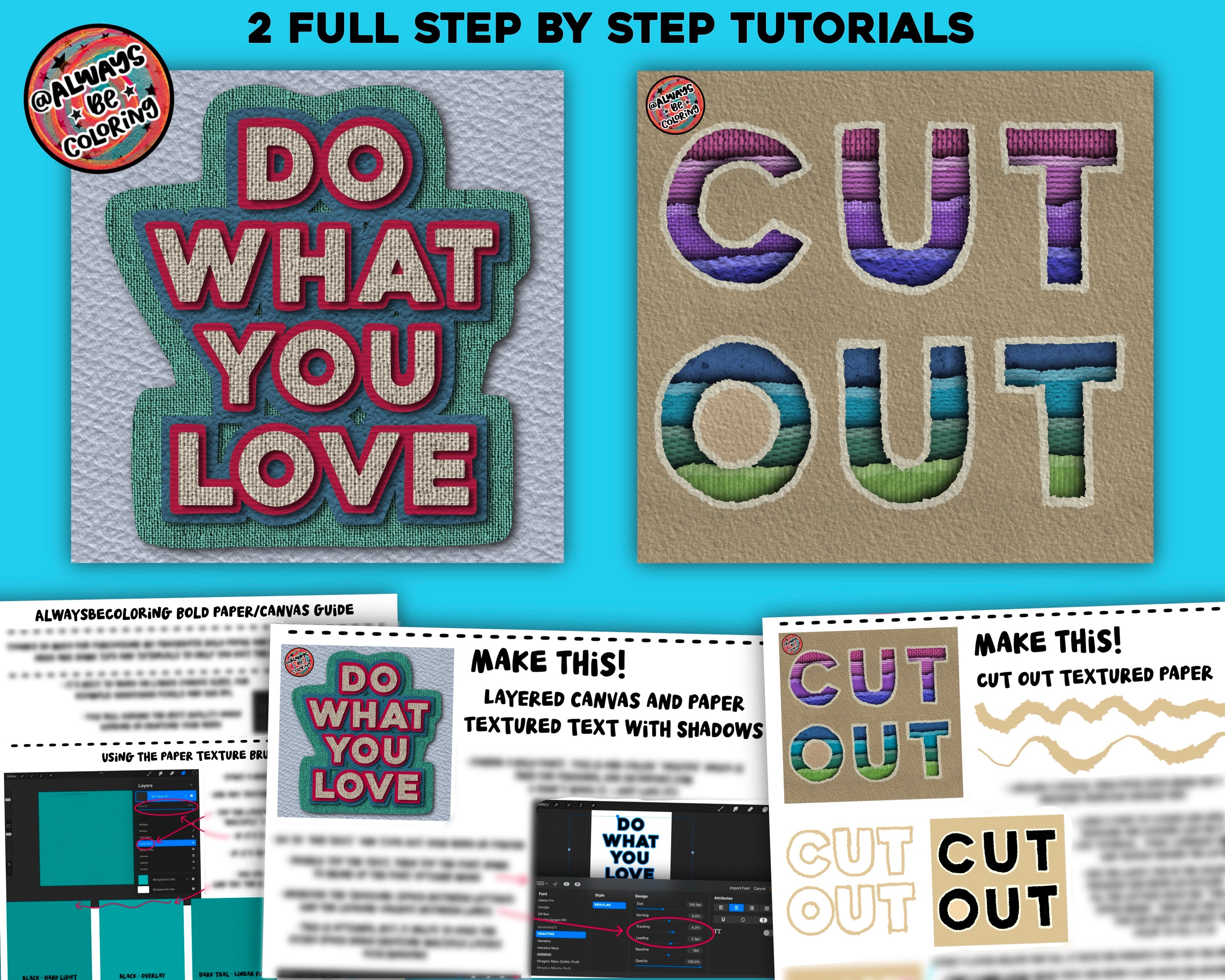 80 all new BOLD Canvas and Paper Procreate Seamless Texture Brushes! High Quality Seamless Texture Brushes to add a Realistic touch to your digital artwork with just one brush stroke! Plus a User Guide with 2 Detailed Step by Step Tutorials for creating an awesome Cut Out Paper look, and for making Textured Layered Lettering with Shadows. With a custom Procreate Color Palette made specially for these tutorials. These brushes are super easy to use and will create Bold textures that really bring your artwork to life! The Set incudes 37 BOLD Procreate Canvas Texture Brushes, 30 BOLD Watercolor Texture Brushes and 12 BOLD Kraft and Construction Paper Texture Brushes.