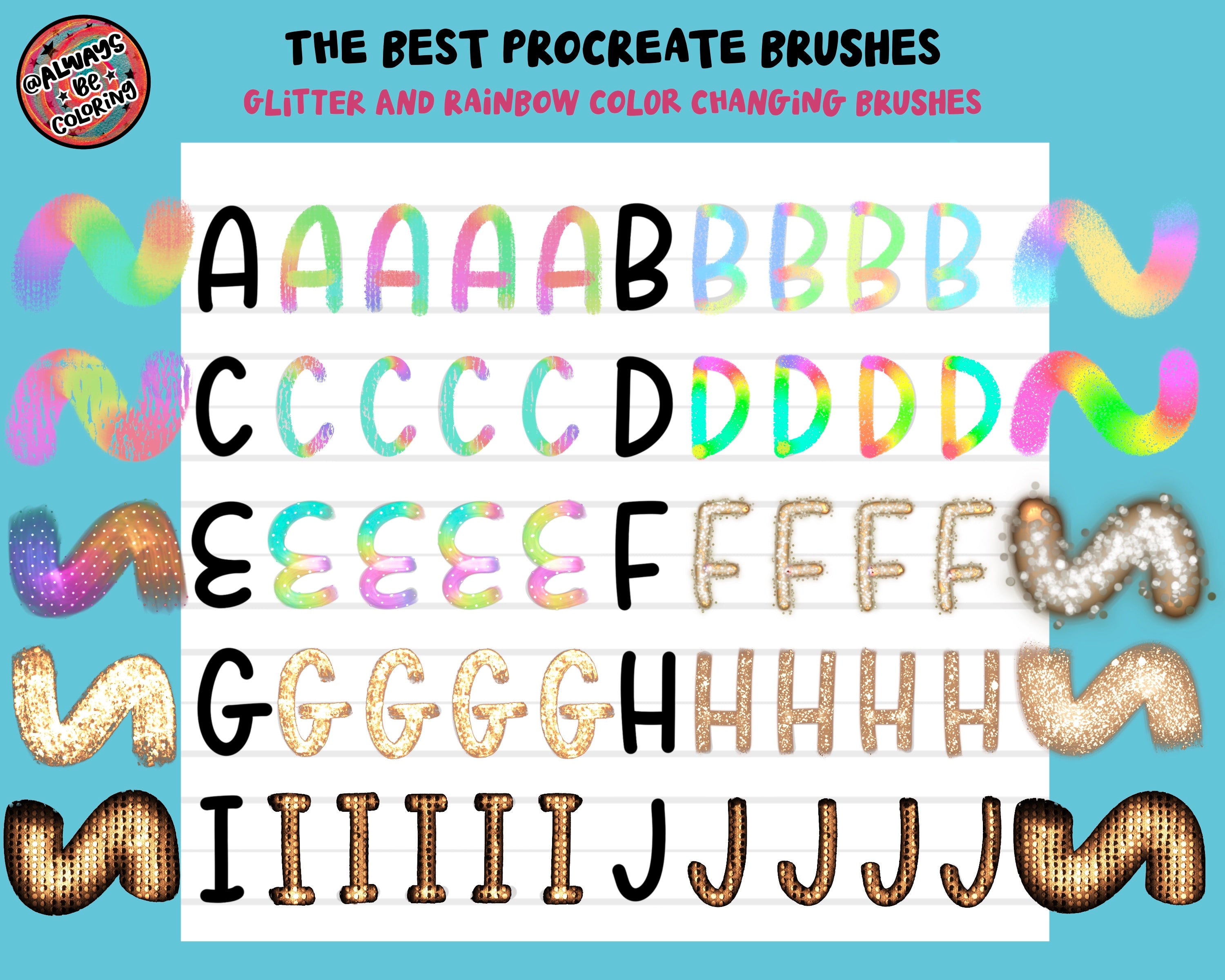 • 25 Unique Procreate Brushes including textured Lettering Brushes, Glitter Brushes, and Rainbow Color Changing Brushes