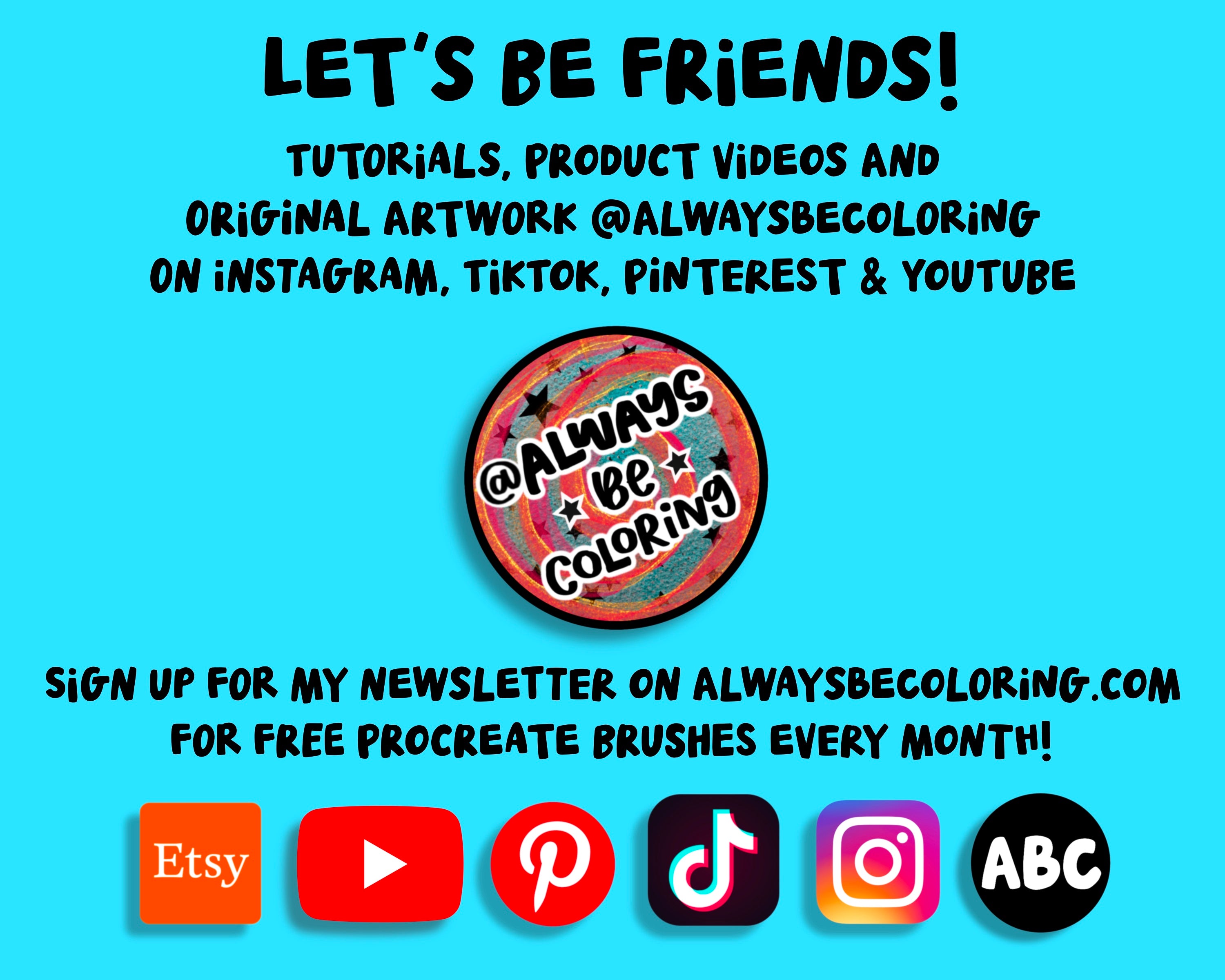 All rights remain with Amy Frierson - AlwaysBeColoring copyright 2025. The worksheets in this set are for personal use only! Please do not resell them or share them in any way. You can use the brushes to make your own designs for personal and commercial use. However, the brushes and brush files cannot be duplicated, shared, copied, or redistributed in any way, as is or altered! You cannot claim these files as your own. You cannot sell any of the designs in the set as individual assets or digital files of any kind. Thank you!