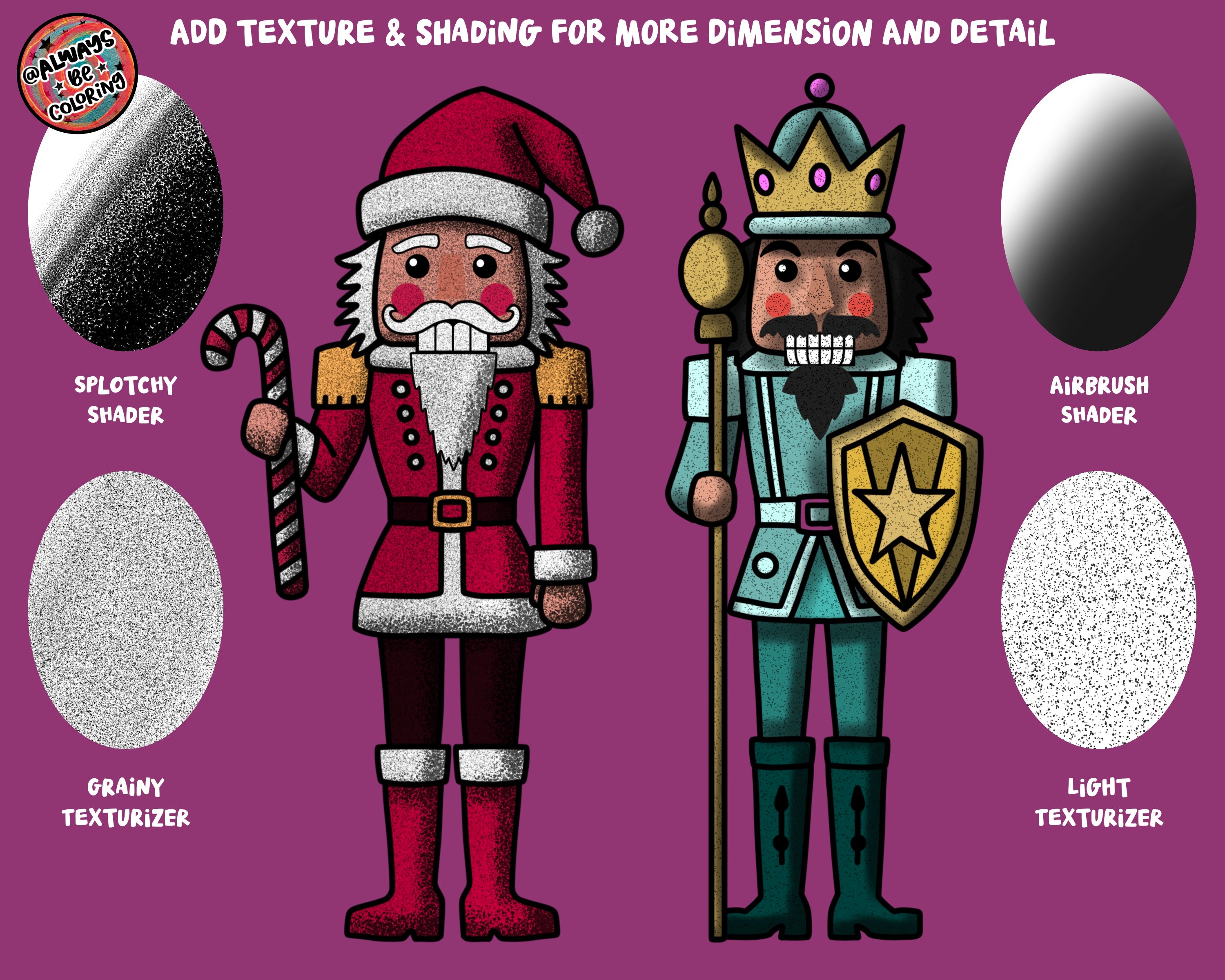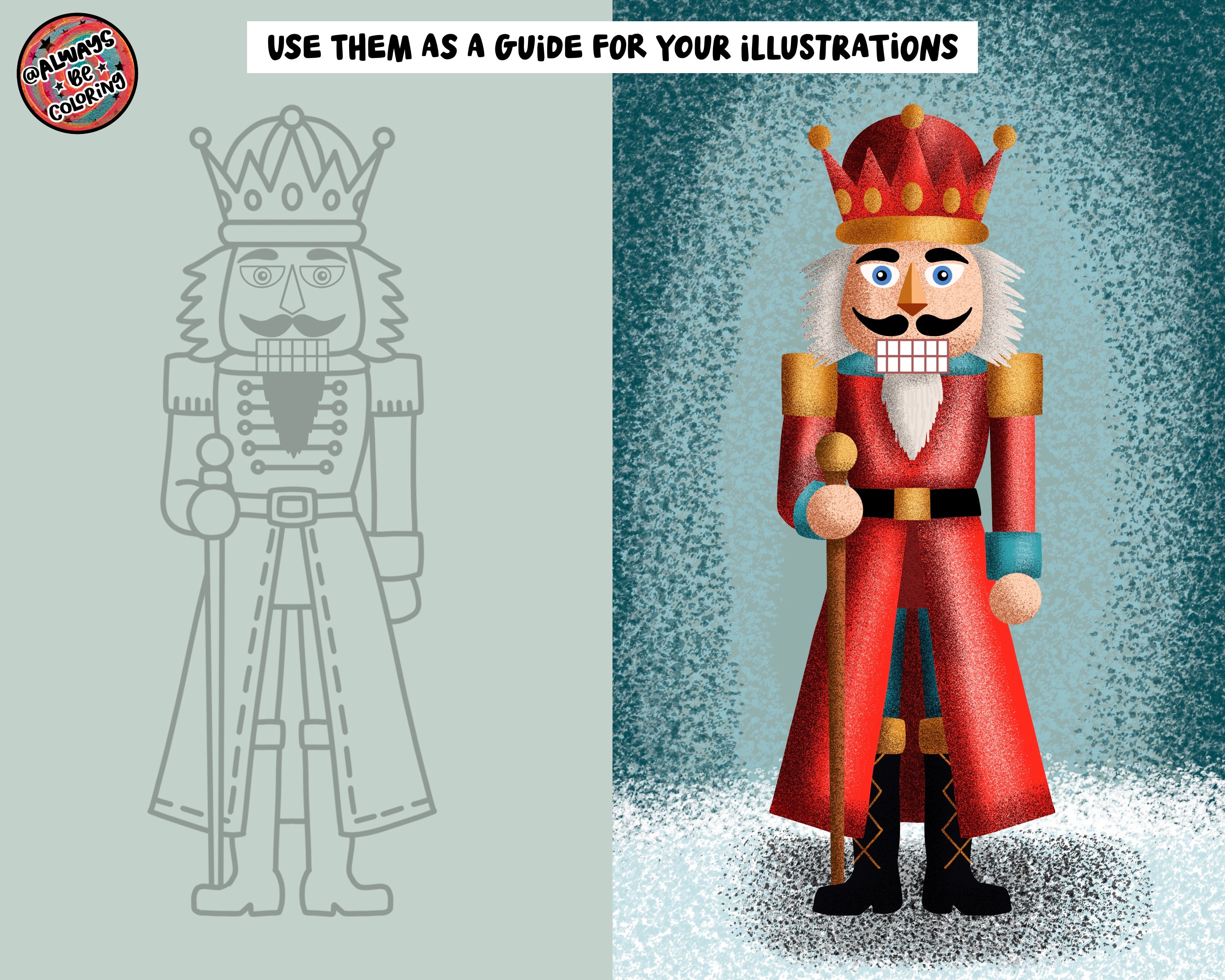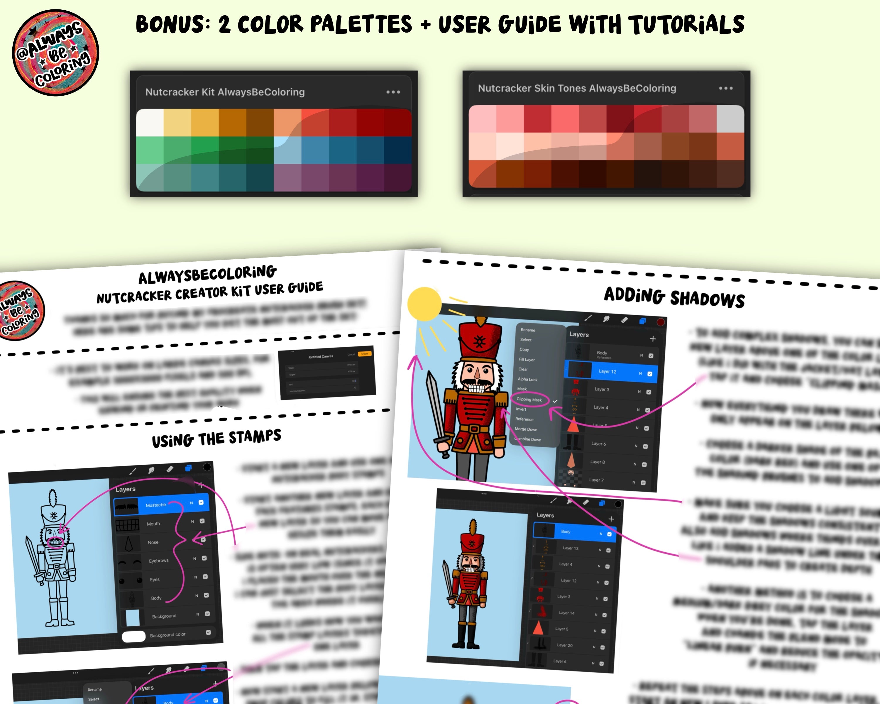 100 Procreate Brushes and Hand Drawn Stamps to easily create your own Nutcracker Characters! Including 12 Nutcracker Body Stamps, Plus Facial Feature Stamps like Eyes, Eyebrows, Noses, Mouths, Mustaches, Beards, Cheeks and Accessories. Mix and match them for endless combinations! You can easily change the colors of the stamps, and drag and drop colors to fill them in. I’ve also included sketching and shading brushes to add detail and dimension to your designs. Plus 3 Procreate Color Palettes and a PDF User Guide with Tips and Tutorials. Make cute personalized Christmas Holiday Nutcracker Crafts, Cards, and Digital Illustrations!