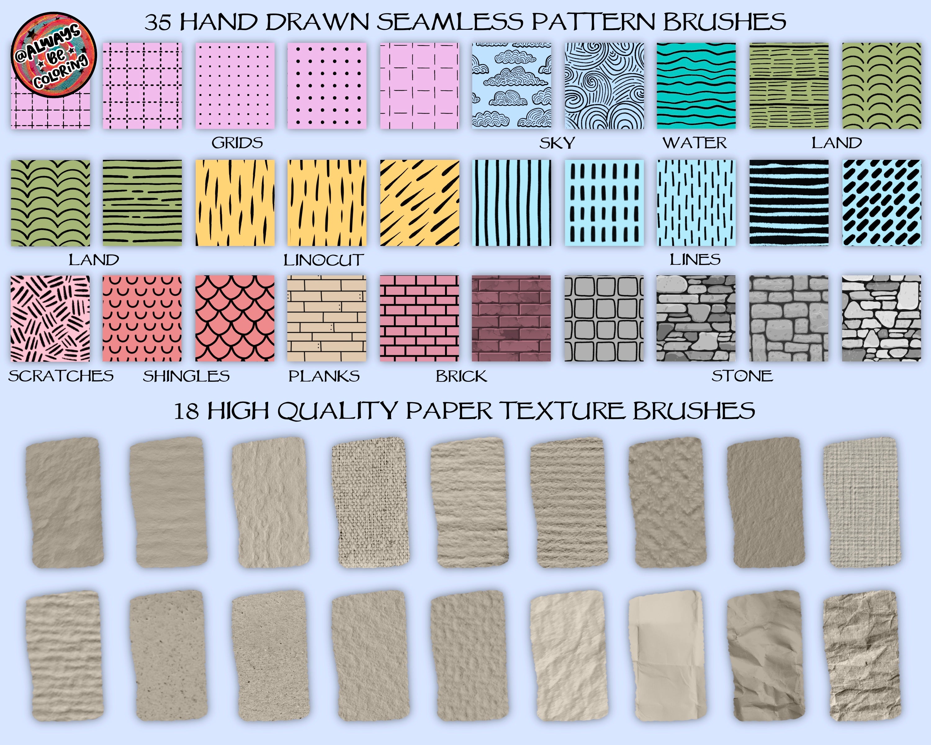 - 36 Pattern Brushes including grids, lines, sky, water, land, shingles, planks, brick and stone