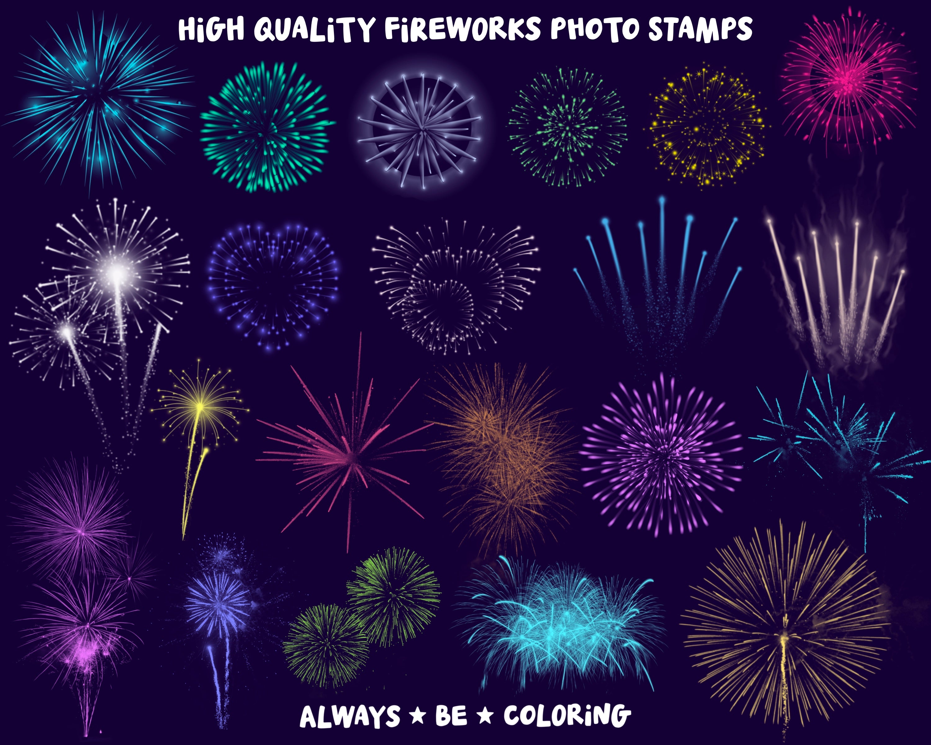 140 New Procreate Fireworks Brushes including 115 Procreate stamp brushes and 25 dynamic fireworks brushes! With color changing brushes, special 2 color stamps, 3 Procreate color palettes and a user guide with tips and tutorials to help you get the most out of the set.