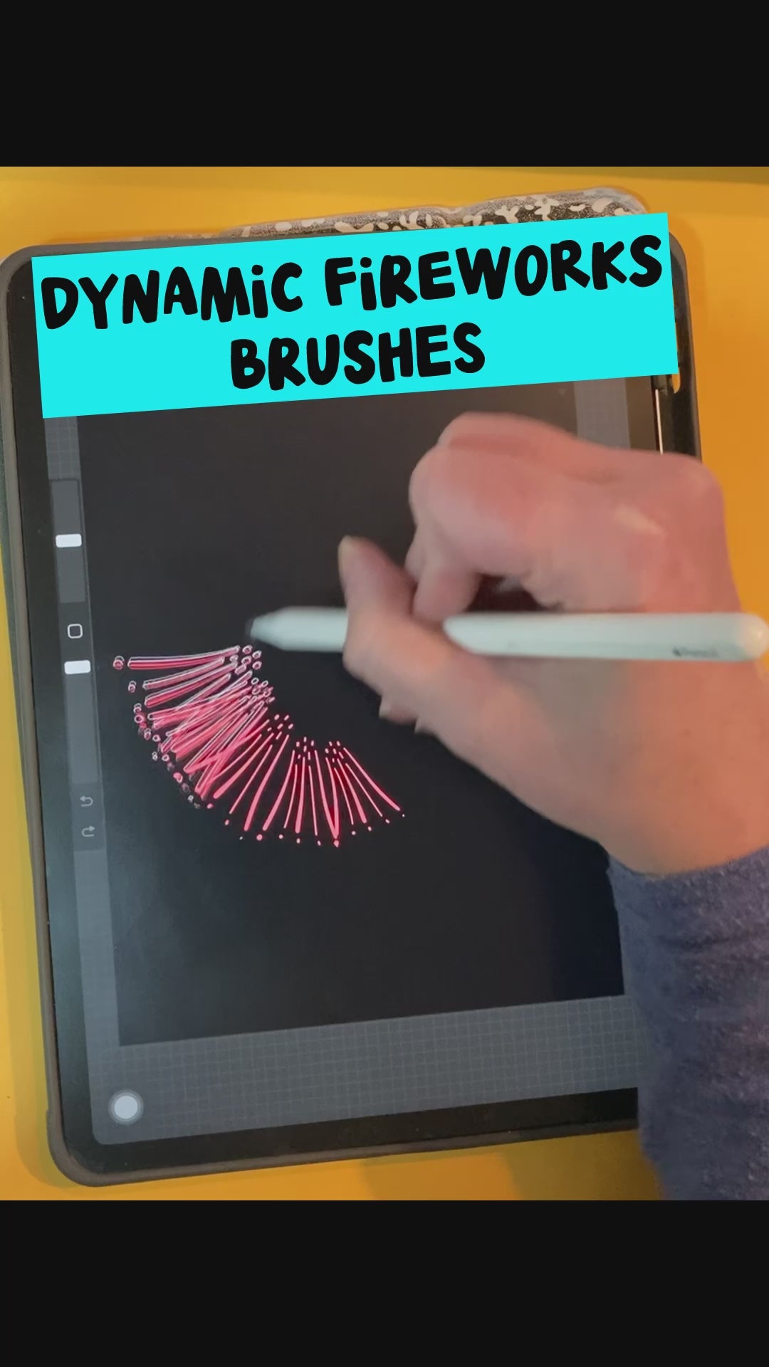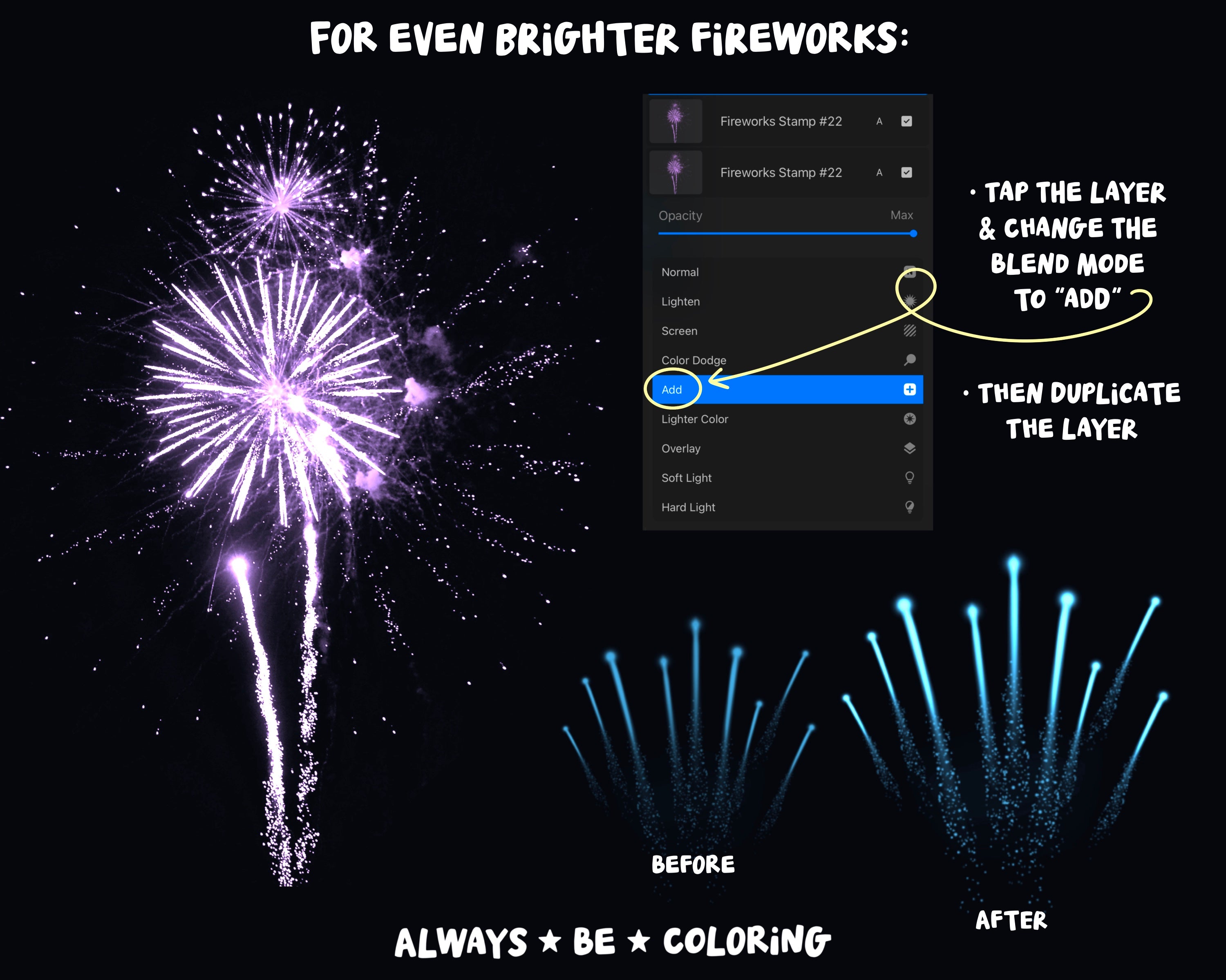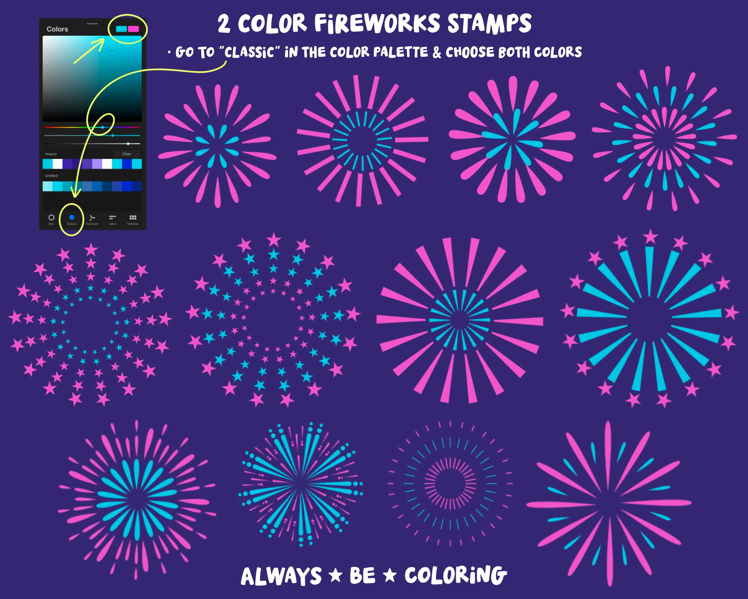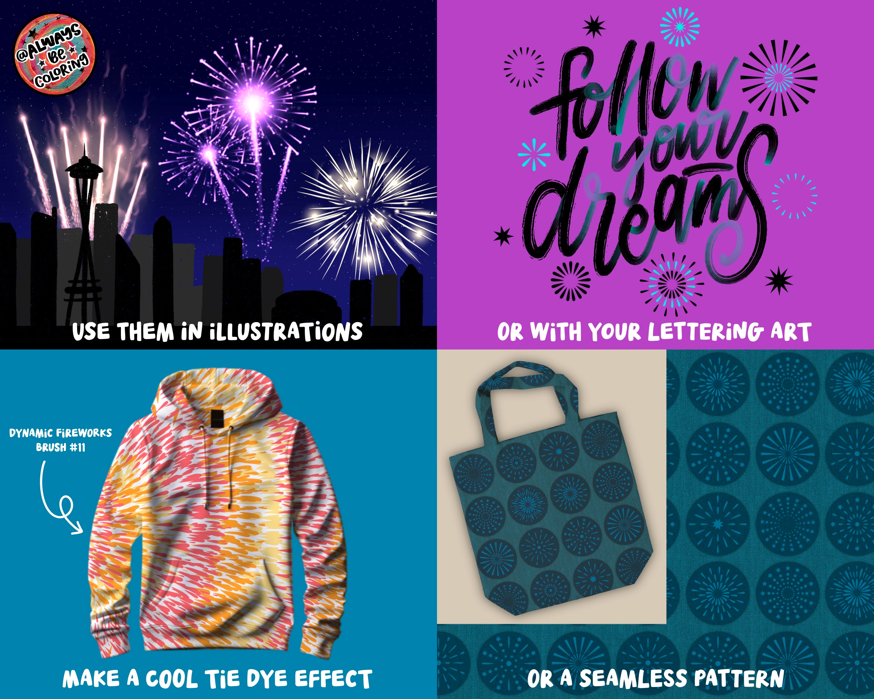 Super unique dynamic brushes allow you to recreate the look of real fireworks by simply drawing in a circle! Layer different colors, or use the color changing brushes and just vary your brush pressure to make beautiful multicolored fireworks. You can also use these brushes to make a cool tie dye effect!
