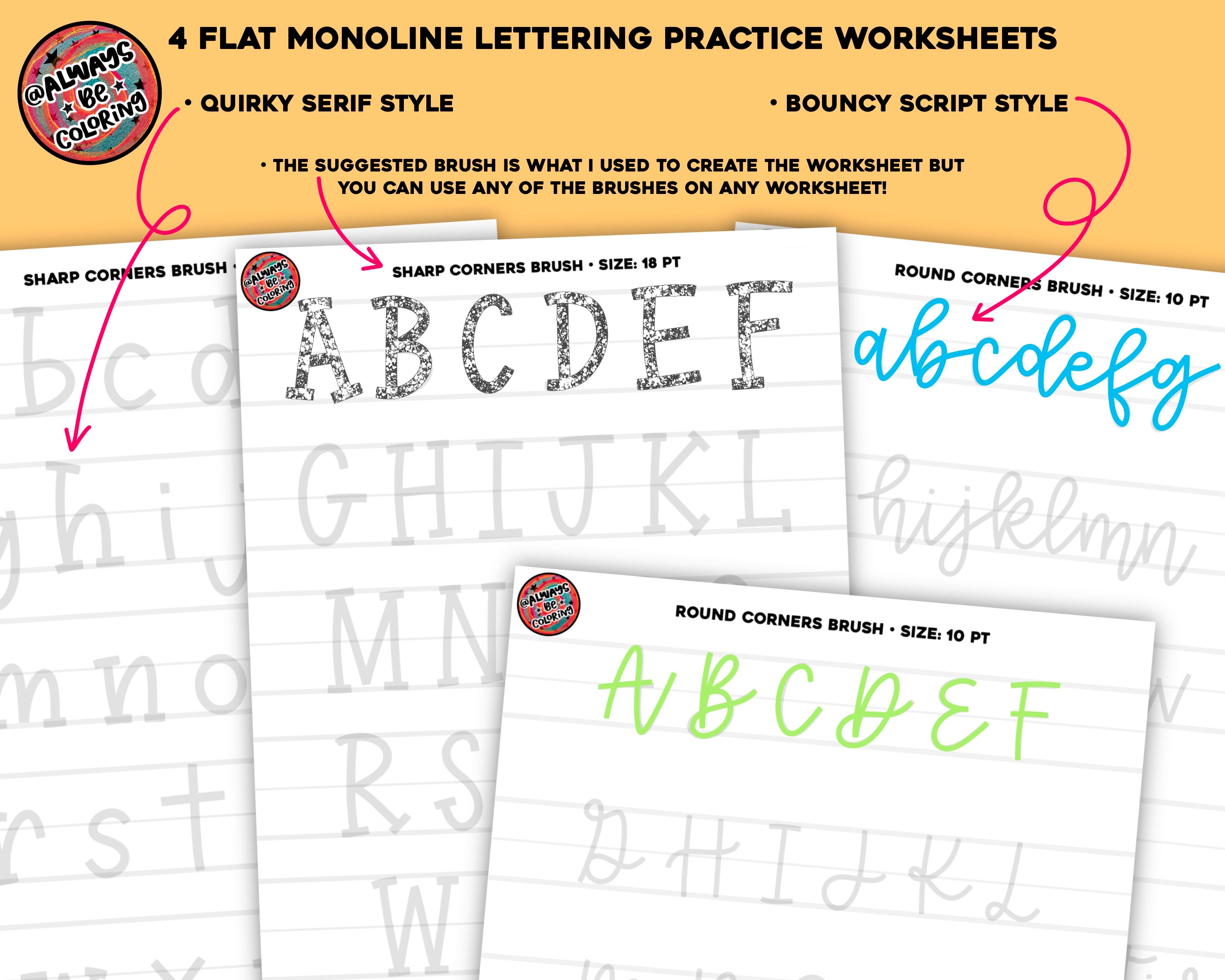 40 Procreate Brushes including 24 Flat Monoline Lettering and Illustration Brushes, 8 Seamless Paper Pattern Brushes with lines and grids, and 8 High Quality Paper Texture Brushes. Plus there are 4 Flat Monoline Lettering Practice Worksheets to use with the new brushes! There are both uppercase and lowercase worksheets with a fun Serif Style and a Bouncy Calligraphy Style as well. The Flat monoline brushes include Basic Brushes, Texture Brushes, Color Changing Brushes and Glitter Brushes. There are Dots and Plaid Pattern Brushes, and even a cool 2 Color Zebra Brush! Each style has a Sharp Corner Version and a Rounded Corner Version with different shaped brushes for slightly different looks. If you’re looking for the perfect Flat Monoline Brushes, this is the set for you! The brushes are tested and streamlined and extremely easy to use.