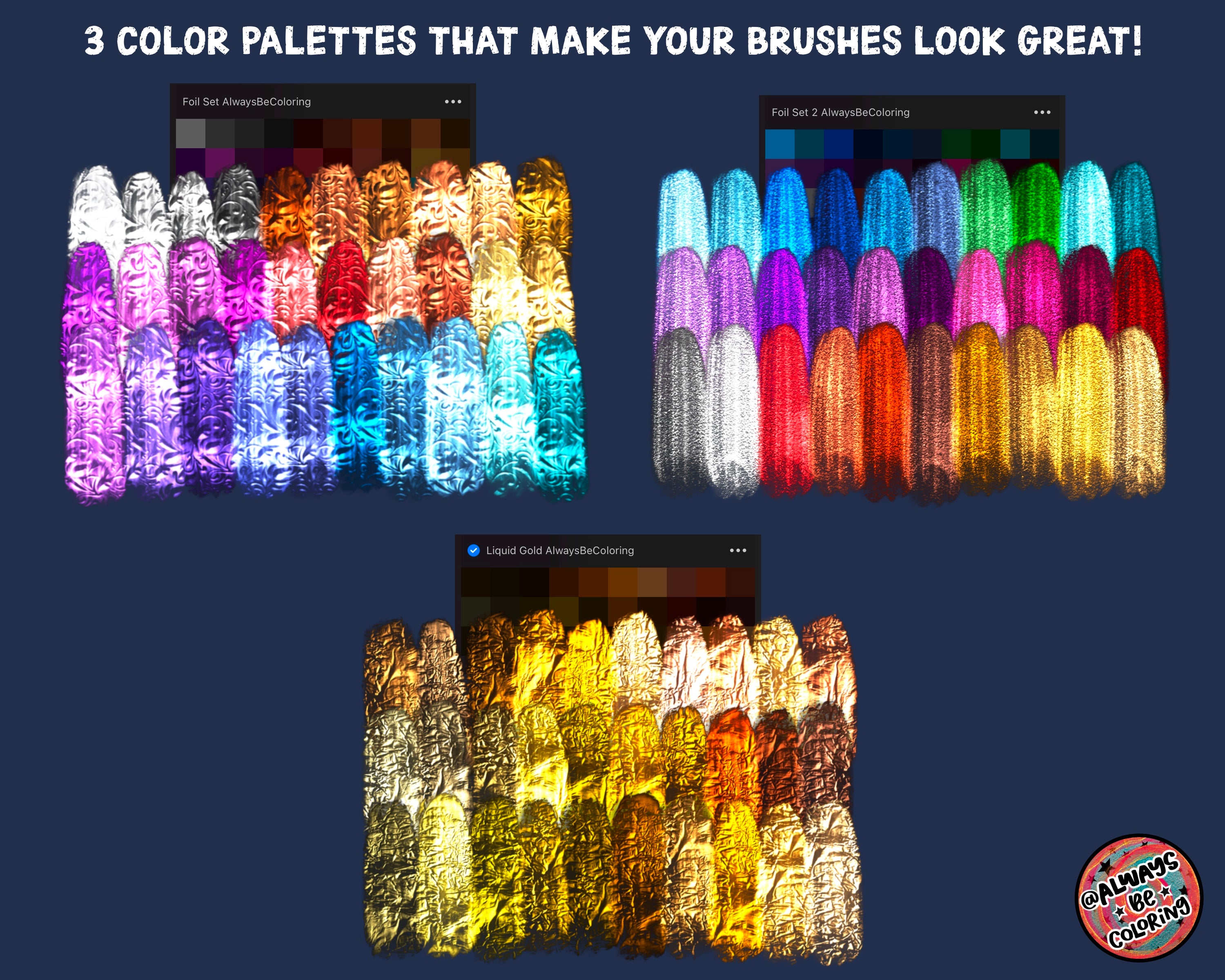 Procreate Foil Brush Set! 50 gorgeous metallic foil lettering brushes and 50 high quality foil texture brushes! Plus 3 color palettes that will make your brushes look great! All brand new textures with a wide variety of cool effects. Some are crinkled and look exactly like tin foil, while others are ornate and decorative. Some are glittery and shiny, some like beautiful gold leaf. You’re going to love the lettering brushes to easily make bold, eye catching art and illustrations. Or use them to create jewelry and other metallic embellishments in your fashion sketches!
