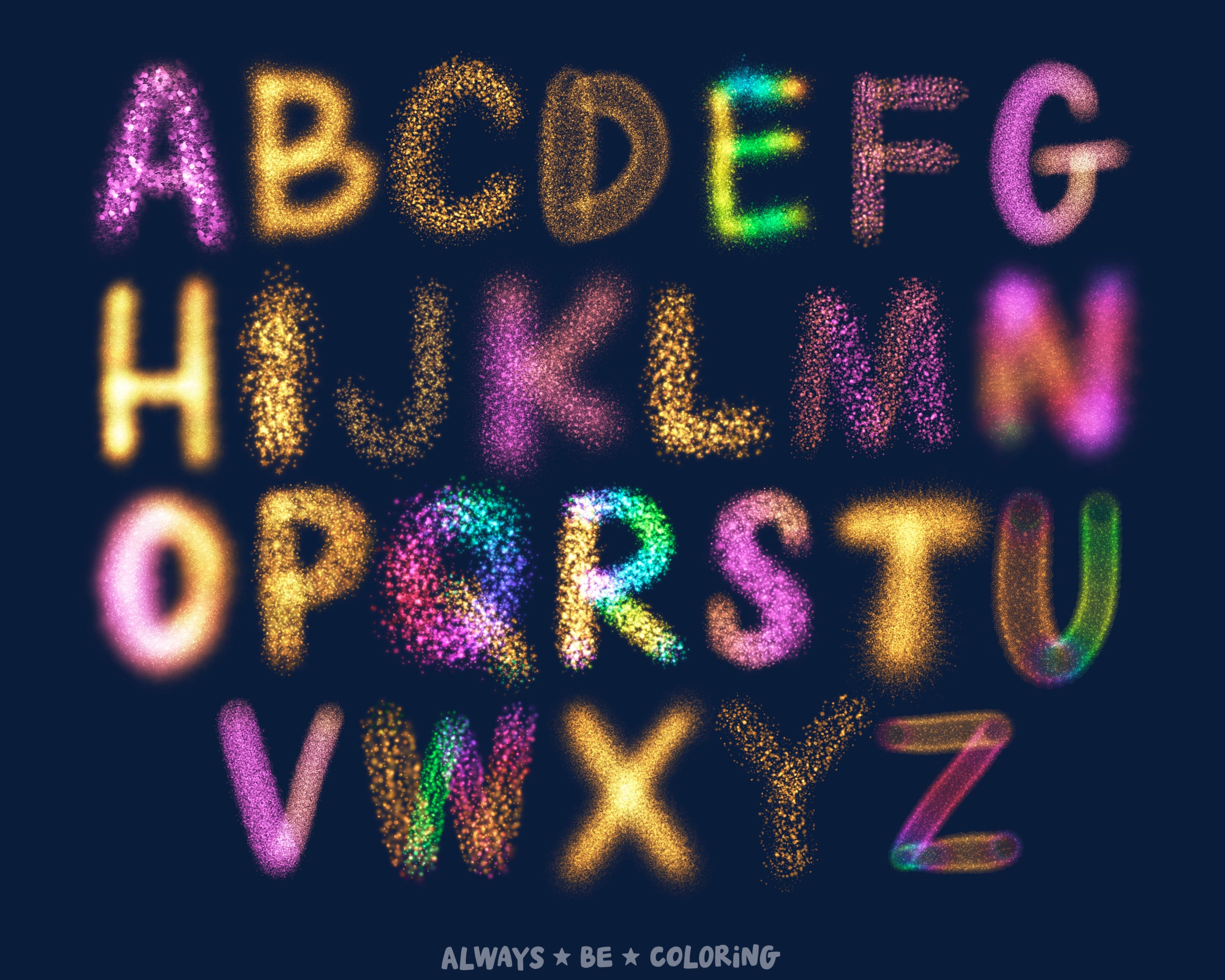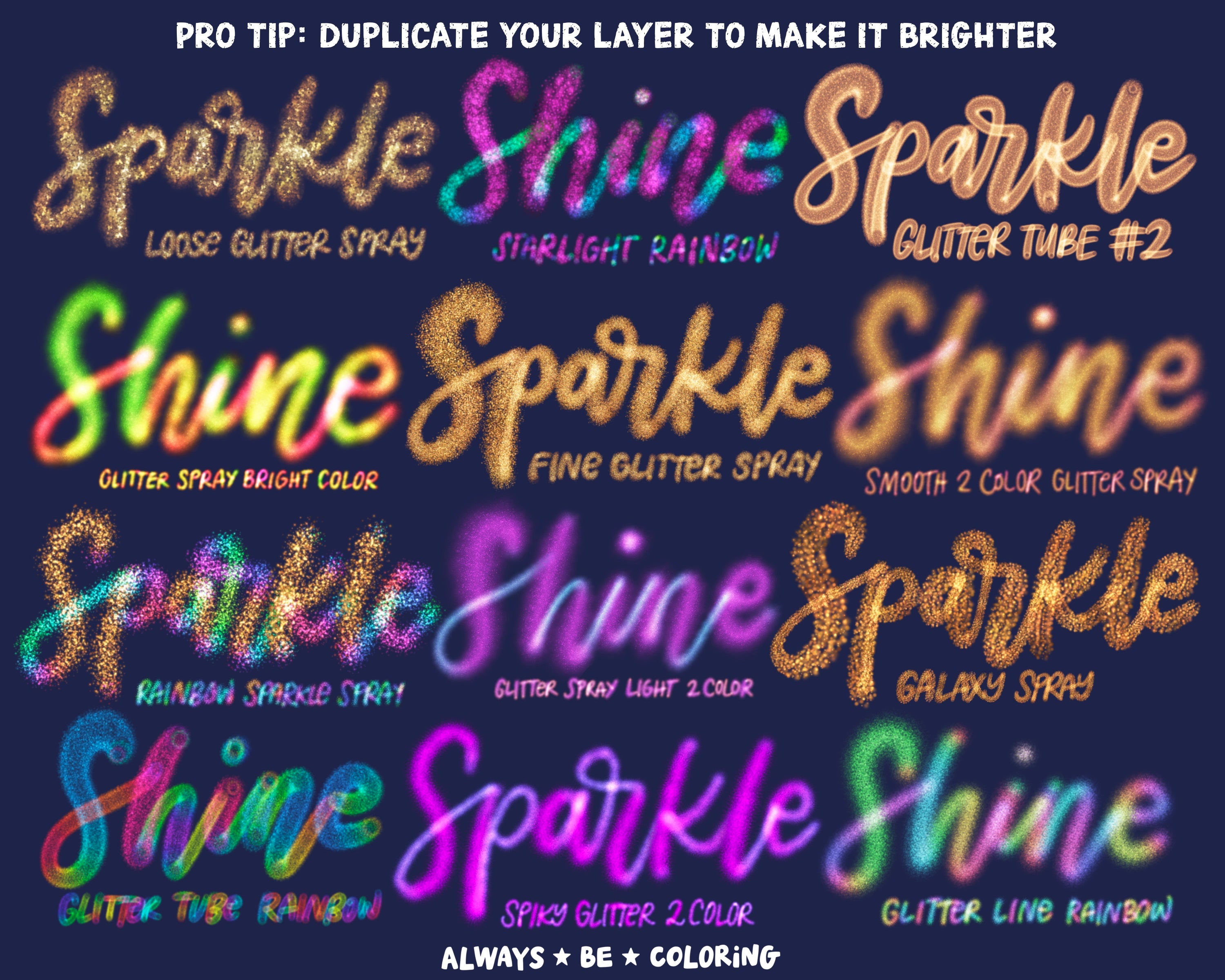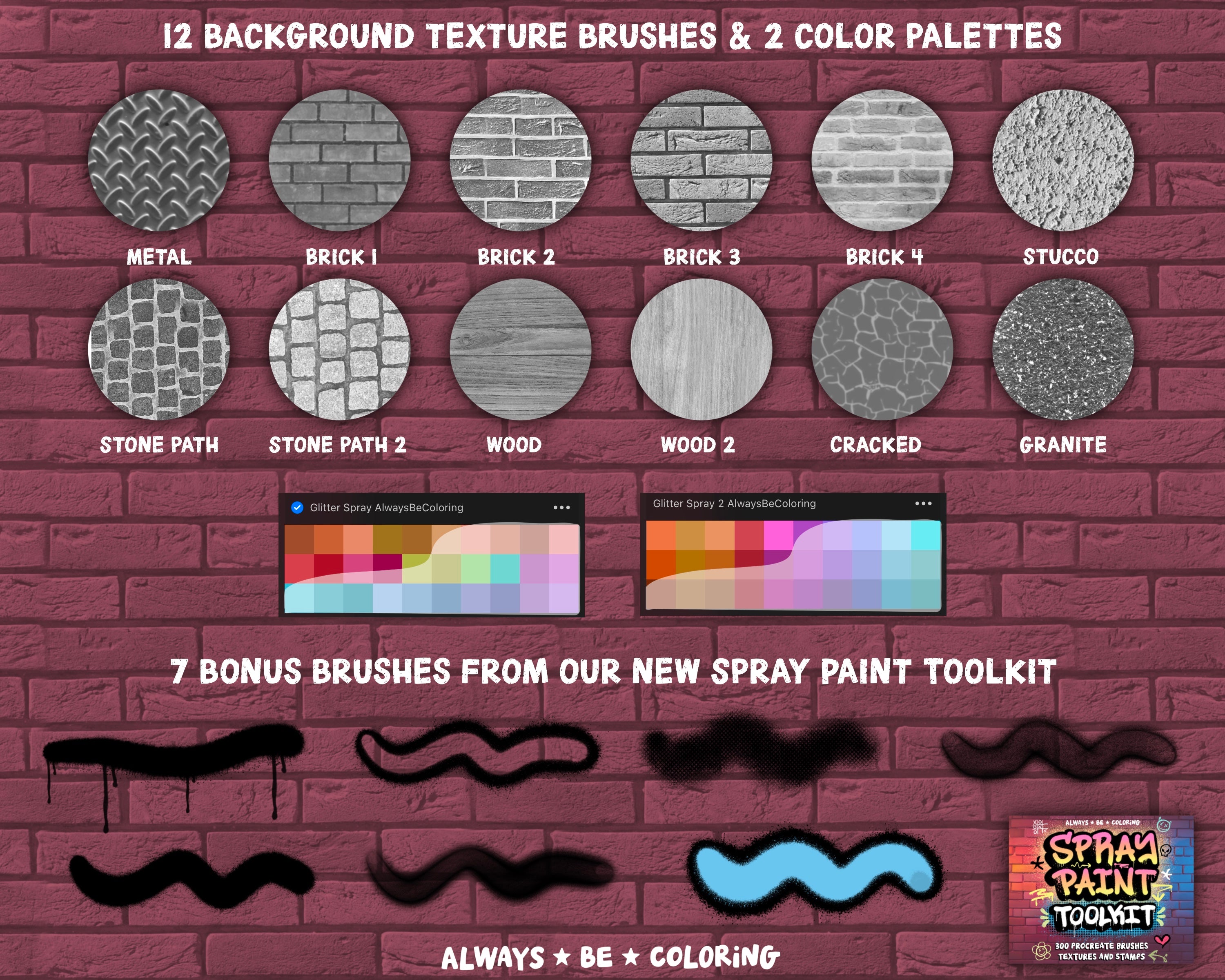 Over 100 Procreate Glitter Spray Paint Brushes with a variety of glitter textures and cool color changing effects! There are 20 core glitter spray paint brushes and each core brush comes with 4 variations: original, color shift, 2 color and rainbow color changing brushes. Color shift, 2 color and rainbow brushes all change color with brush pressure-must have Apple Pencil for all brushes to work correctly! We’ve also included 12 background texture brushes like brick, metal, wood and granite, plus 7 bonus Spray Paint brushes from our new Procreate Spray Paint Toolkit! There are also 2 Procreate Color Palettes, with 60 hand picked colors that make the brushes really pop!