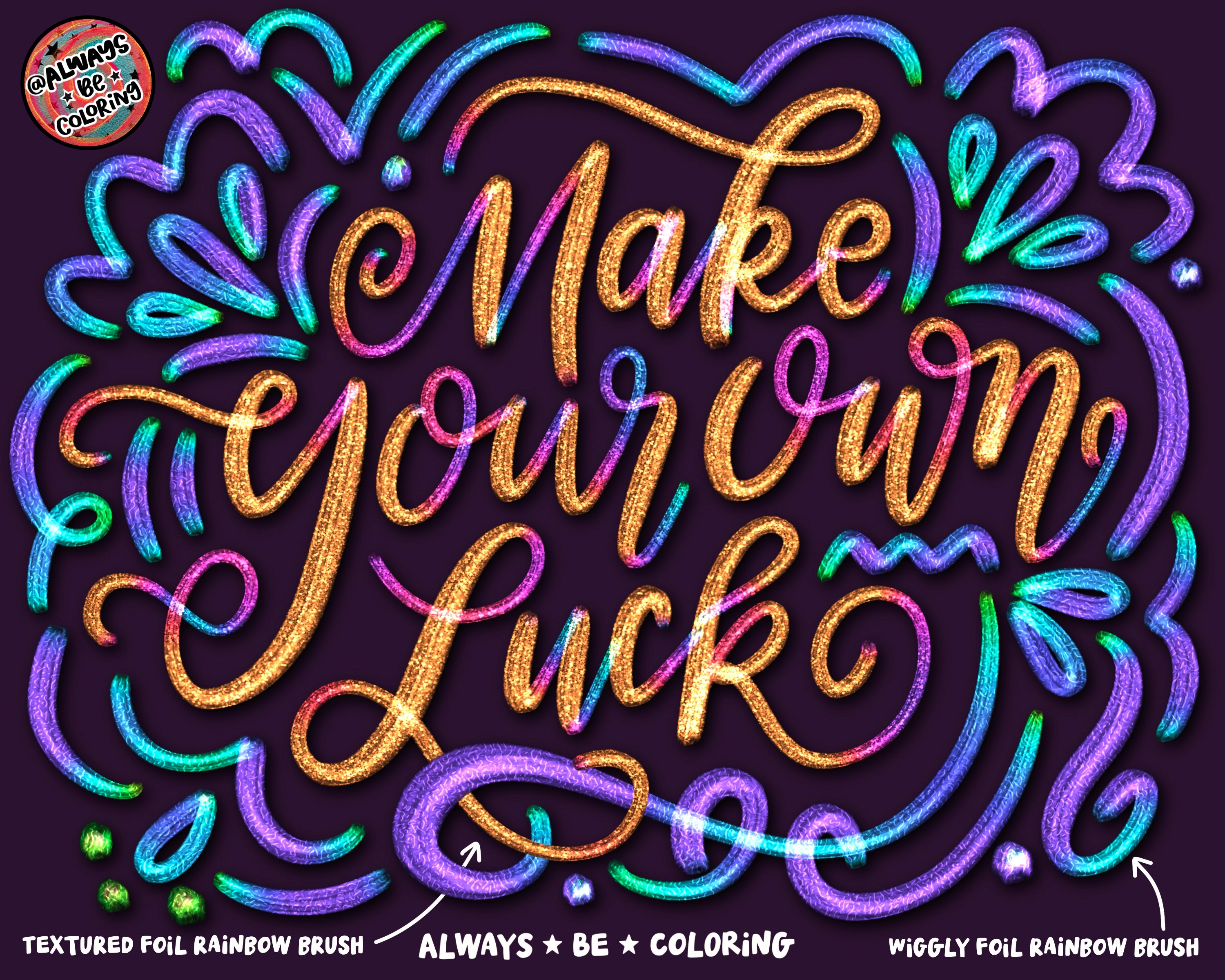 There are also 10 Rainbow Color Changing Foil Brushes with cool built in effects. The brushes change colors with varying brush pressure. Please note these brushes require VERY dark colors to bring out the foil textures. I highly recommend using the included color palettes - 60 hand picked colors that look great with these brushes!