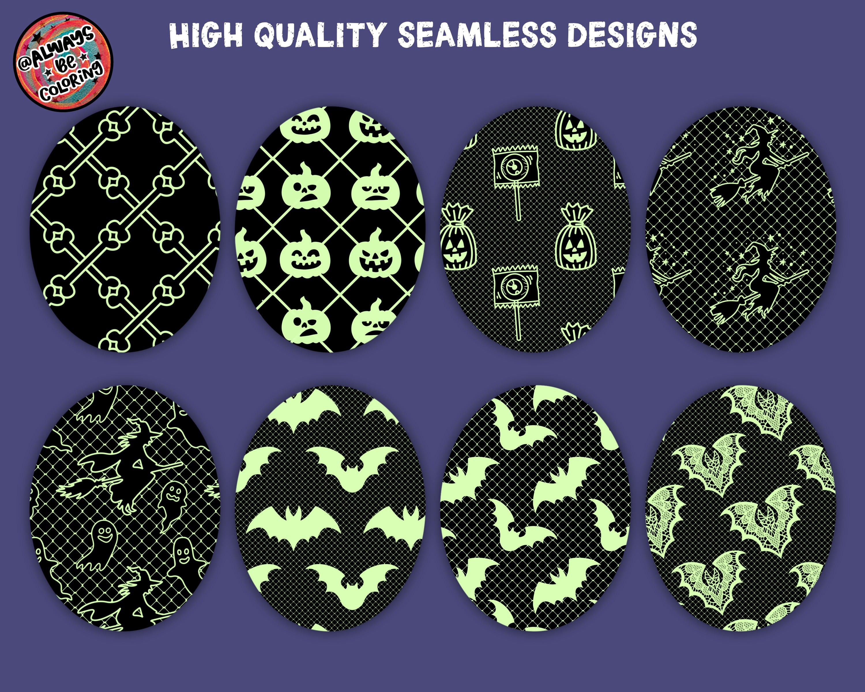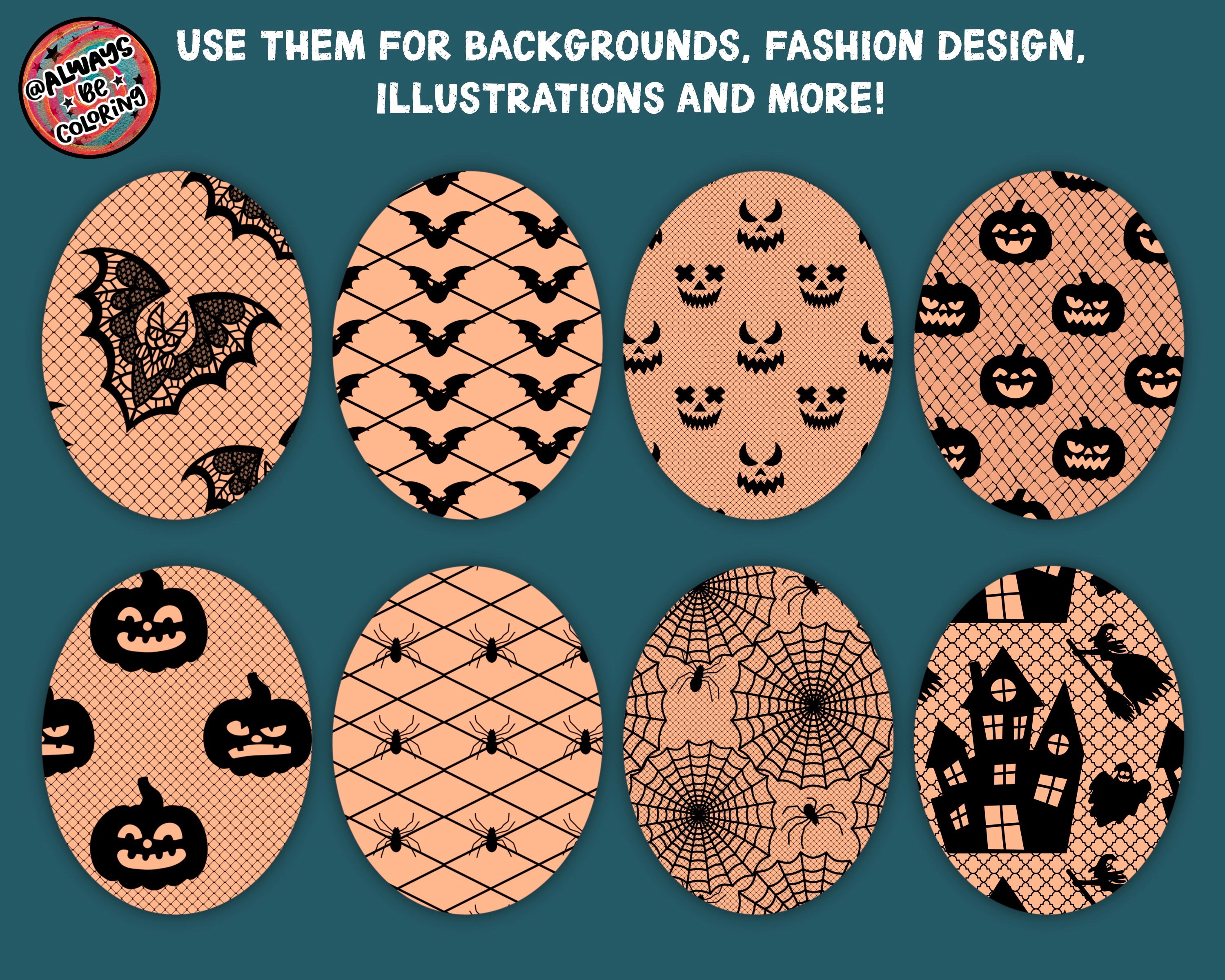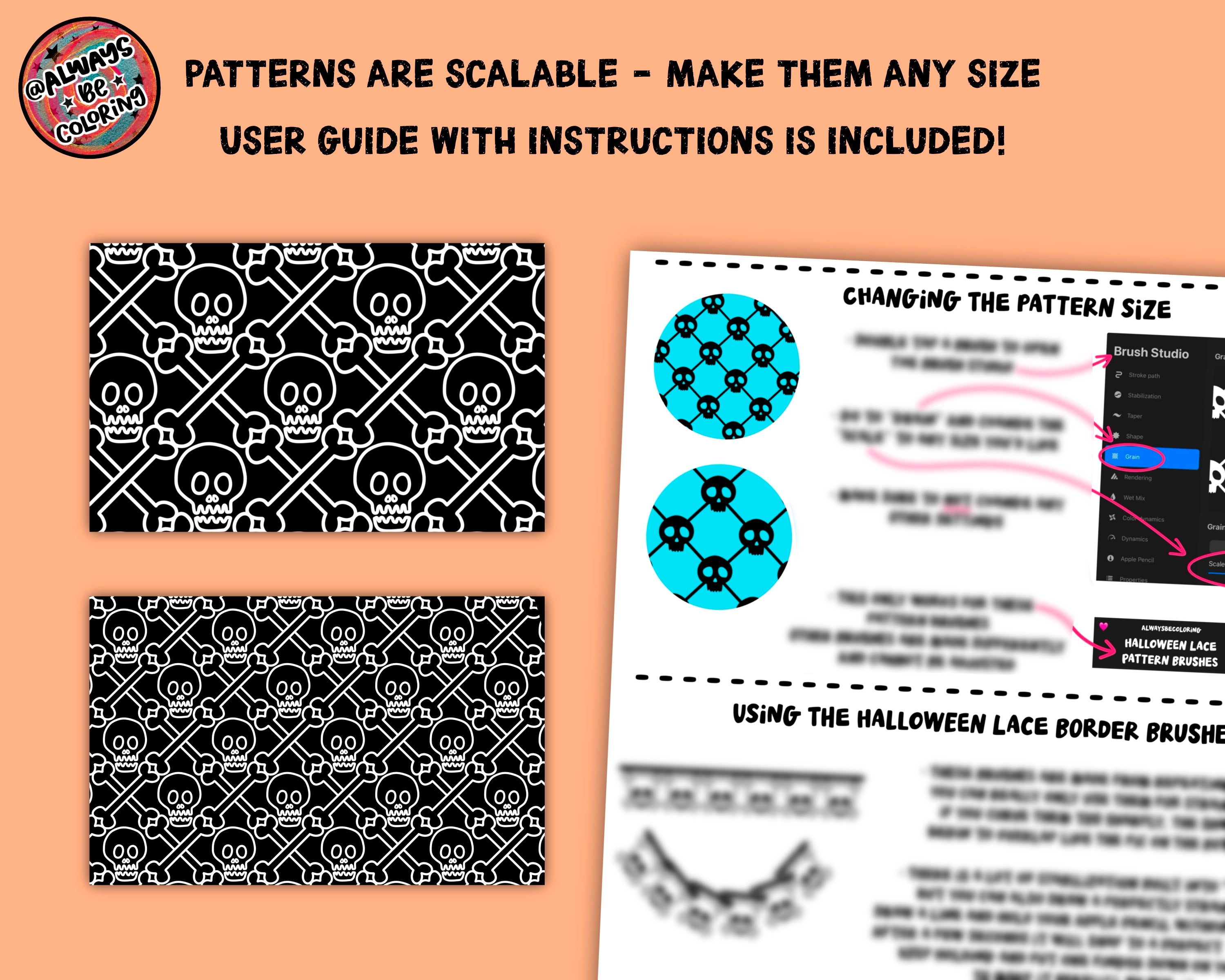 36 Procreate Halloween Lace Brushes including Hand Drawn Seamless Pattern Brushes and Border Brushes. The high quality Pattern Brushes include fun spooky Fall designs with witches, bats, skulls and more. Use them for backgrounds, illustrations and Halloween fashion designs! The hand drawn Lace Border Brushes are made of repeating shapes like spiders and skulls. Use them for your bullet planner journal spreads, digital calendars, cards, invitations and more! Due to the nature of the Border Brushes, they can be used to draw mostly straight lines only, if you curve them too sharply the shapes will begin to overlap.