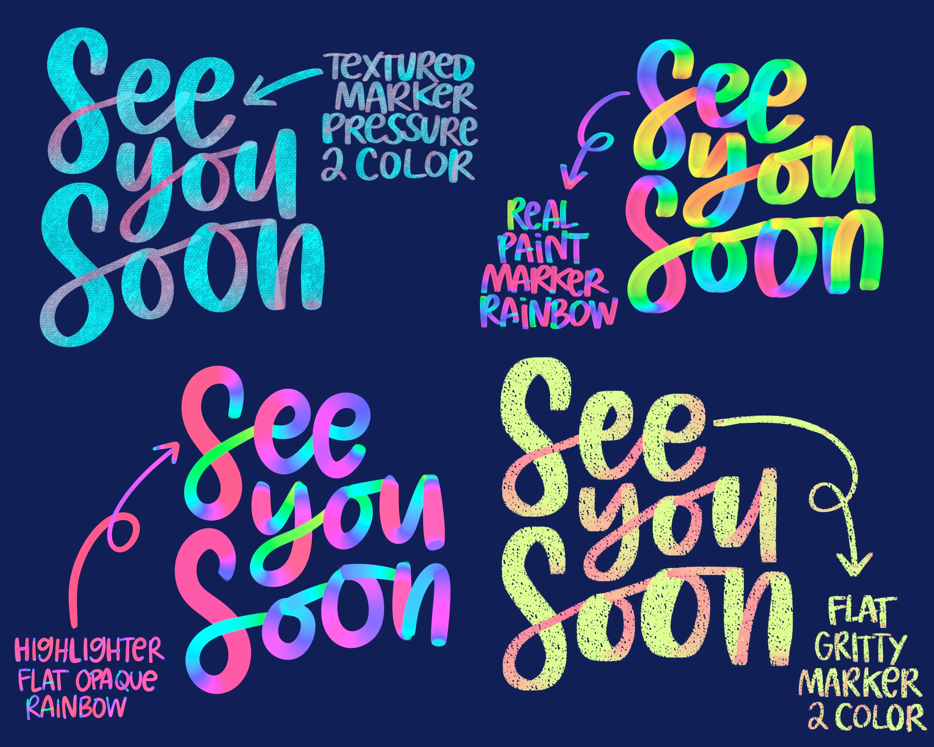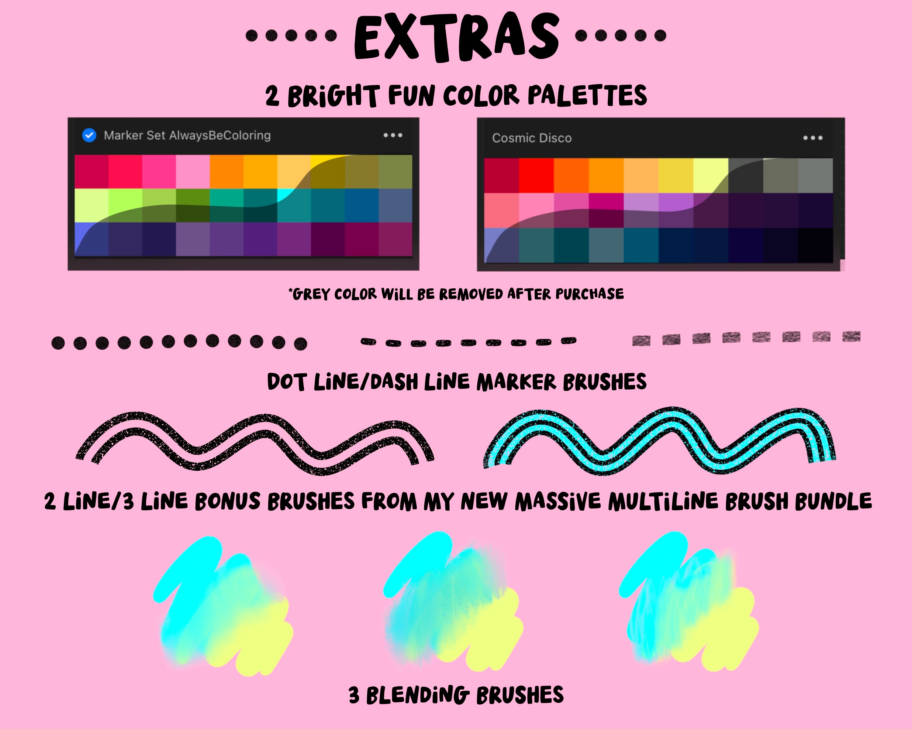 Procreate Marker and Highlighter Brush Set! 75 fun brushes including realistic markers, chisel tip markers, paint pens, textured markers, highlighters, color changing brushes and 2 color double brushes! Easily get the hand drawn marker look with these brushes! There are lettering brushes and lots of illustration brushes, plus 15 realistic paper texture brushes! 2 Bonus Procreate Color Palettes are also included to inspire you!