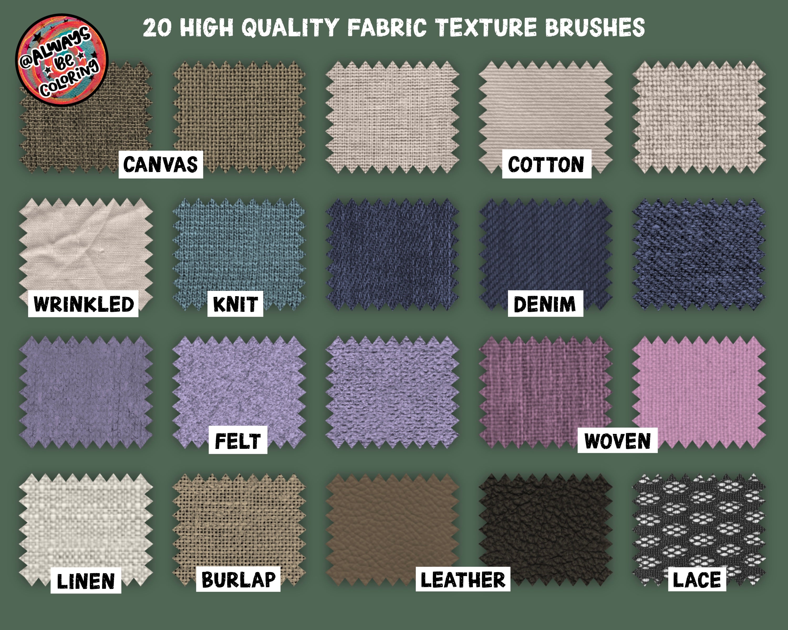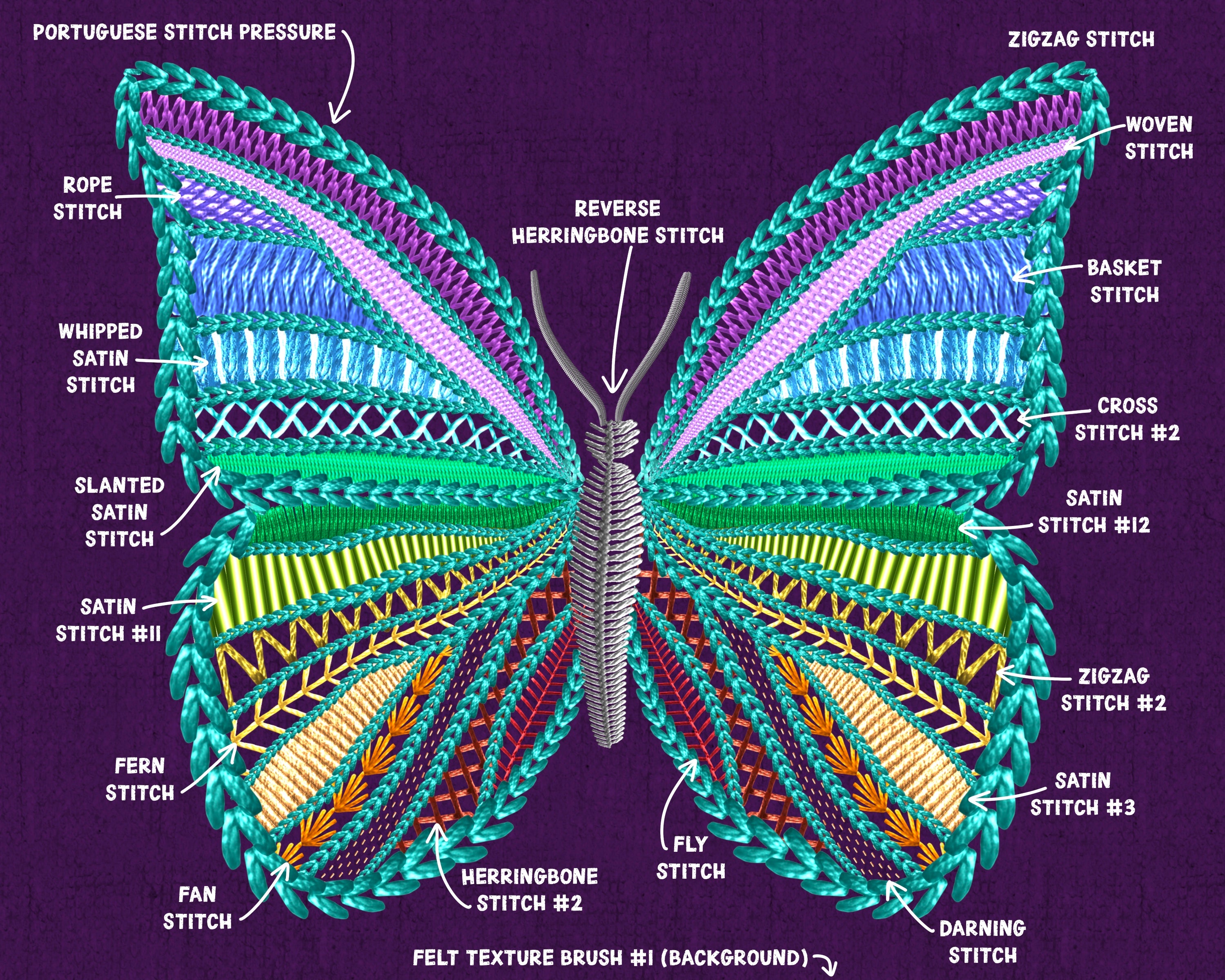 Introducing the Procreate Metallic Stitch Embroidery Brush Set! 222 Realistic Procreate Brushes with Classic Embroidery Stitches like Backstitch, Running Stitch, Satin Stitch, Herringbone, Cross Stitch, Chain Stitch, Blanket Stitch and lots more! There’s a wide variety of Decorative Border Stitches, Leaves, Stars, Flowers, and Lace Border Brushes too! All brushes are specially made dual color brushes with a metallic shine and built in highlights and shadows for a very realistic look. We’ve included 3 Procreate Color Palettes with the perfect color combinations to make the metallic stitch brushes look great! Plus we added 20 of our favorite High Quality Fabric Texture Brushes like Canvas, Linen, Cotton, Denim, Felt, Burlap, Leather and Lace.