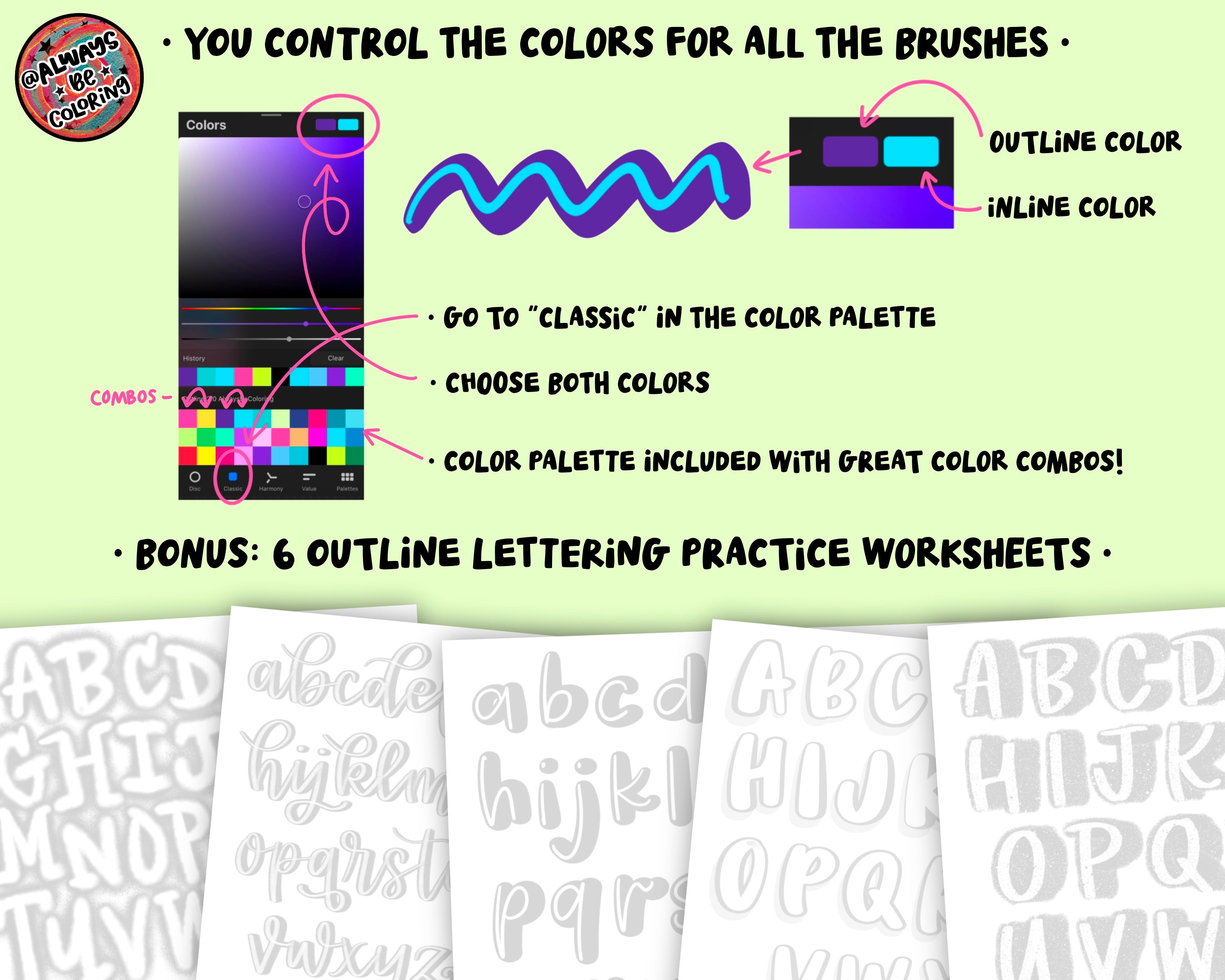 150 new Procreate 3D Outline Brushes including pattern brushes, textured brushes, paint brushes, multi-line brushes and fun decorative brushes with dots, stitches, stars and other elements! There’s a wide variety of smooth outline brushes and brushes with shadows that give you a bold three dimensional effect instantly! Plus 6 outline lettering practice worksheets with different hand lettering styles. And a bonus Procreate Color Palette with great color combos! You control the colors of each brush - choose the outline and inline colors.