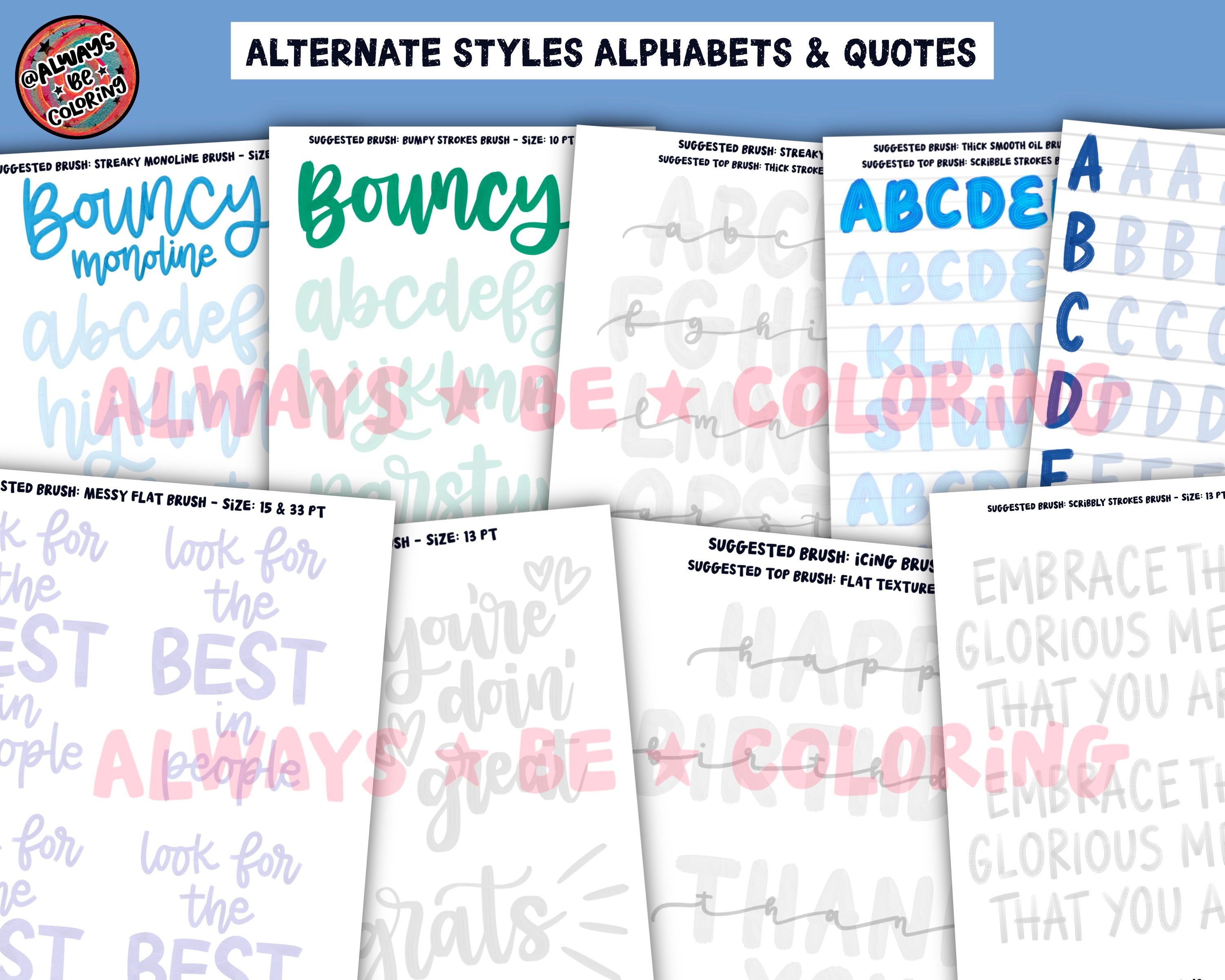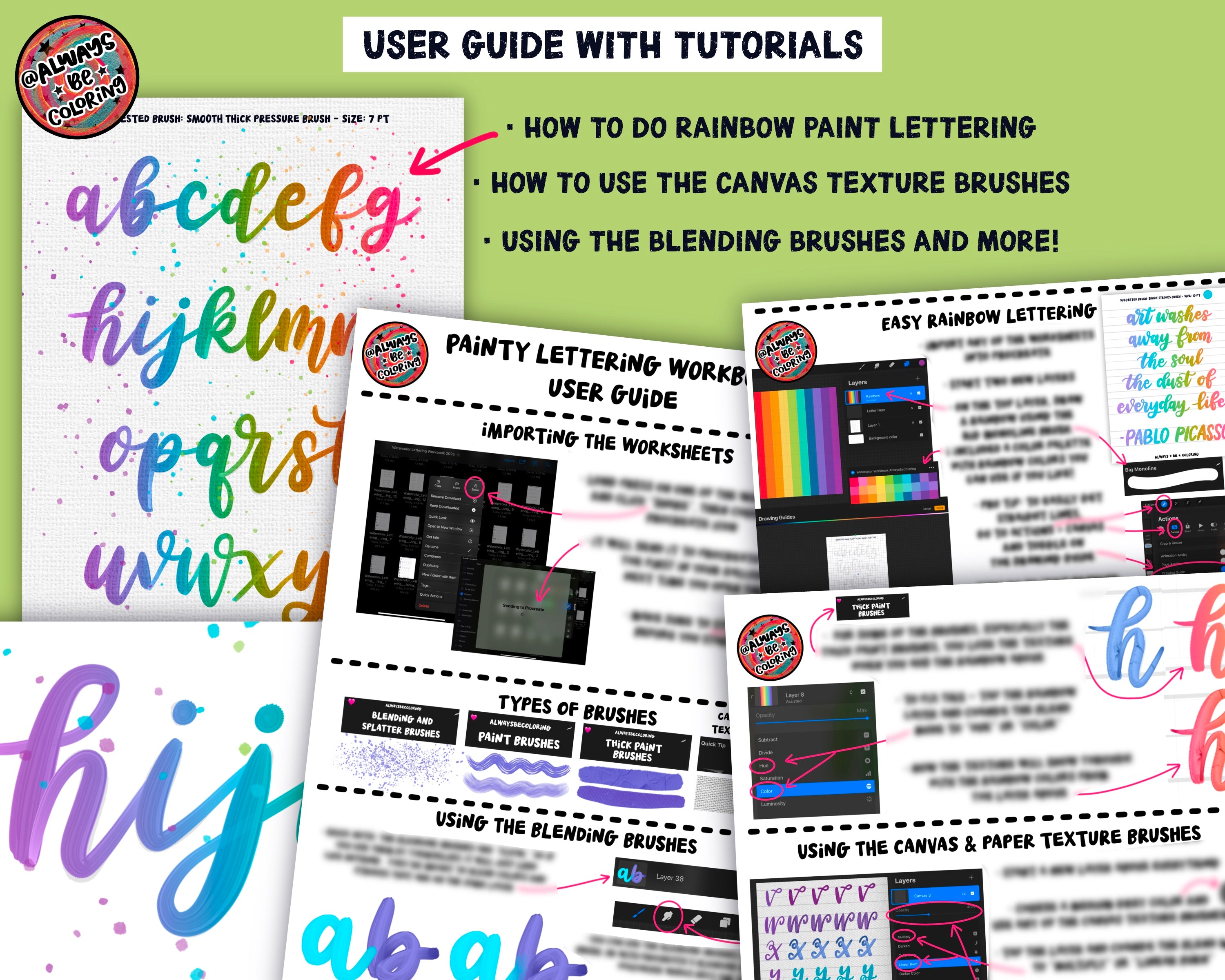 30 Paint Lettering Practice Worksheets with Upper and Lowercase Alphabets, Alternate Styles Alphabets, Pangrams, Uplifting Quotes and cute Painty Doodles. 35 Realistic Procreate Paint Lettering Brushes, Thick Oil Style Paint Brushes, Blending Brushes and Splatter Brushes. 12 High Quality Procreate Canvas Texture Brushes and 4 Paper Texture Brushes. One Rainbow Color Palette and a detailed PDF User Guide with tips and tutorials including how to do fun Rainbow Lettering, how to use the Paper Texture Brushes, Using the Blending Brushes and more! The set also includes PDFs that you can print out at home and use with markers or paints.