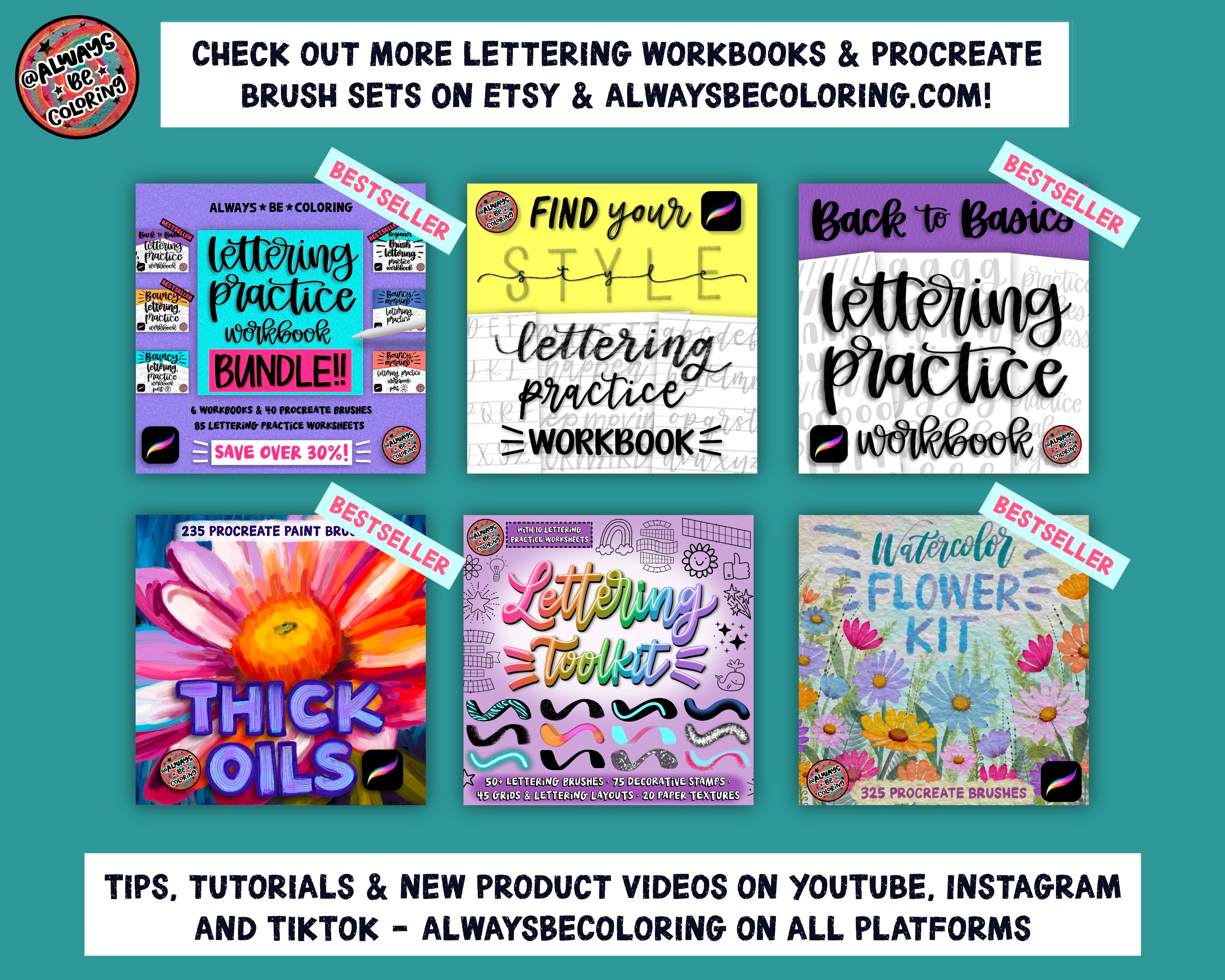 Learn hand lettering and modern calligraphy in a new style with awesome Procreate Paint brushes. They have a variety of textures and effects that mimic the feel of real paint brushes. Plus there are blending brushes that effortlessly blend colors, and splatter brushes to add another fun paint effect to your artwork! The engaging lettering worksheets are easy to use and meant for any skill level, whether you are a complete beginner, or an experienced artist looking to learn a new style!