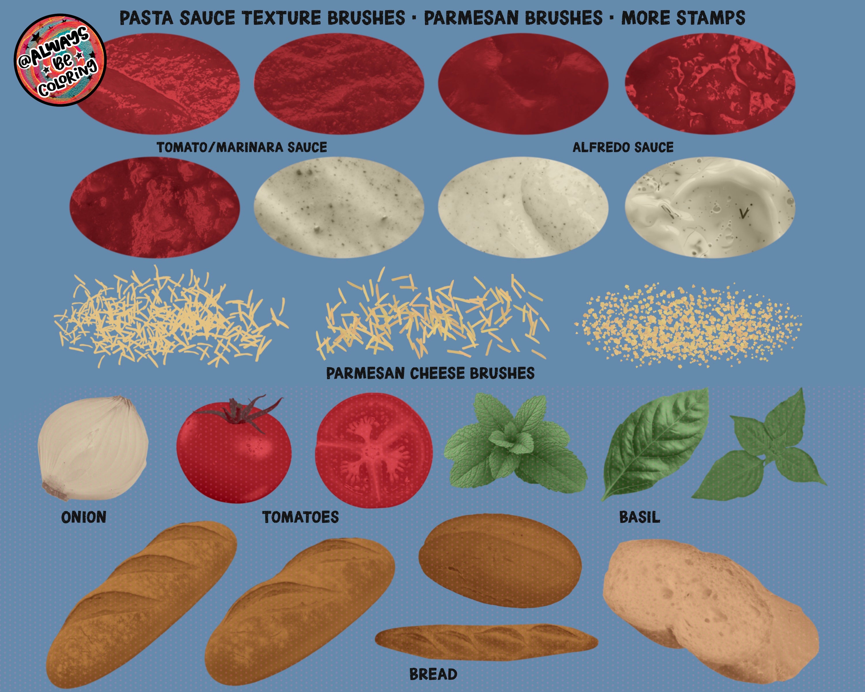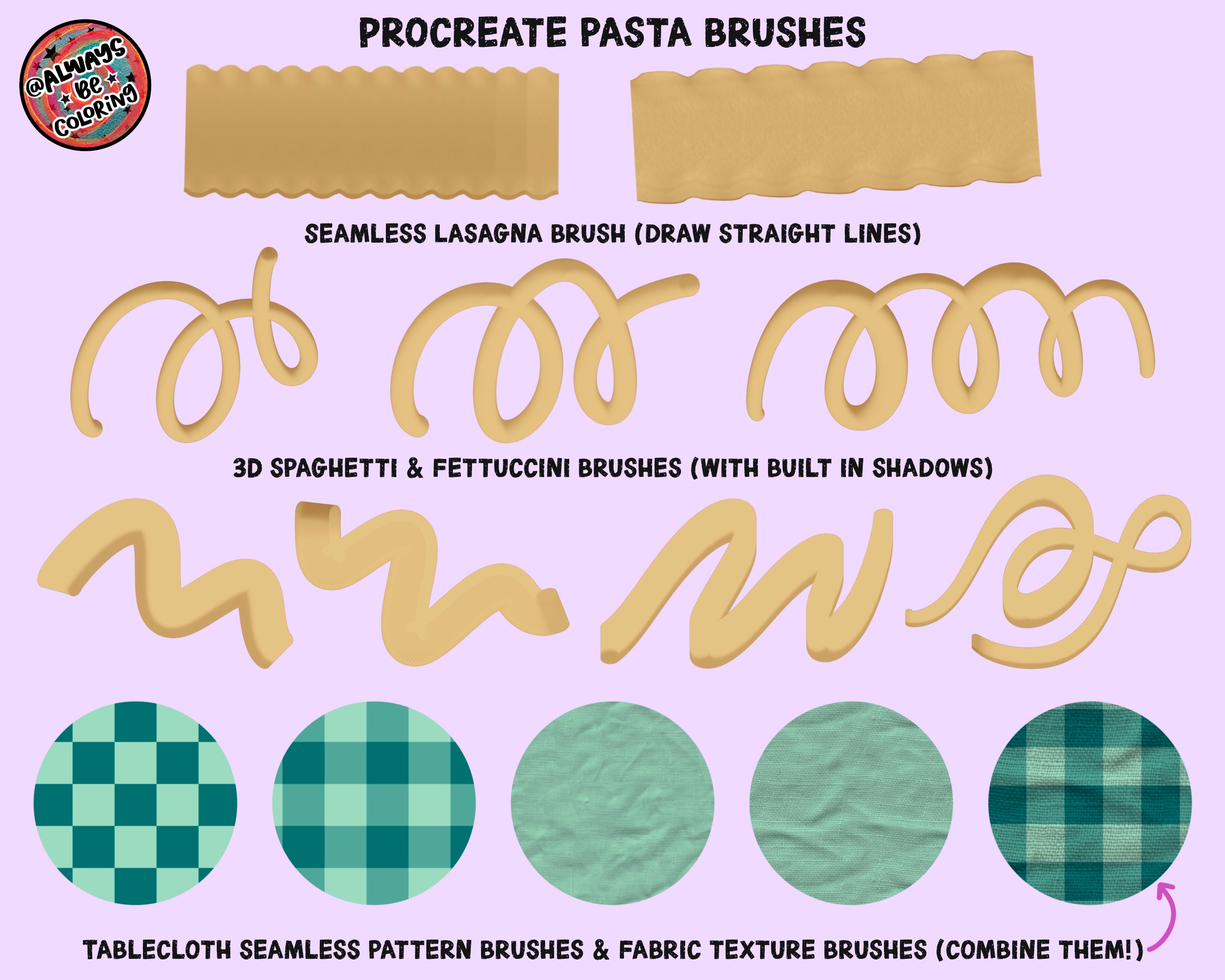 AlwaysBeColoring, pasta Procreate brushes, food illustration brushes, Procreate kitchen stamps, realistic pasta brushes, spaghetti brush set, lasagna Procreate brushes, cheese texture brushes, bread stamp brushes, sauce texture brushes, Procreate cooking brushes, food art brushes, Italian kitchen brushes, restaurant design brushes, culinary illustration stamps, realistic food brushes, Procreate plates and silverware, pasta clipart stamps, Procreate recipe brushes, food lover brushes, digital cooking brushes, procreate texture brushes, illustration brushes, procreate lettering brushes, drawing brushes