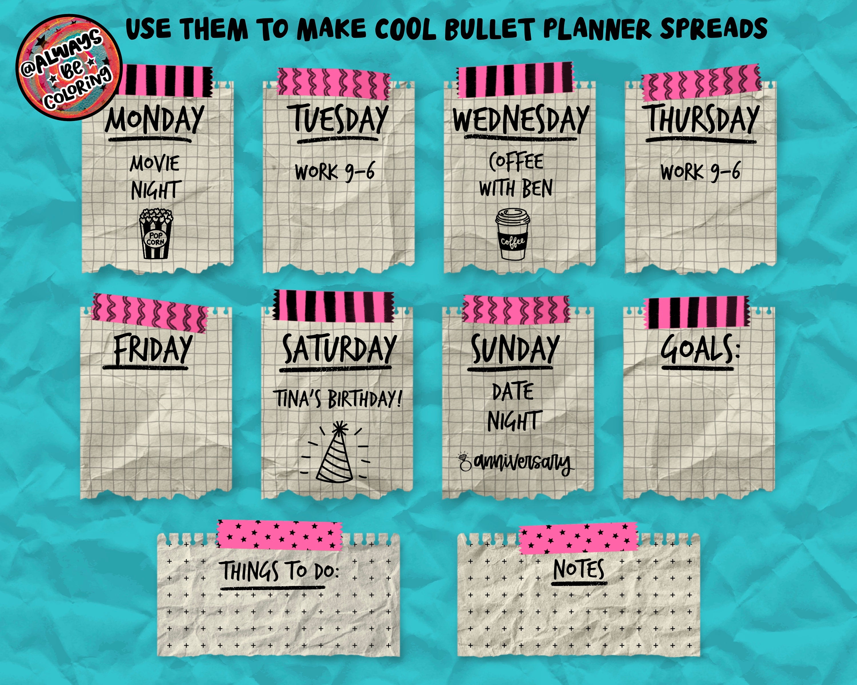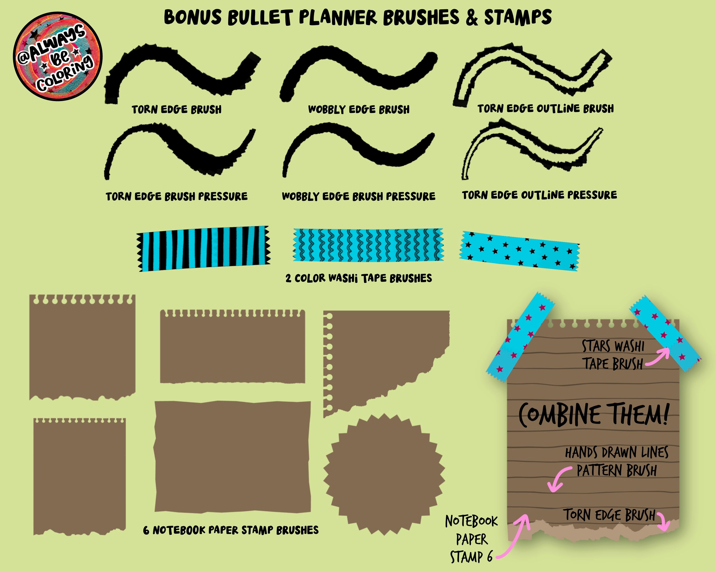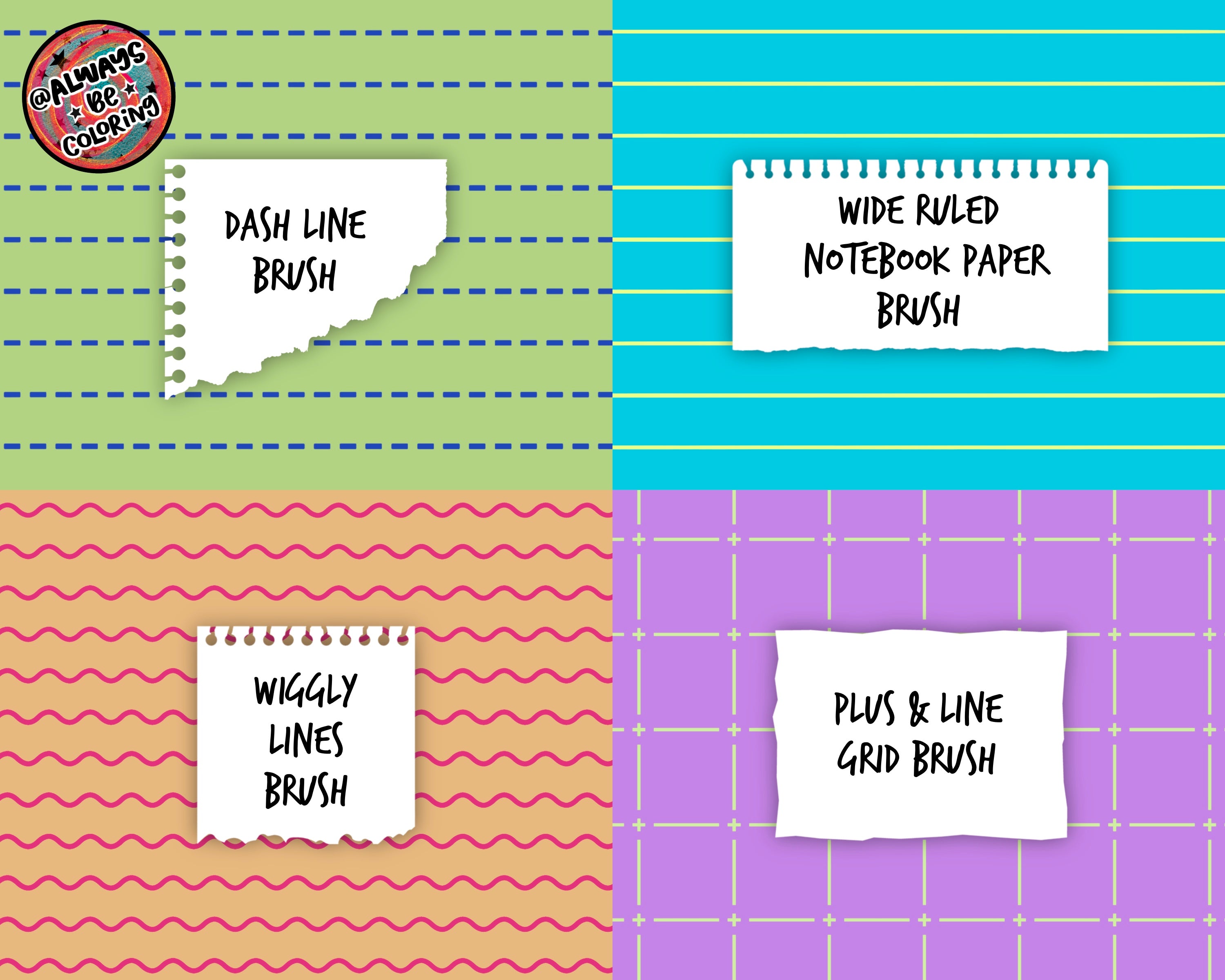 138 Procreate Brushes including Seamless Procreate Pattern Brushes with Dot Grids, Notebook Paper Lines, Graph Paper Grids, and lots of other paper patterns to use with your Bullet Planner Journals and Digital Illustrations! Plus 10 Crumpled Paper Texture Brushes and 18 Bonus Brushes including Torn Paper Edge Brushes, Sketching Brushes, 2 Color Washi Tape Brushes and 6 Notebook Paper Stamps. The set also includes a PDF User Guide with tips and tutorials to make sure you get the most out of the set!
