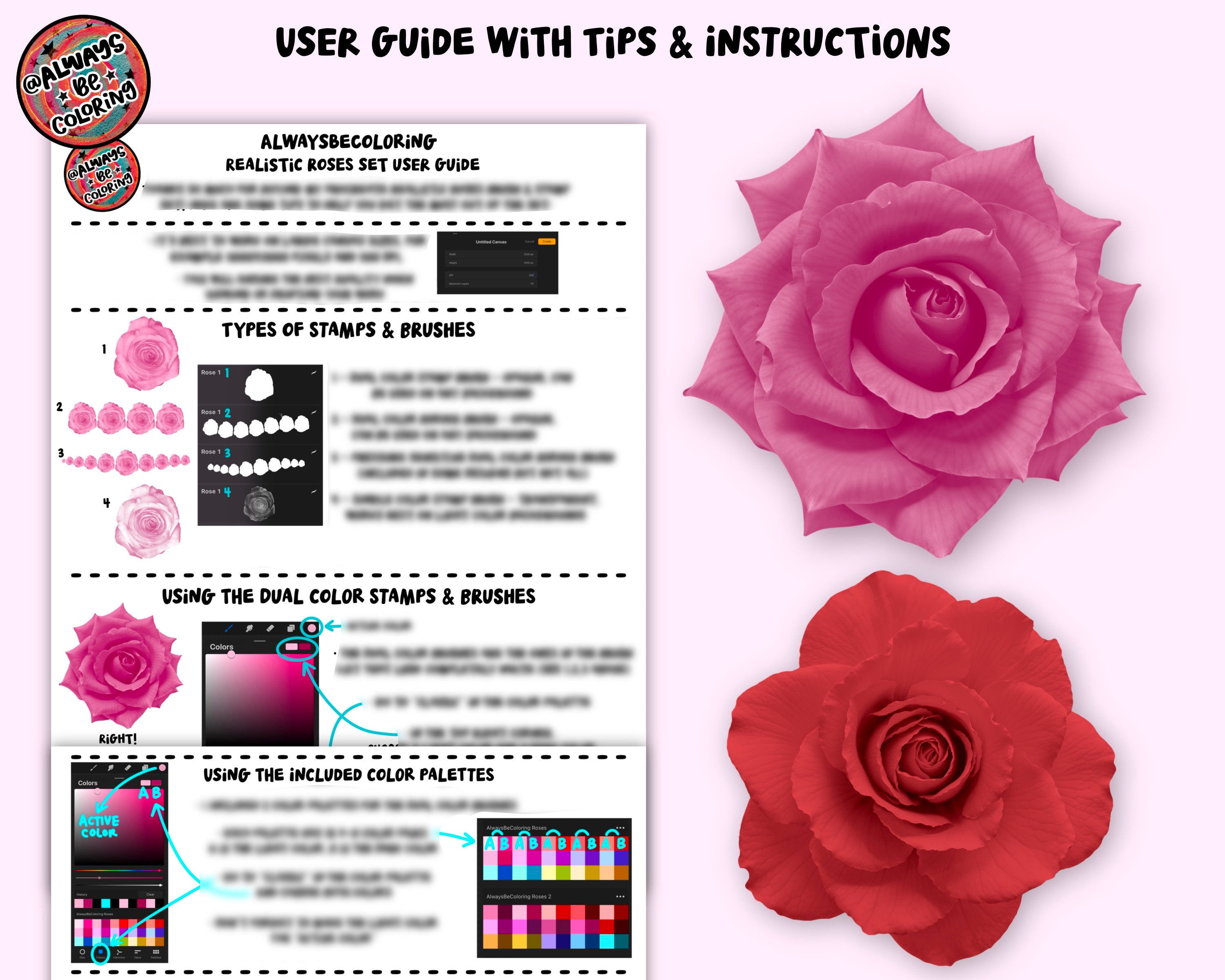 • 120 high-quality Procreate Rose Brushes & Stamps - including dual color stamps, dual color brushes and single color stamps. The dual color brushes/stamps are opaque and can be used on any background. The single color stamps are transparent and look best on light color backgrounds