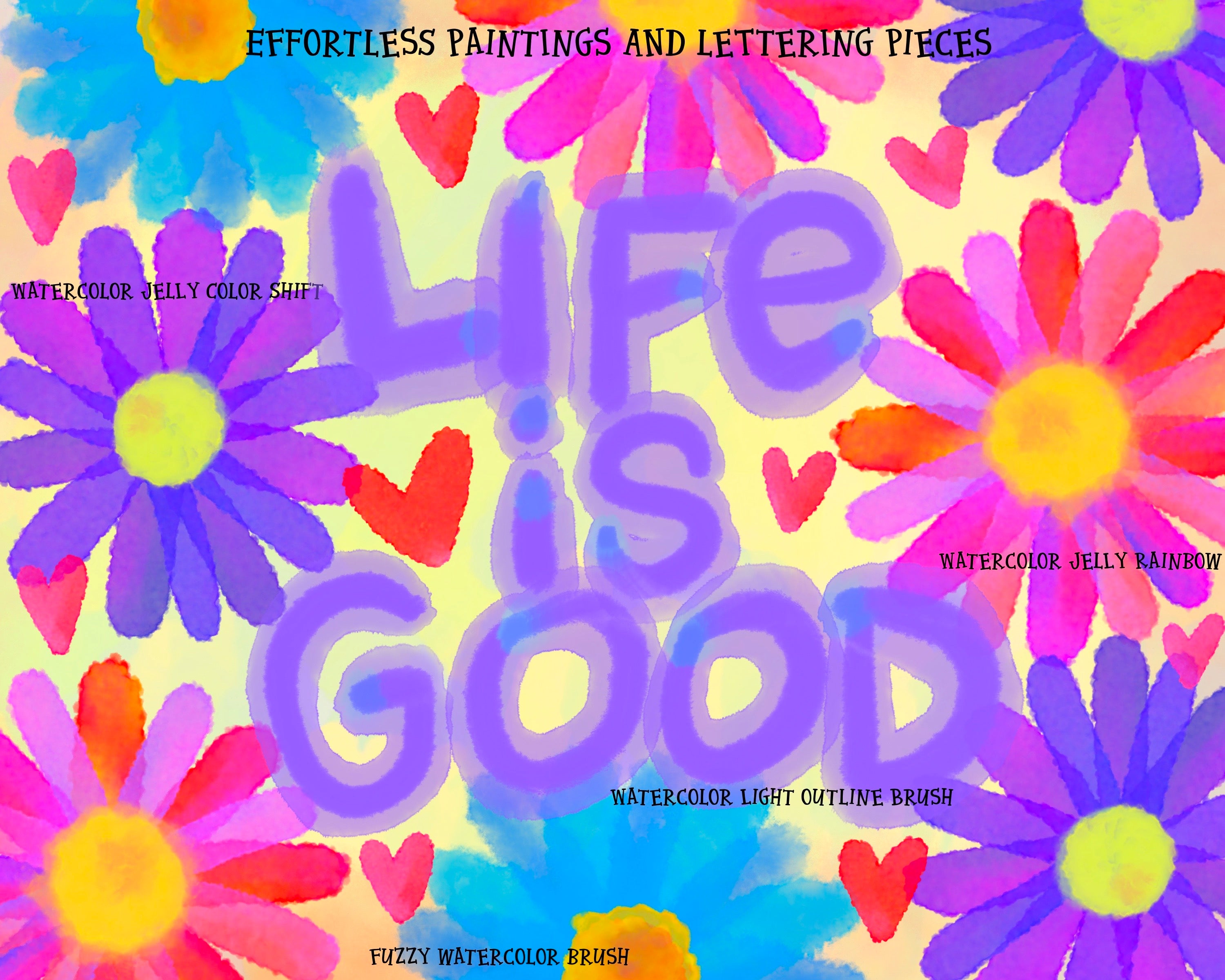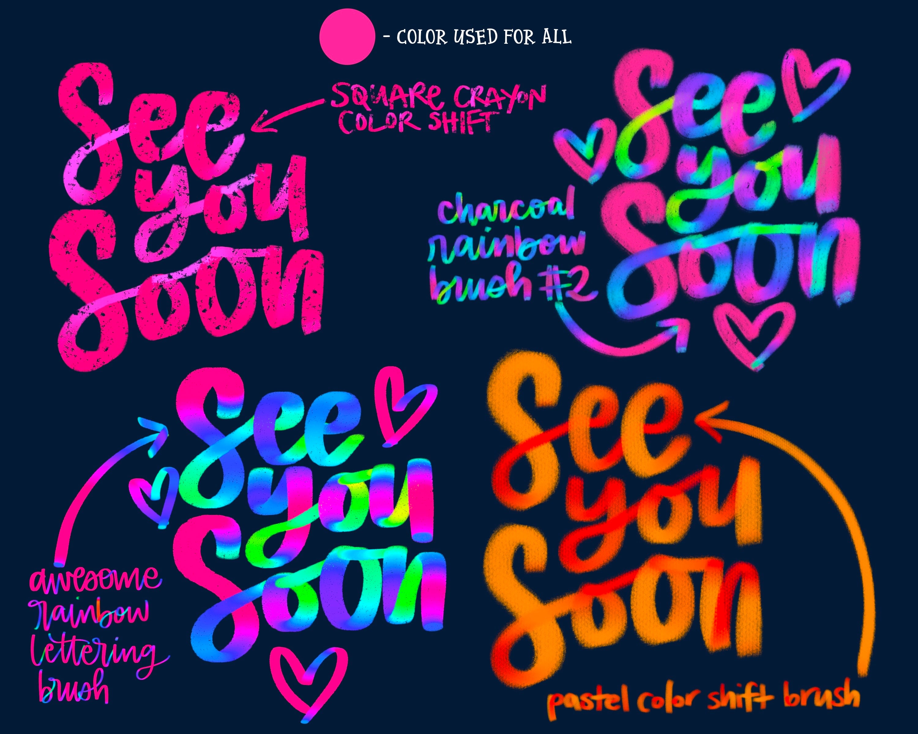 85 Procreate Special Effects Brushes, including rainbow, neon, textured, 3D, painting brushes, double brushes and color changing brushes! They are pressure sensitive and perfect for iPad Lettering and Digital Illustration. You will be amazed at the color effects built into these brushes, and they’re very easy to use!