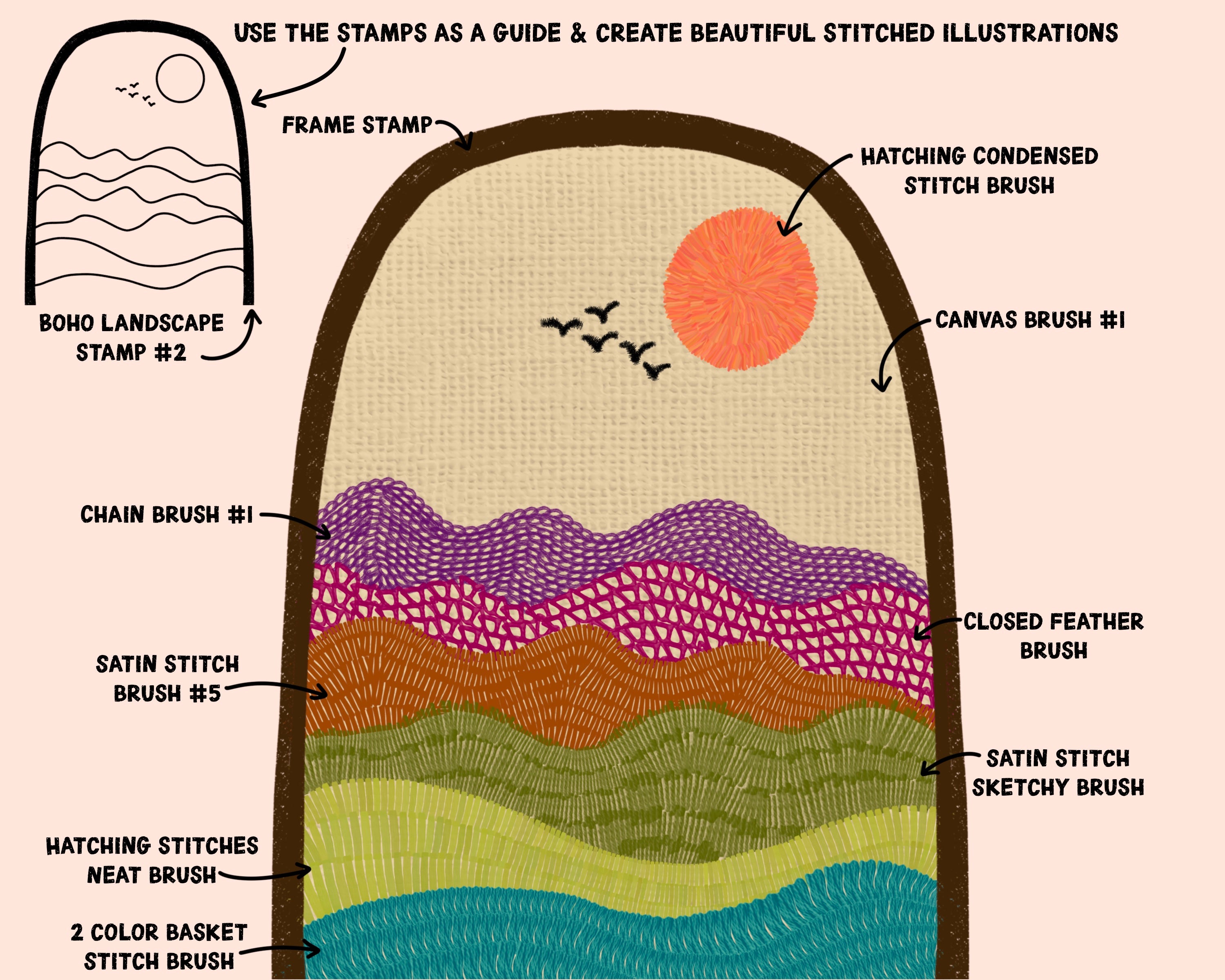 Over 225 Procreate Brushes including over 175 stitches brushes, 22 high quality fabric texture brushes, frames and embroidery hoop stamps, & wreaths and other stamps to use as a guide and make beautiful stitched illustrations! There are tons of realistic embroidery stitch brushes including backstitch, running stitch, cross stitch, chain stitch, blanket stitch, feather stitch, basket stitch, herringbone stitch, satin stitch, and plenty of decorative stitches! Plus hatching and crosshatching stitch brushes, French knots, eyelets, banner stitches, stars, flowers, leaves and bird decorations. The texture brushes include: canvas, wool, cotton, burlap, leather, denim, linen, felt, knit, checkerboard and polka dot seamless textures!