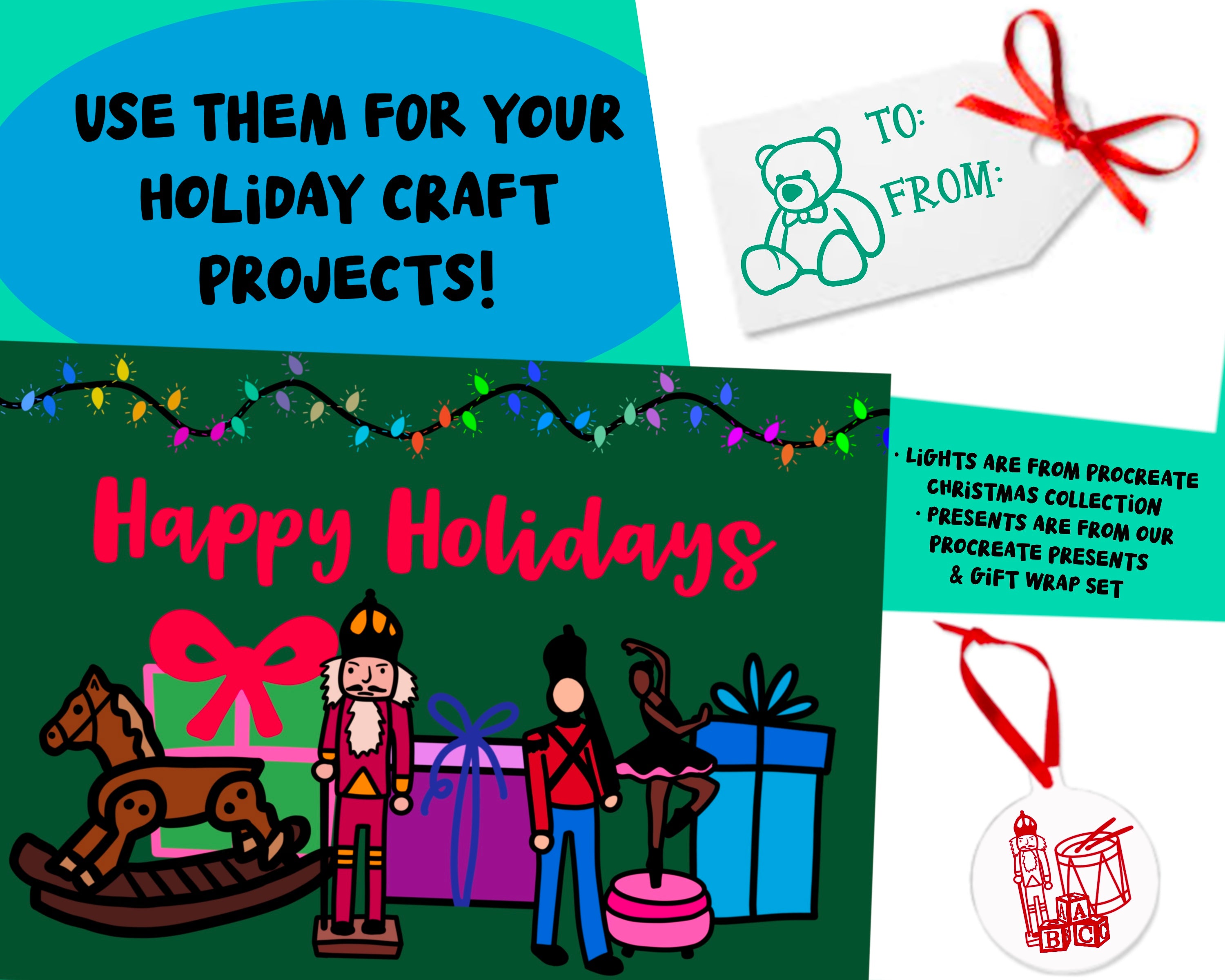 Precreate Toys Stamp Brush Set! Over 80 Hand Drawn Toys Stamps including holiday toys, classic toys, games, sports, animals, cars, trains, action figures, dolls and musical instruments! Plus 2 bonus Procreate Color Palettes to inspire you - one with bright fun toy colors, one with skin, fur and hair tones for doll, action figures and stuffed animals! This set is made for any skill level! Make DIY Christmas cards and holiday crafts, or use them with your lettering and illustration projects!