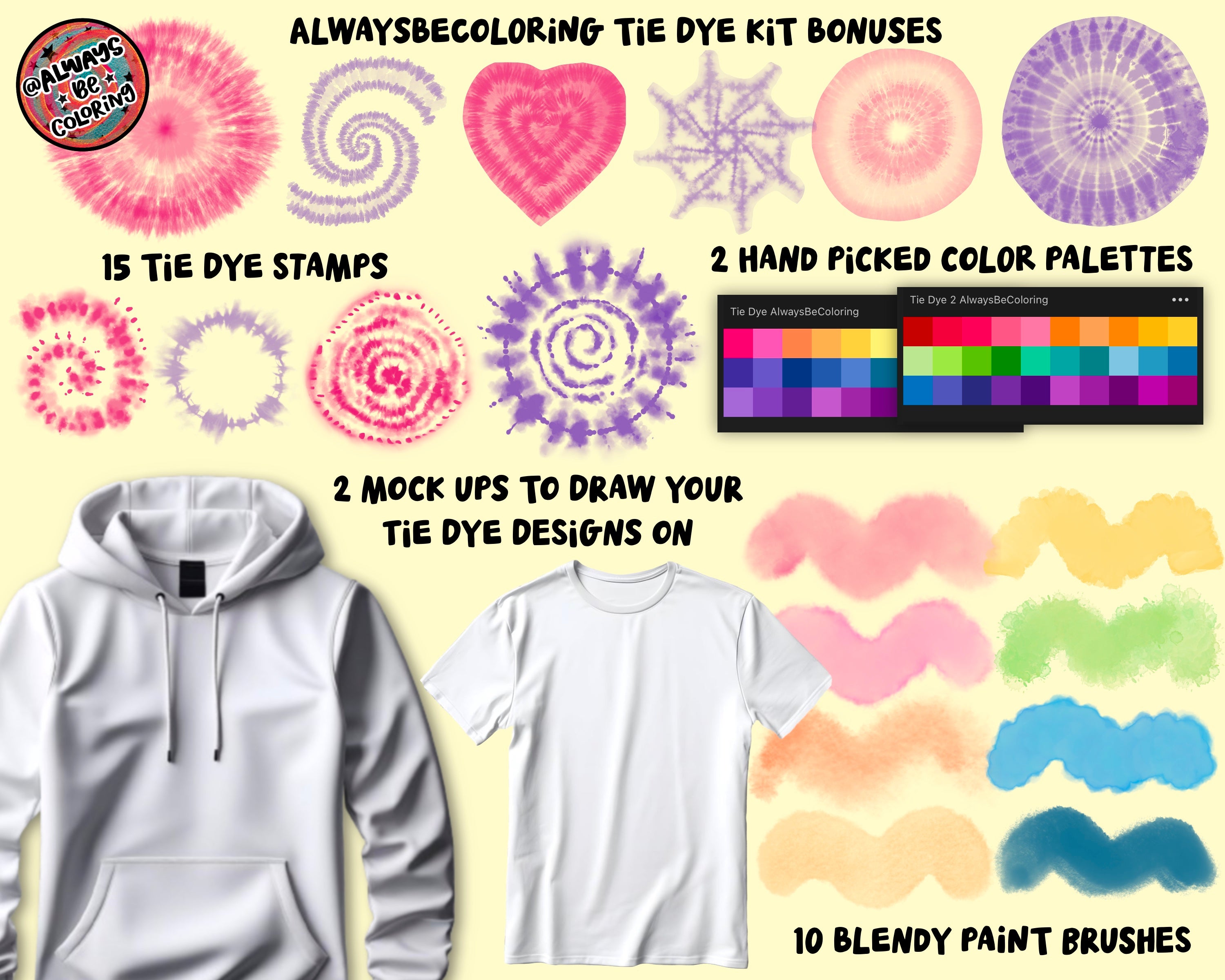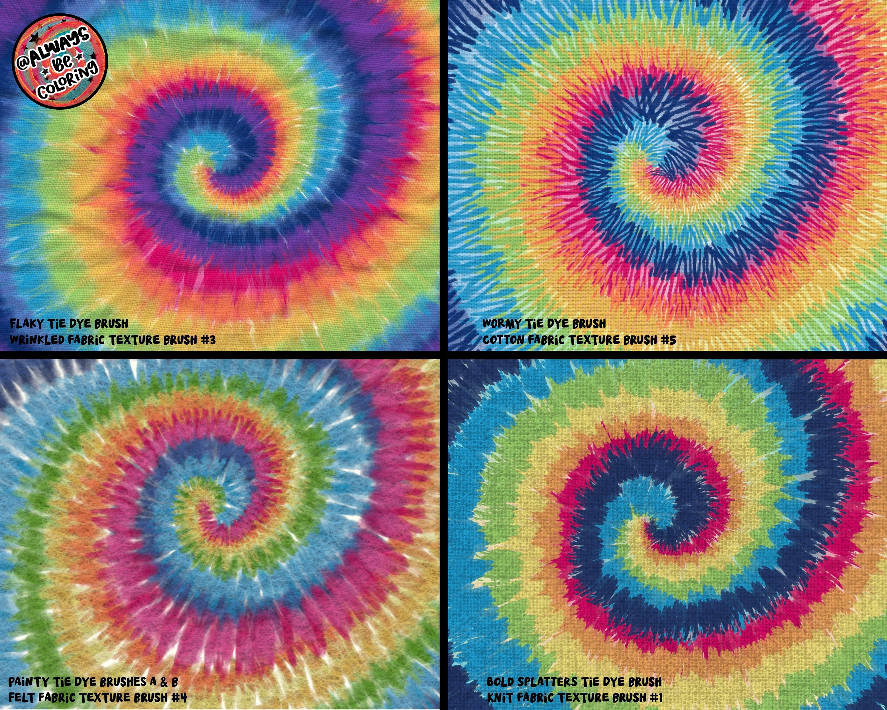 Introducing the Procreate Ultimate Tie Dye Brush Set - everything you need to easily create realistic digital tie dye designs! This set includes over 200 Procreate Brushes - 85 Dynamic Tie Dye Brushes with different shapes and effects, 50 High Quality Tie Dye Texture Brushes, 14 Realistic Paper Texture Brushes, and 30 Fabric Texture Brushes. Plus 15 Tie Dye Stamps, 10 Blendy Paint Brushes, 2 Hand Picked Color Palettes, 2 Shirt Mockups that you can draw your tie dye designs on, and a PDF User Guide with tips and tutorials to make sure you get the most out of the set! This set is easy to use and meant for any skill level. You won’t believe how quickly you can make realistic tie dye with such a wide range of designs and effects. This set is one of my personal favorites, I’ve been having a blast with it and I think you are gonna love it too!