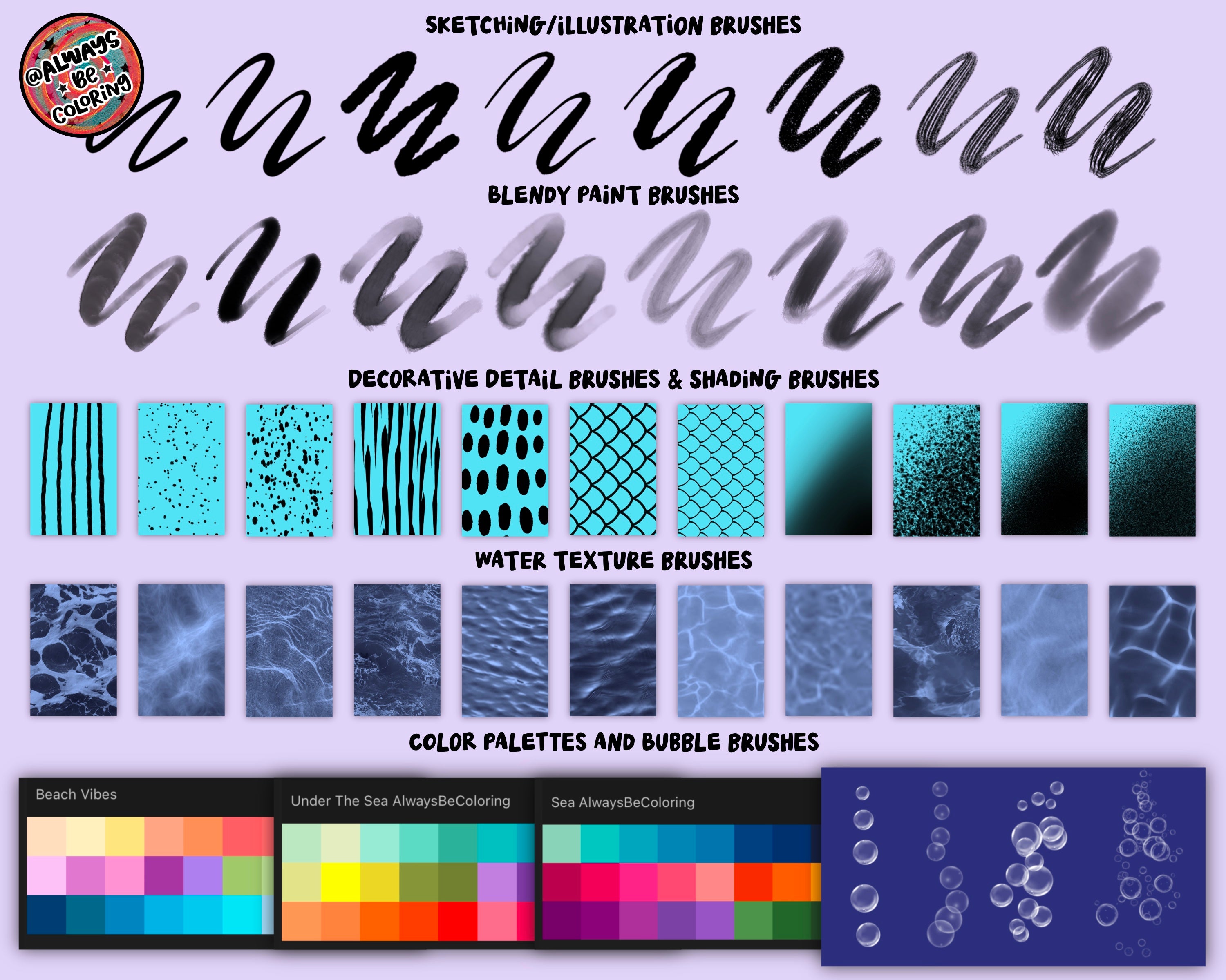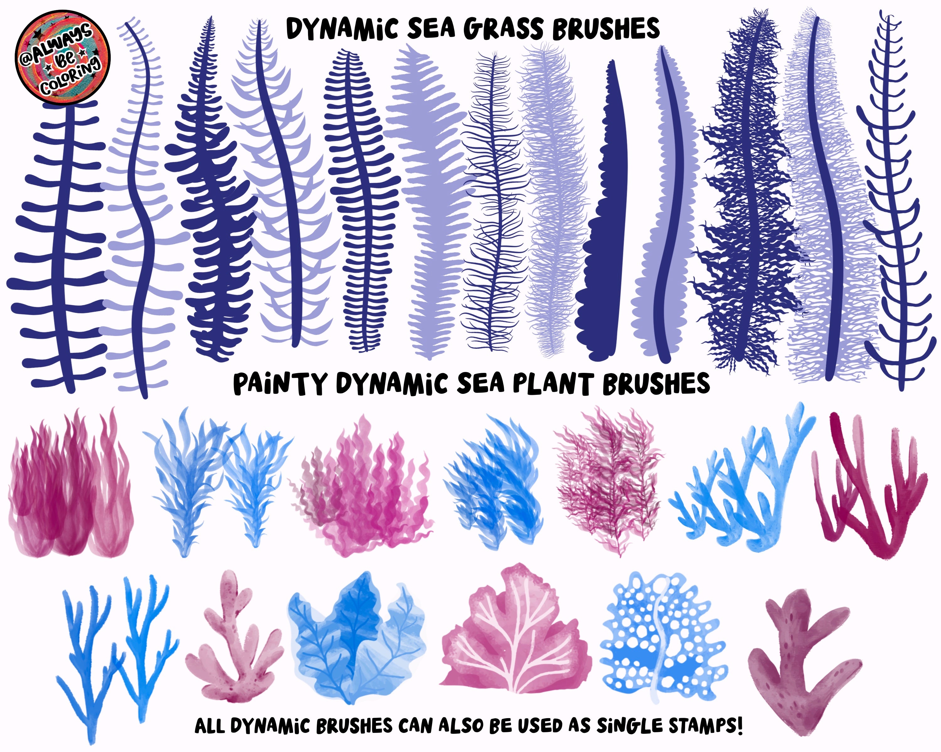 400 Procreate Under the Sea Stamps and Dynamic Brushes - absolutely everything you need to easily create realistic underwater scenes and ocean themed artwork! With Procreate Stamps including fish, whales, sharks, sea turtles, crabs, jellyfish, and seashells. Some are hand drawn outline stamps, others are silhouette stamps that you can draw over with a clipping mask, then there are also Watercolor style stamps. Plus there are tons of Procreate Dynamic Sea Plants and Sea Grass Brushes that follow your pencil so you can make them any size you’d like. Some have built in color changing effects too! Plus there are sketching and illustration brushes and blendy paint brushes to create your scenes, and decoration, detail and shading brushes to add cool effects. There are fish scales texture brushes and water texture brushes, and bubble brushes for a perfect finishing touch! Here’s a list of everything that is included with the set: