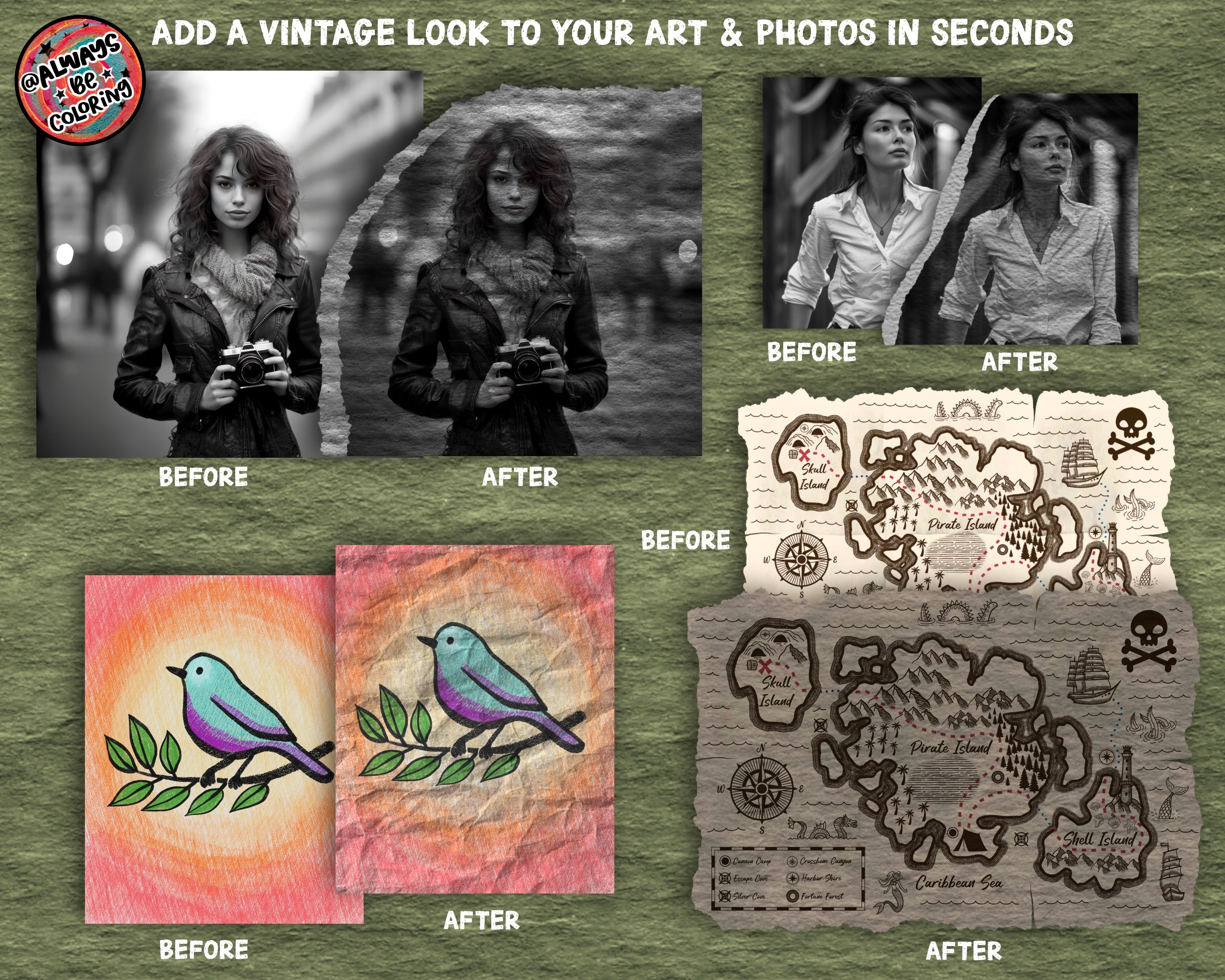 200 New Procreate Brushes including High Quality Vintage Paper Texture Brushes, Vintage and Collage Seamless Pattern Brushes and 10 Hand Drawn Vintage Frames! Plus 2 Procreate Color Palettes and an in depth PDF User Guide with tips and tutorials. Add a vintage look to your art and photos in seconds! There are so many options of realistic paper textures, grunge textures, crumpled paper textures and more. Use them as overlay brushes over any style of artwork, photos, or sketches. Use them to make cool digital illustrations, collages and scrapbooks! These brushes will add realism and tons of personality to your artwork!