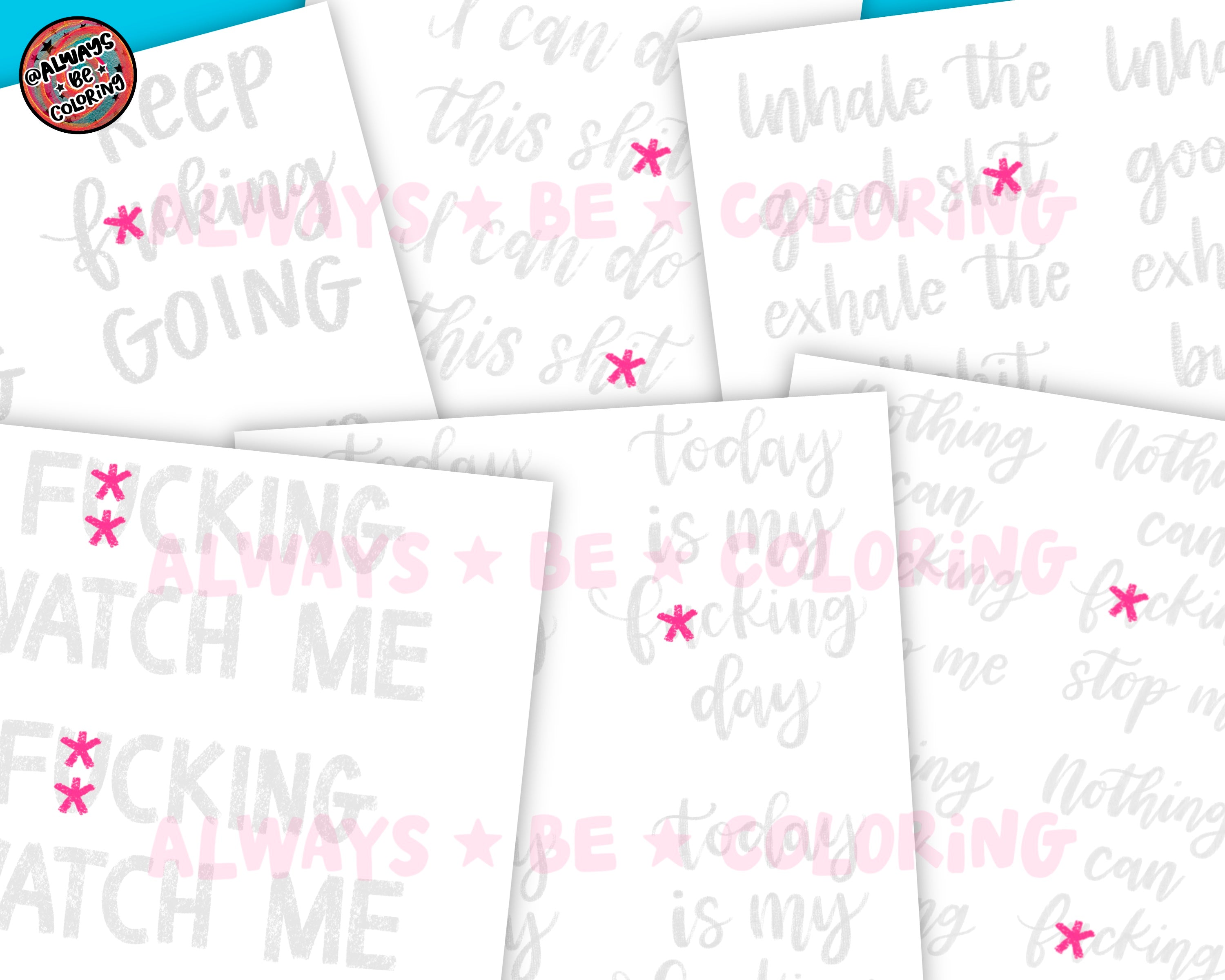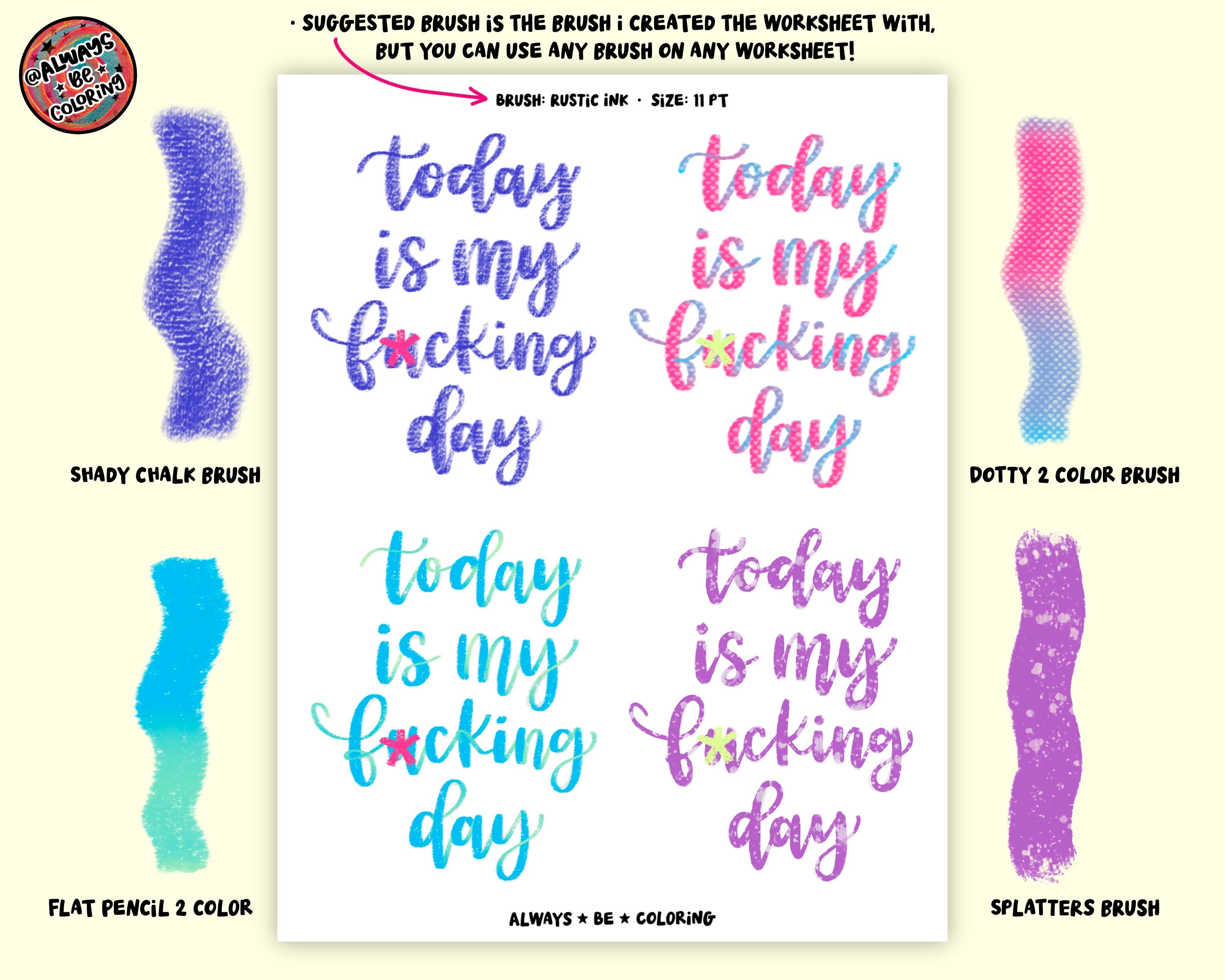 15 Swear Word Affirmation Lettering Practice Worksheets with fun inspiring and motivational quotes. Plus 32 awesome Procreate Lettering Brushes including monoline brushes, pressure sensitive brushes, textured brushes, and color changing brushes. Learn different hand lettering and calligraphy styles, including bouncy brush lettering, slanty script calligraphy and bold block letters, plus some block letter/calligraphy combo worksheets!