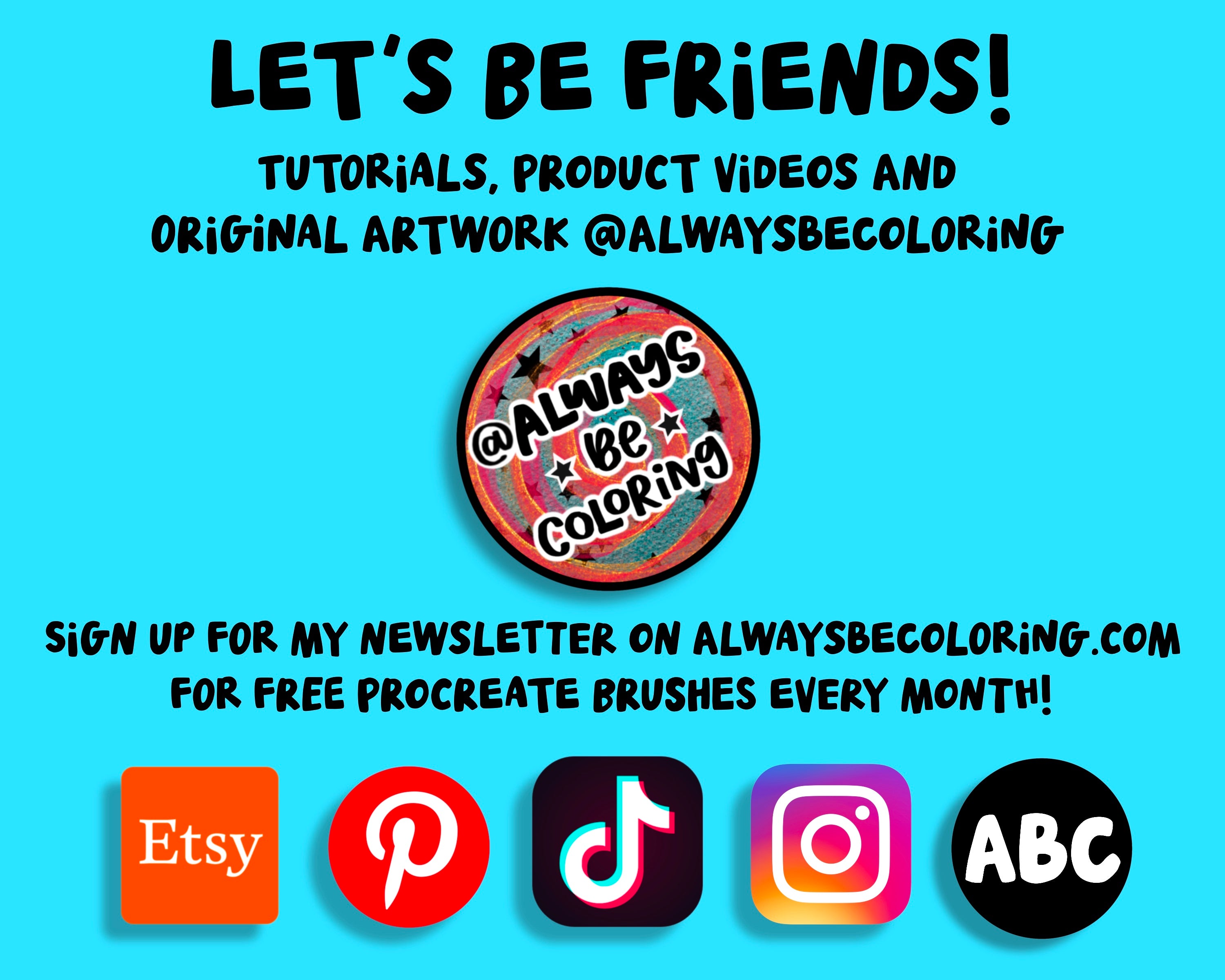 Tips, tutorials and videos on Instagram, Pinterest, and Tiktok - AlwaysBeColoring on all platforms.