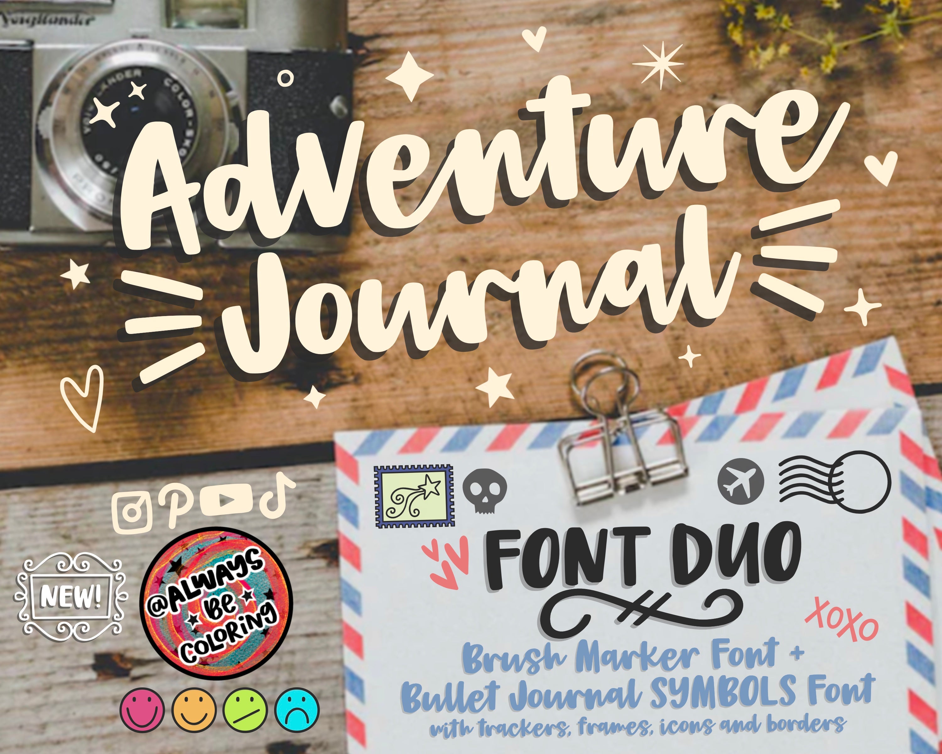 Introducing Adventure Journal Font Duo! A modern hand drawn brush marker script font, plus a Bullet Planner SYMBOLS font with over 120 unique doodles. It includes cute icons, borders and dividers, habit tracker, mood trackers and water trackers, calendar icons and tons of decorative elements! Easily make your own Bullet Planner pages to print out or to use in Procreate or Goodnotes! Plus it’s perfect for logos, branding, invitations, t-shirts and more! It will work easily in many programs such as Microsoft word, pages, Illustrator, Photoshop, Procreate and more!