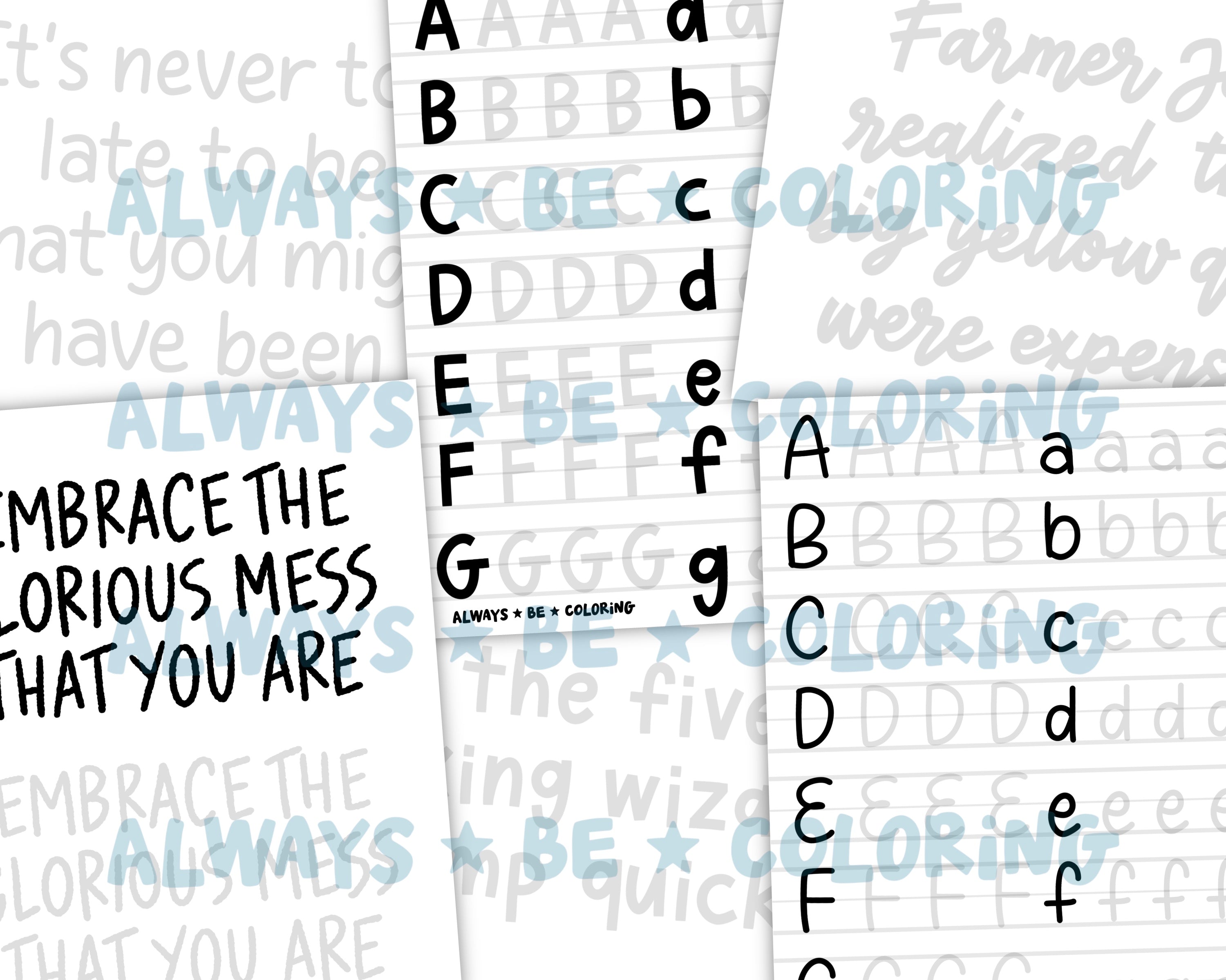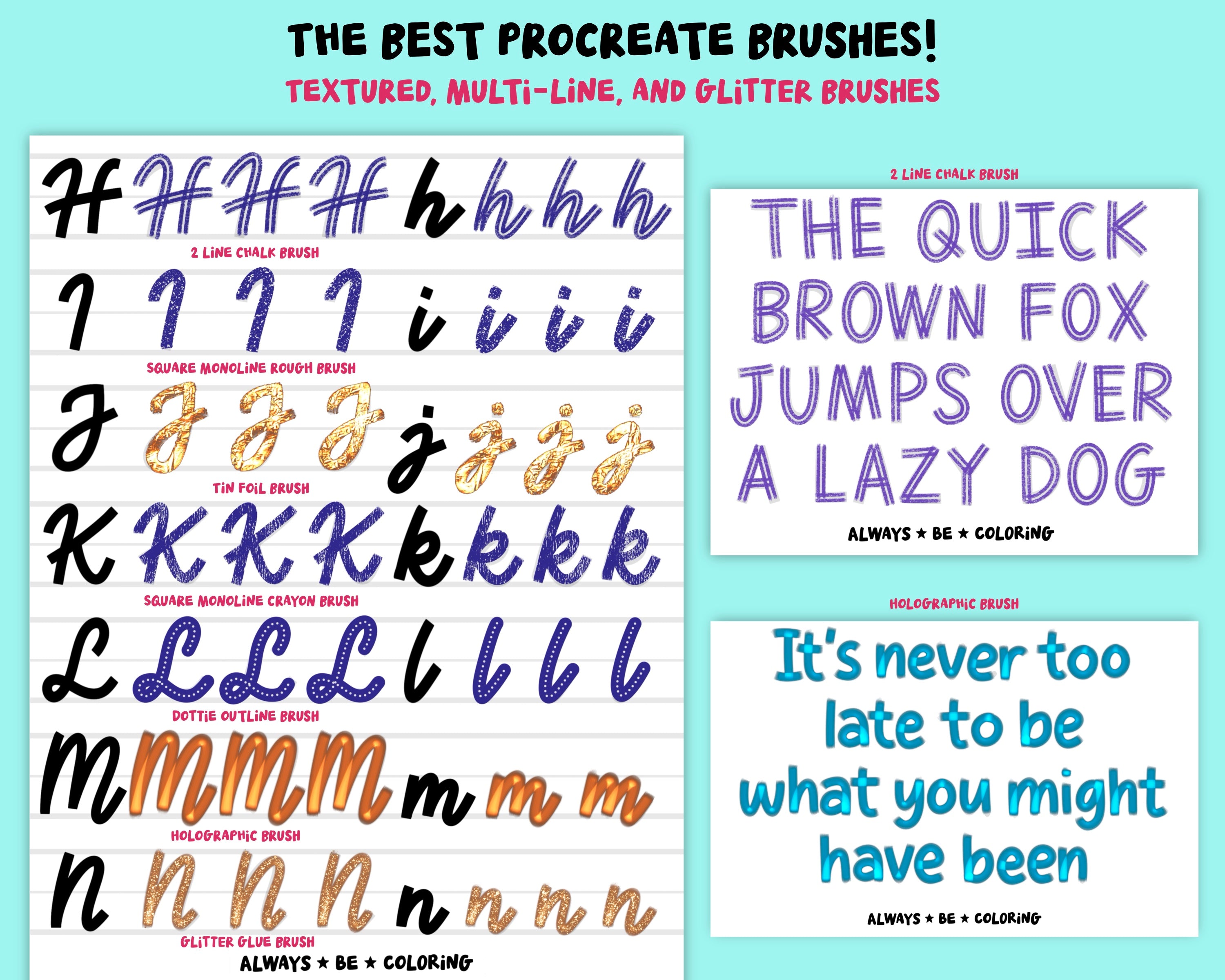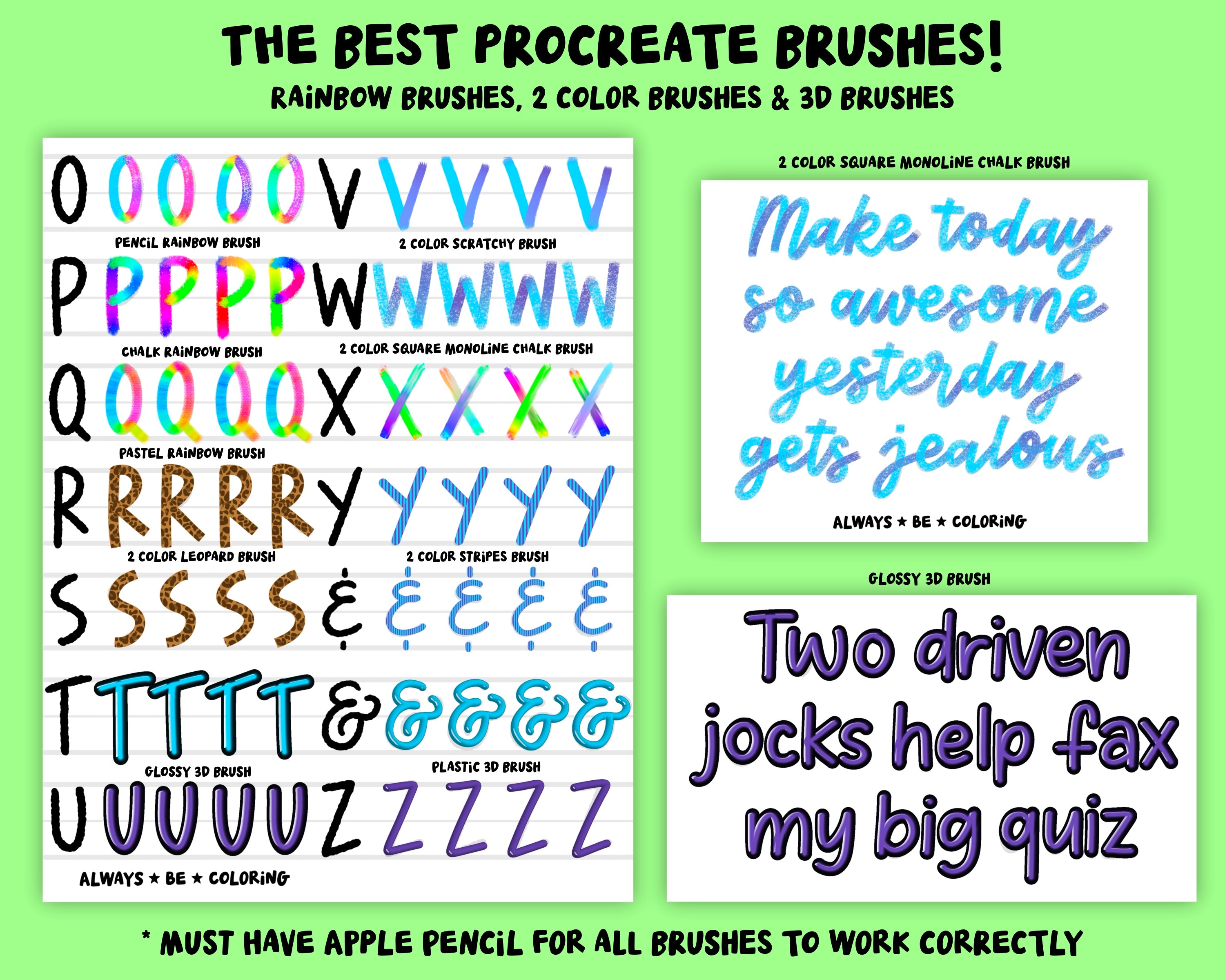 Introducing the Handwriting Styles Lettering Practice Workbook! 30 handwriting practice worksheets with uppercase and lowercase alphabets, pangrams and uplifting quotes. Plus 20 awesome Procreate brushes including textured brushes, glitter brushes, multi-line brushes, rainbow brushes and 3D brushes. This set has 4 styles of unique handwriting - a bubbly class notes style, rockstar cursive lettering, neat square monoline print, and sketchy uppercase style. Each style has alphabets, pangrams and quotes practice worksheets.