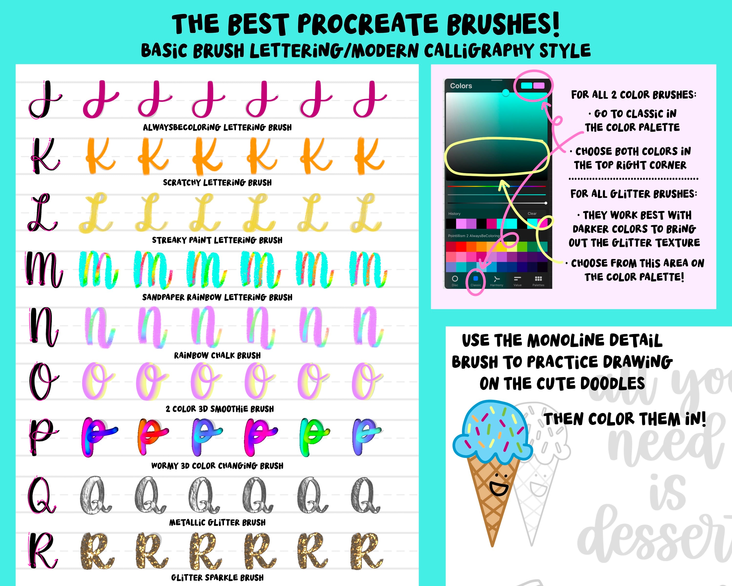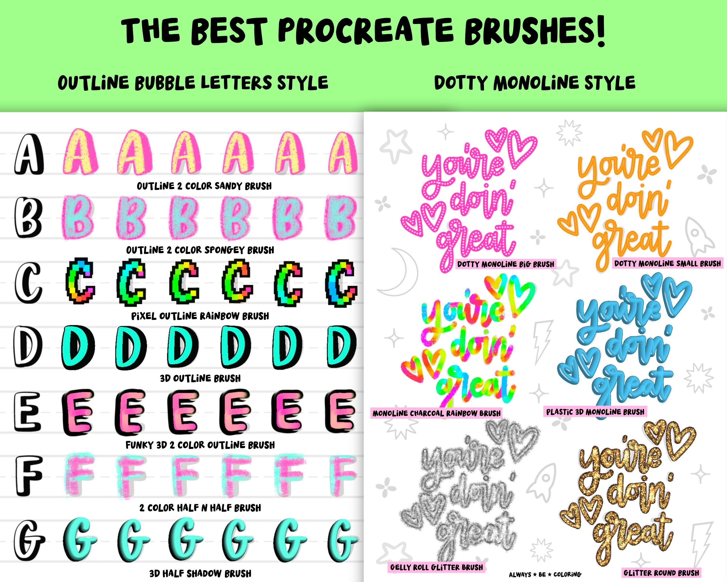 Just for Kids Lettering Practice Workbook by AlwaysBeColoring! 30 lettering practice worksheets and 25 awesome Procreate brushes - for kids of all ages! The set includes 3 styles of lettering - modern calligraphy brush lettering, outline bubble letters and dotty monoline lettering! Each style has uppercase and lowercase letter worksheets, plus pages of fun quotes to practice too! There are funny kid friendly quotes and uplifting phrases, and super cute doodles to practice drawing and coloring in. Plus 25 of the MOST FUN Procreate lettering brushes including textured brushes, 3D brushes, dual color brushes, glitter brushes, outline brushes, and rainbow color changing brushes!