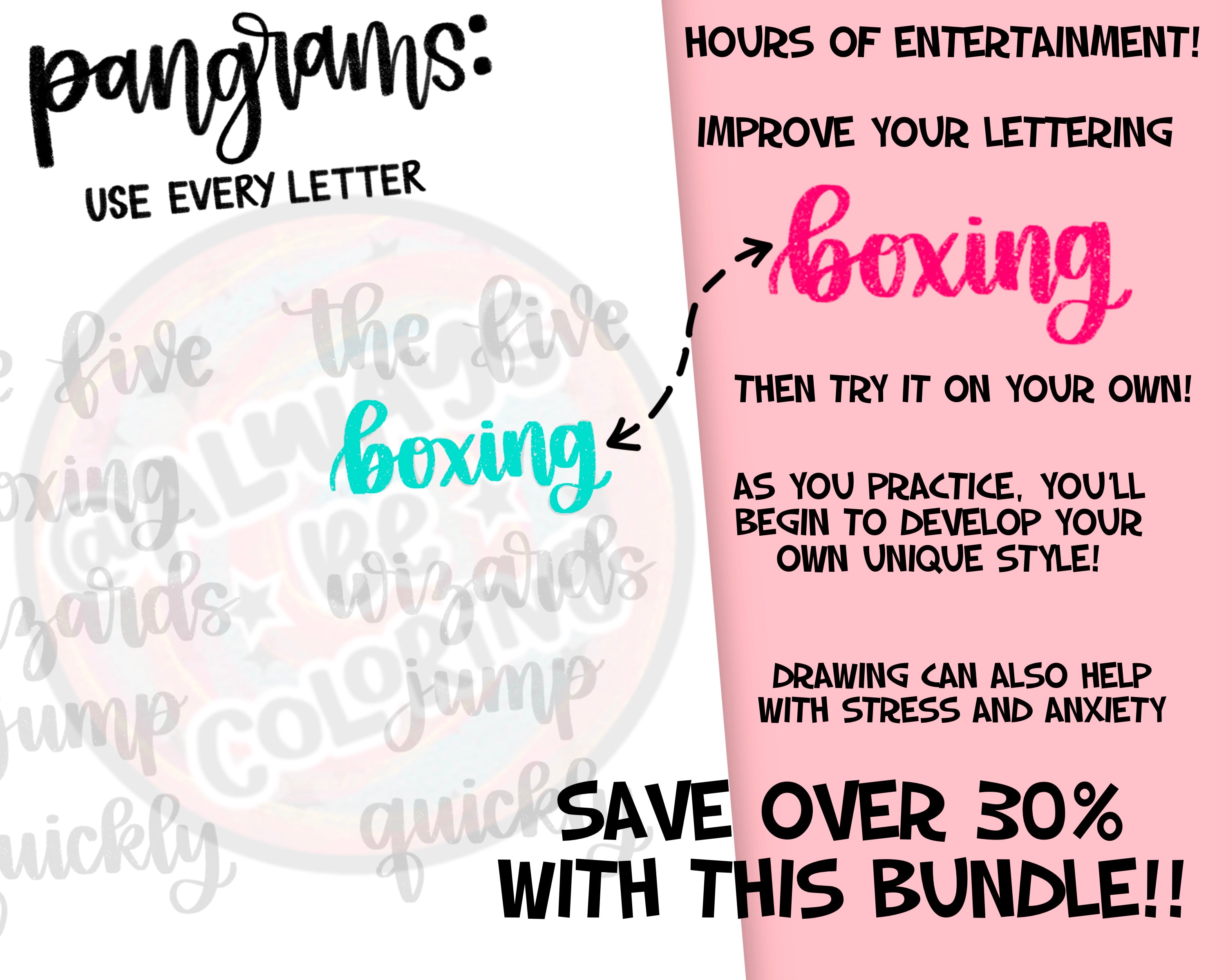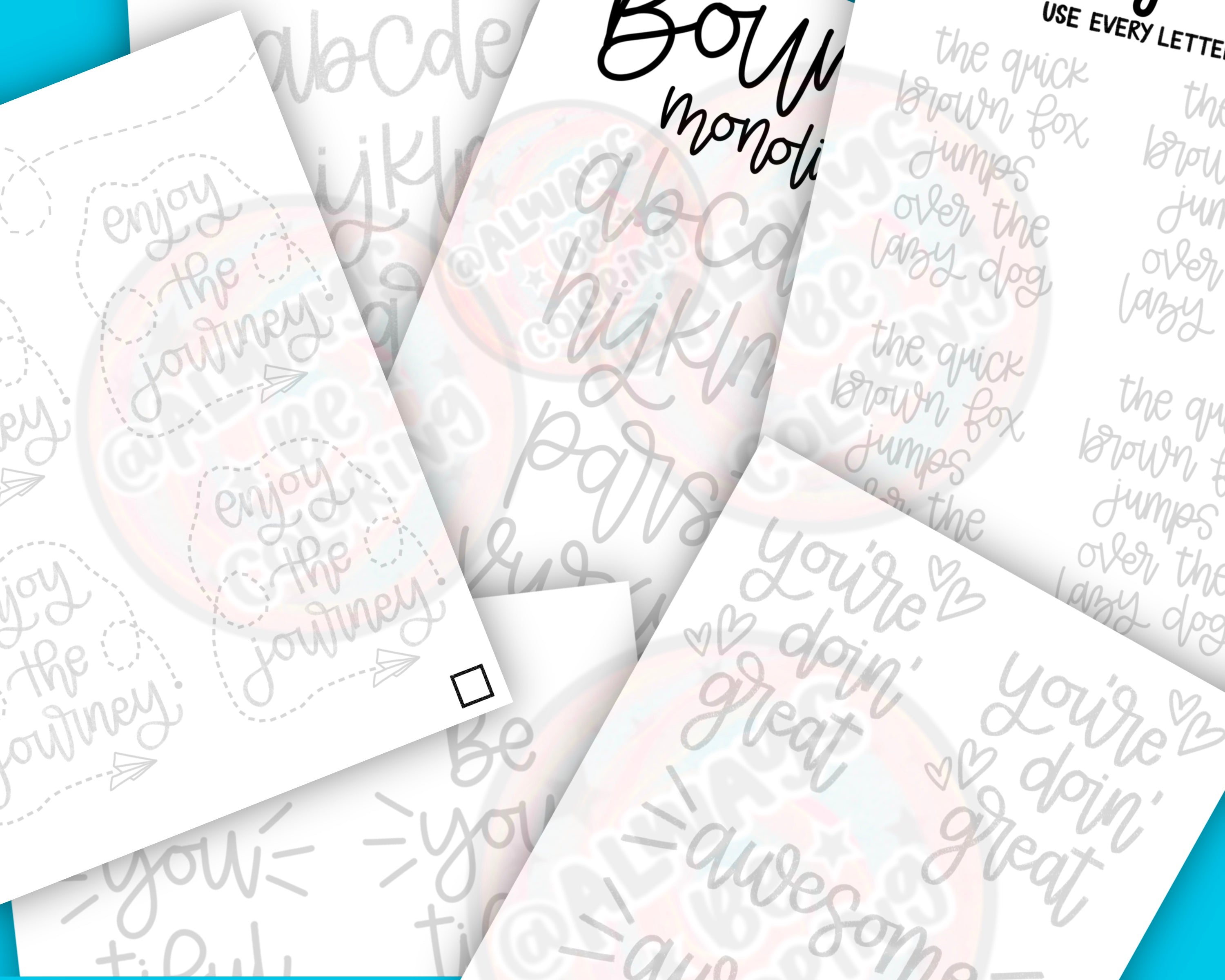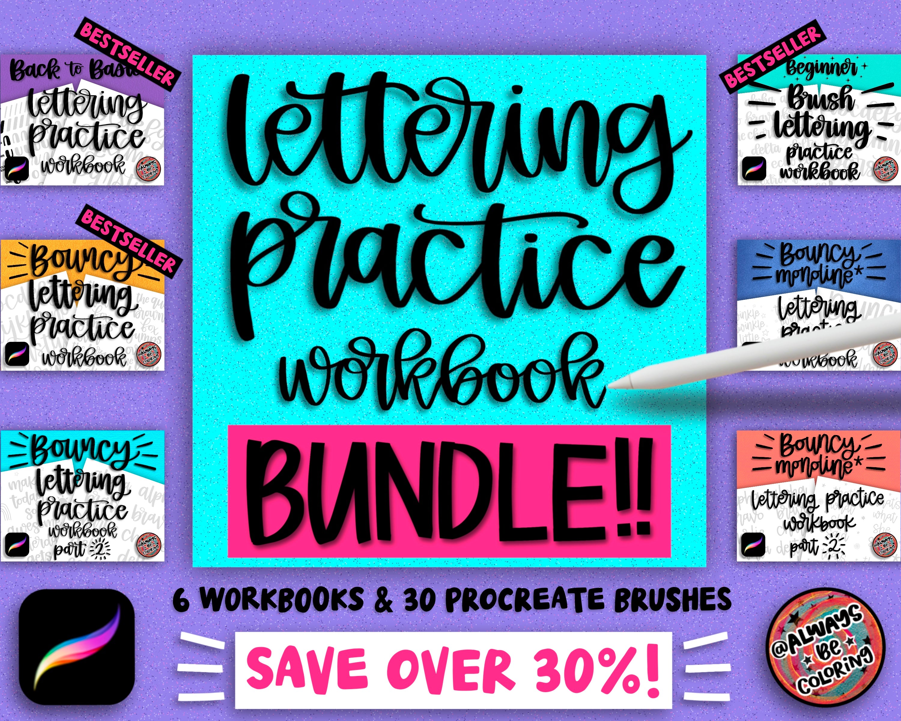 Bestseller!! Huge Lettering Workbook Bundle!! It includes 6 complete Lettering Practice Workbooks, plus 40 amazing Procreate brushes that I guarantee you’re going to love, including the perfect lettering brushes, textured brushes, monoline brushes, 3d brushes, rainbow brushes and glitter brushes!! It also includes PDF files with every worksheet that you can print out at home and letter using brush markers. Practice your hand lettering and modern calligraphy. Alphabet worksheets, quotes, & pangrams. Instant Digital Download!