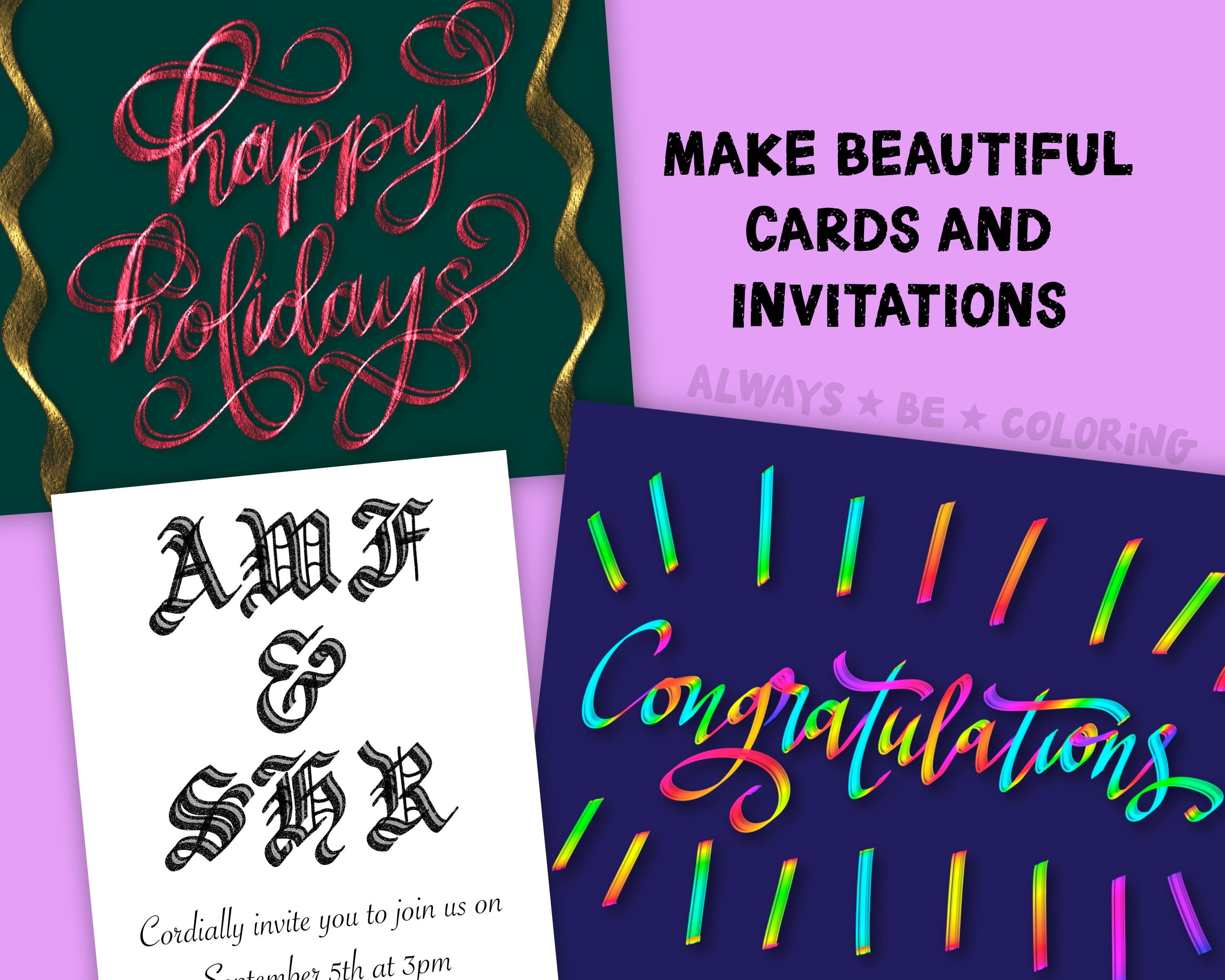 Introducing the Procreate Blackletter Calligraphy Brush Set by AlwaysBeColoring! 75 flat pen calligraphy brushes including ink brushes, textured brushes, 2 color brushes, metallic brushes and rainbow color changing brushes! Plus 5 Blackletter calligraphy practice worksheets and a bonus color palette for the metallic brushes! Make gorgeous cards and invitations, or impress your friends with an intricate instagram post! These brushes are all angled so you automatically get the look of old timey Blackletter calligraphy, sometimes also referred to as gothic calligraphy. They are easy to use and meant for any skill level!