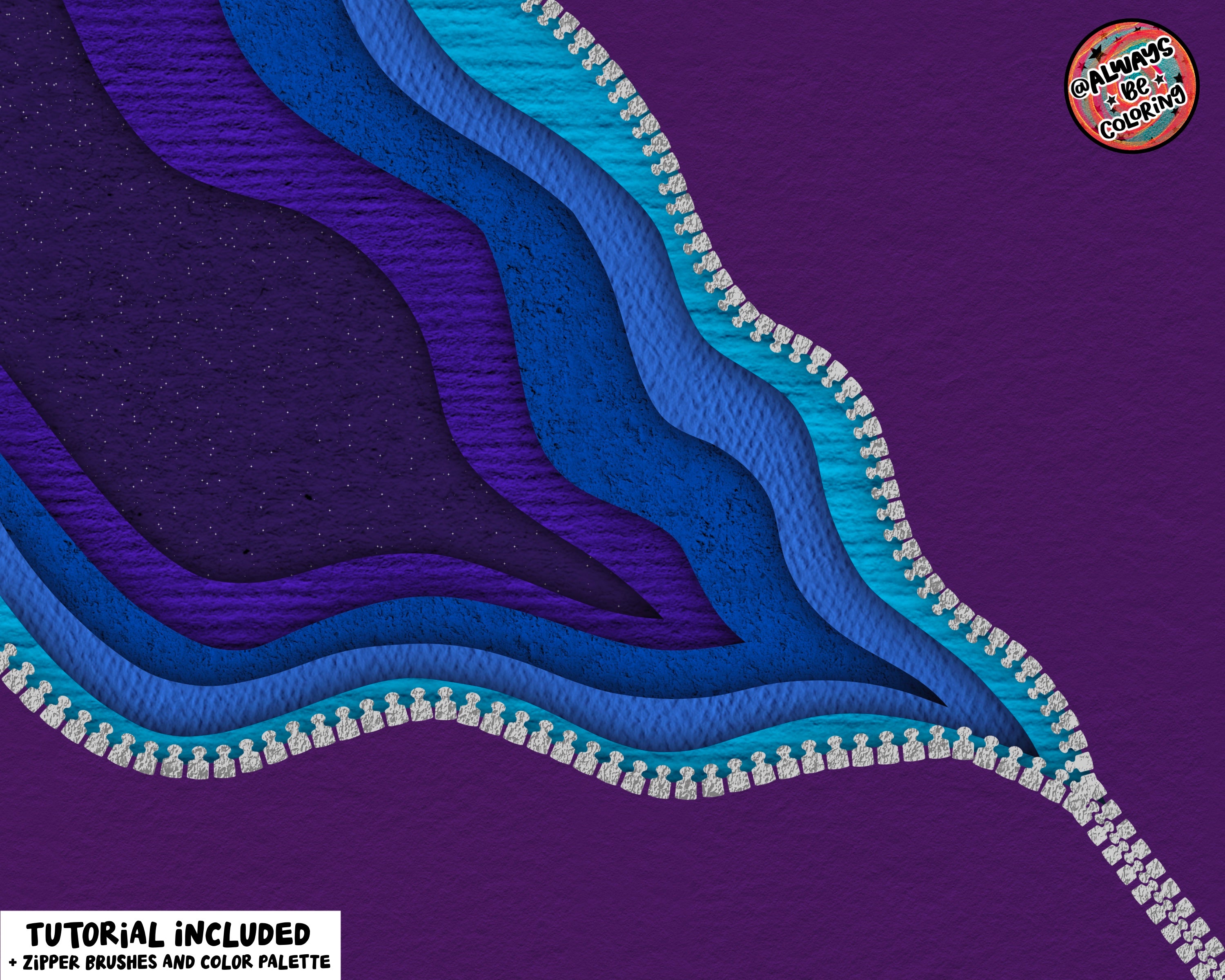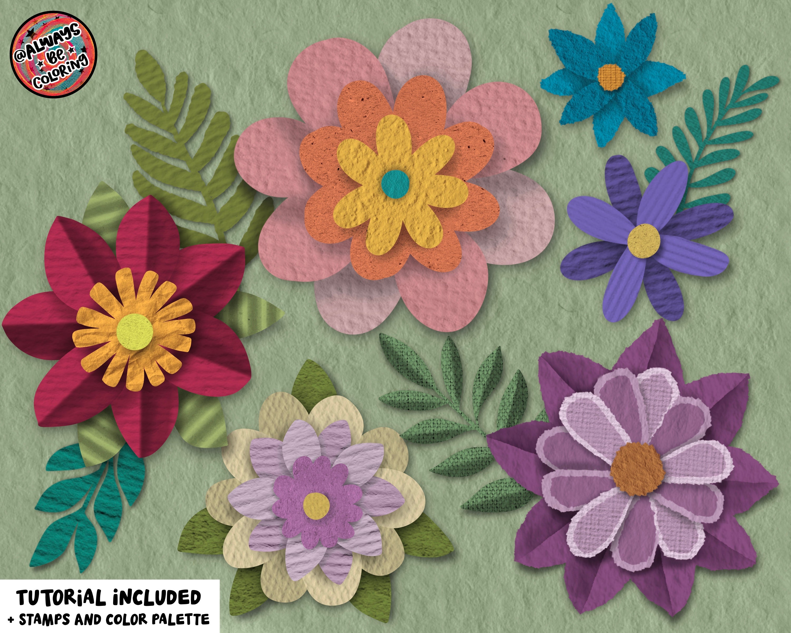 Other tutorials include how to make layered cut paper flowers, which I’ve included stamps and a color palette. Plus how to make a cool unzipped universe scene with a color palette and special zipper brushes included! And there’s a total of 8 color palettes to inspire you!