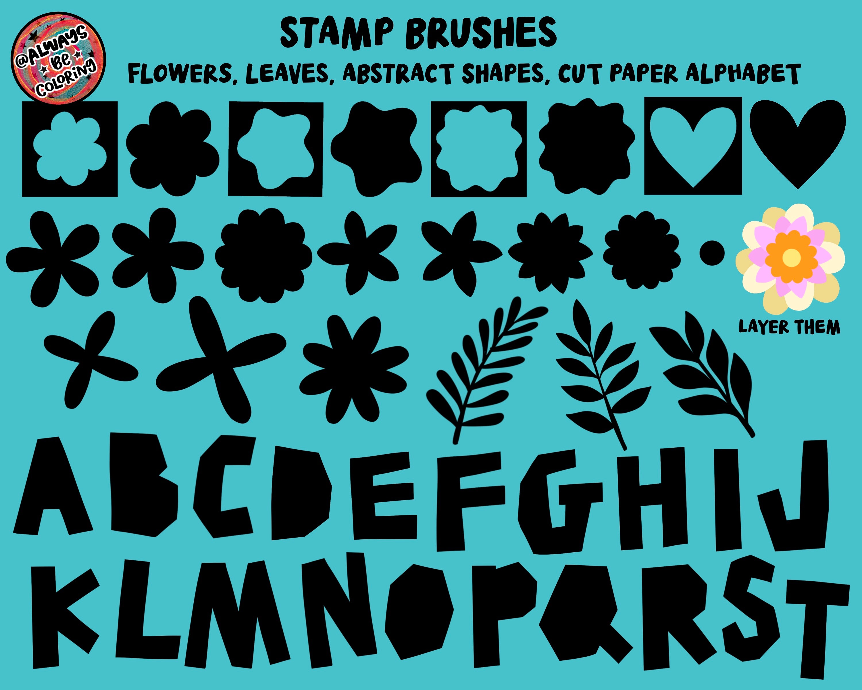 Introducing the Procreate Paper Cut Brush Set - 170+ brushes, stamps, and paper textures, 8 color palettes and a user guide with 3 step by step tutorials. This set has everything you need to create super realistic cut paper digital artwork! Brushes include drawing and shading brushes, rough paper edge and decorative scalloped and zigzag paper edge brushes, washi tape brushes, and more! There are over 80 brand new paper texture overlay brushes, including construction paper, handmade paper, watercolor paper, kraft paper, recycled paper, cardboard, and crumpled paper. Then there are 60 hand drawn stamps with flowers, leaves, abstract shapes and a full cut paper alphabet.