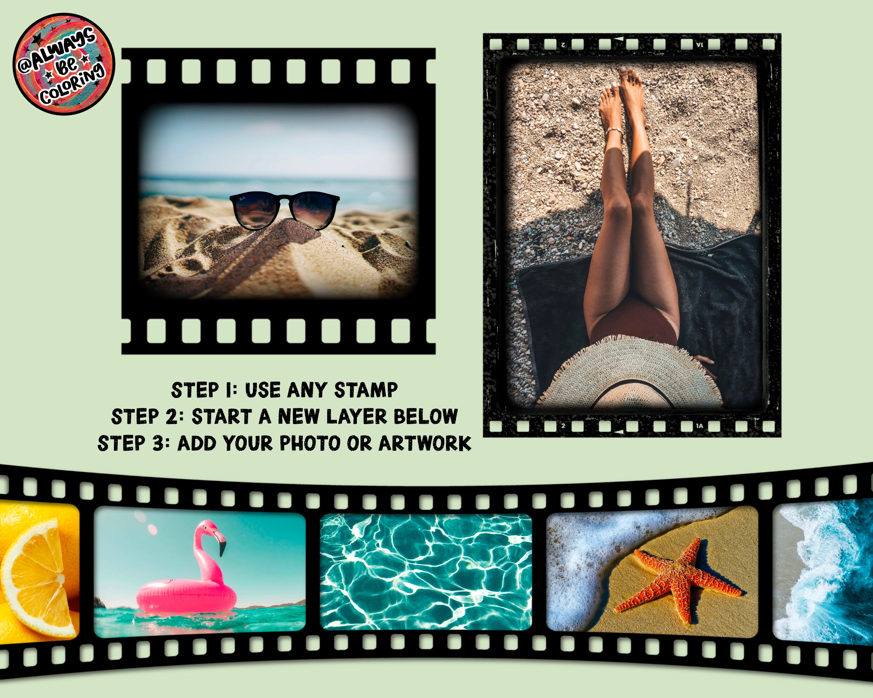 AlwaysBeColoring, procreate film strip brushes, procreate film stamps, film strip stamp procreate, photo frame brushes, vintage film procreate, procreate photo frames, distressed film stamps, procreate frame stamps, procreate scrapbooking stamps, digital journaling brushes, mood board brushes, procreate collage stamps, vignette procreate brushes, retro photo stamps, film frame brushes, curved film strip procreate, procreate film overlay, vintage frame stamps, procreate stamp pack, digital frame stamps