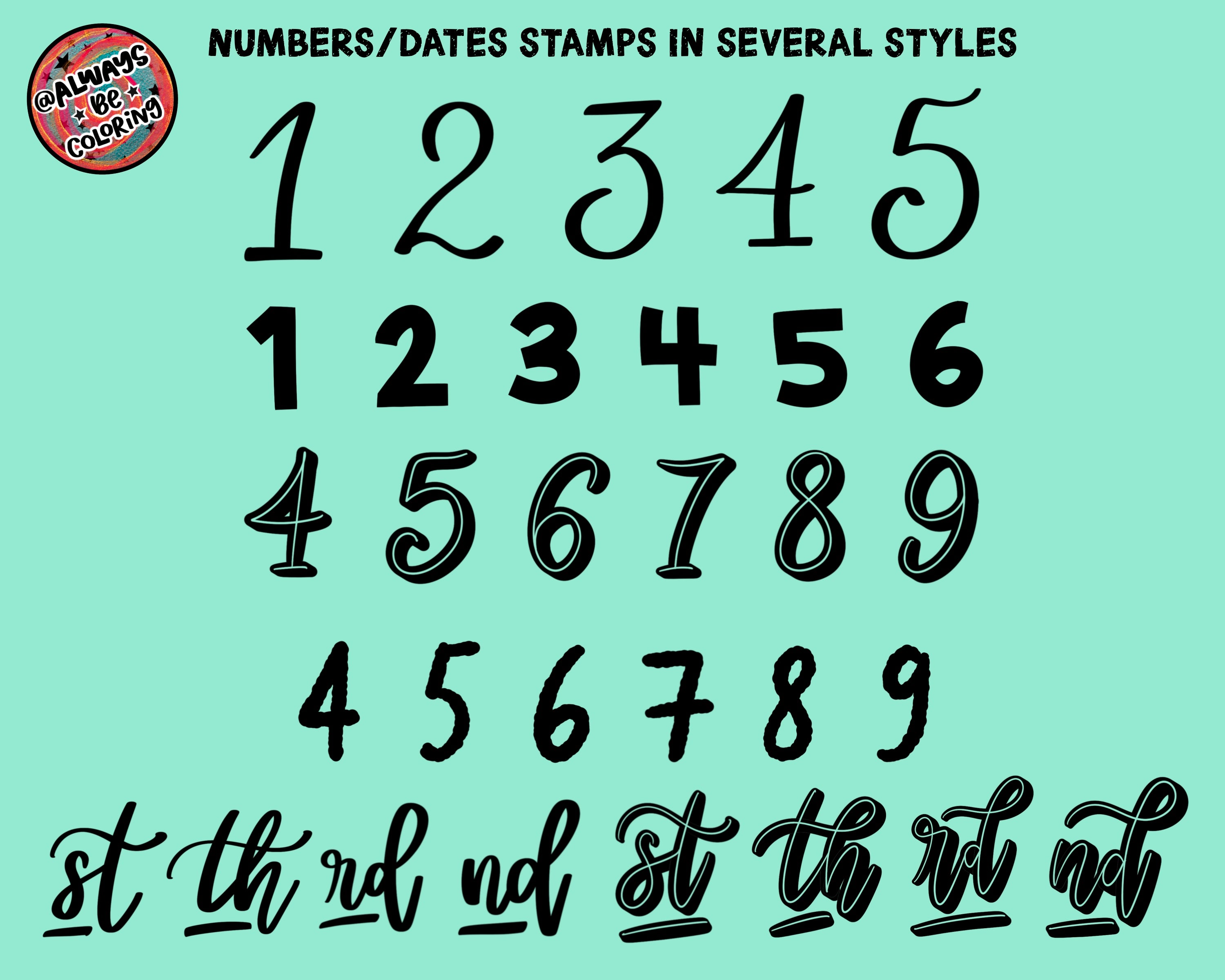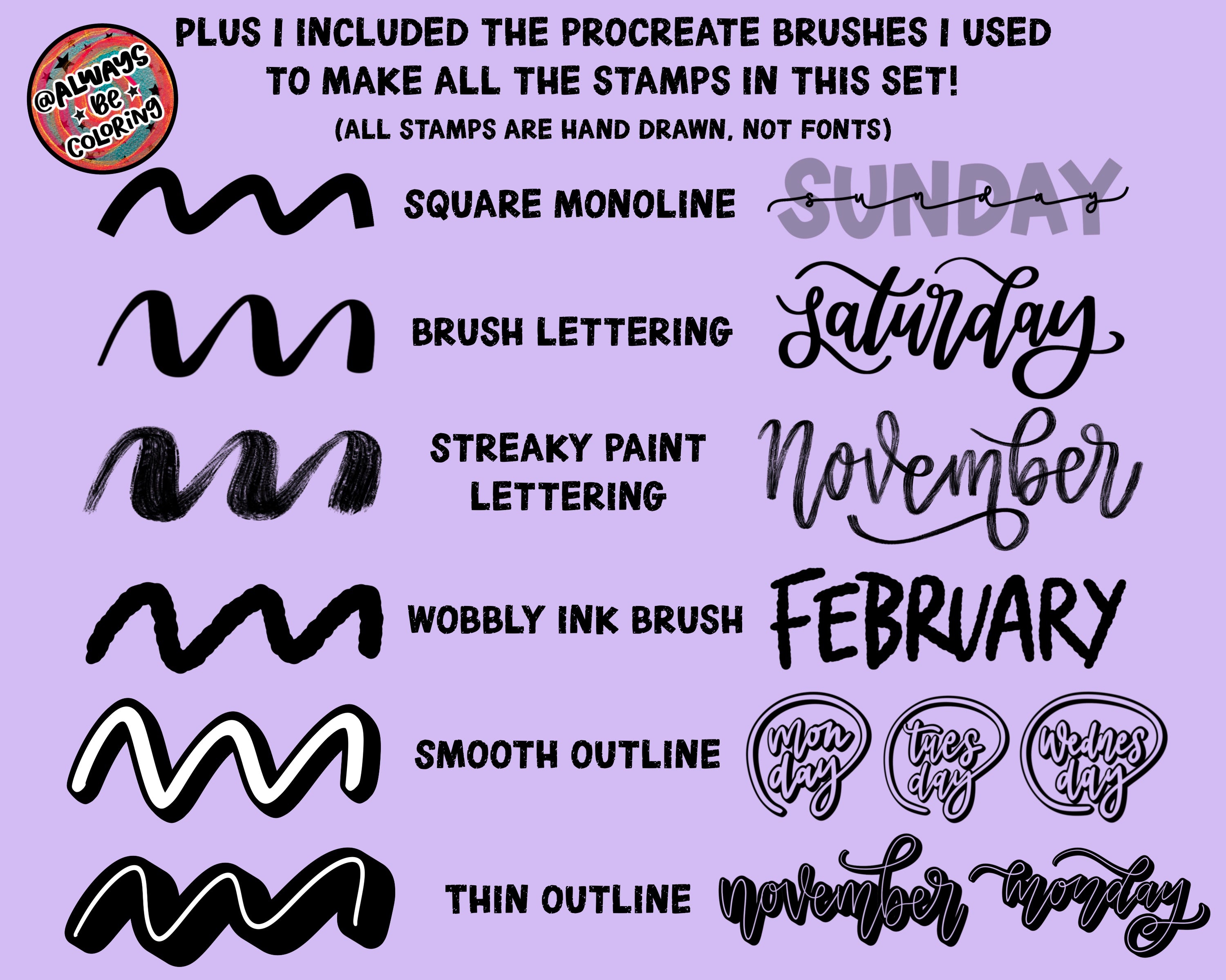 245 Hand Drawn Procreate Bullet Planner Journal Stamps including Numbers/Dates, Months of the Year, and Days of the Week! There are many different styles to choose from including elegant calligraphy, bouncy brush lettering, fancy flourish lettering, sketchy handwriting style, bold block letters, circled style words, outline lettering and a block lettering/monoline cursive combo style. The set also includes other essential bullet planner stamps to make creating easier than ever! There are blank calendar and habit tracker stamps, plus 4 different styles of weekly layout stamps to help with your designs. As a special bonus, I’ve included all the Procreate Brushes that I used to make all the stamps in this set! All the stamps are hand lettered, they are not fonts! The brushes include a square monoline brush, a pressure sensitive brush lettering calligraphy brush, streaky paint lettering brush, a wobbly ink brush and 2 outline brushes.