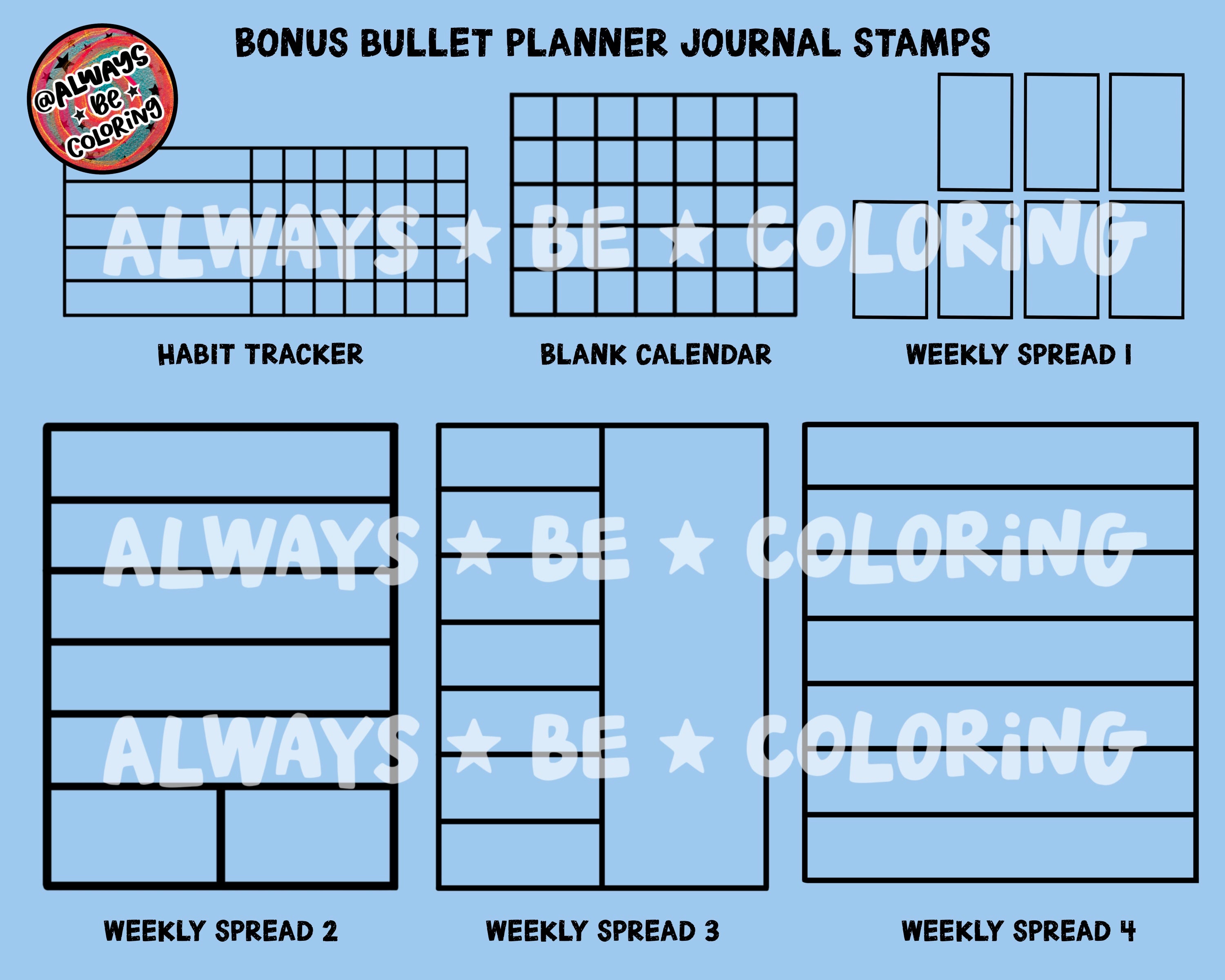 Use the stamps and brushes in this set to easily create beautiful bullet planner layouts and personalized calendars. You can then print them out or use them digitally to creatively plan your future!