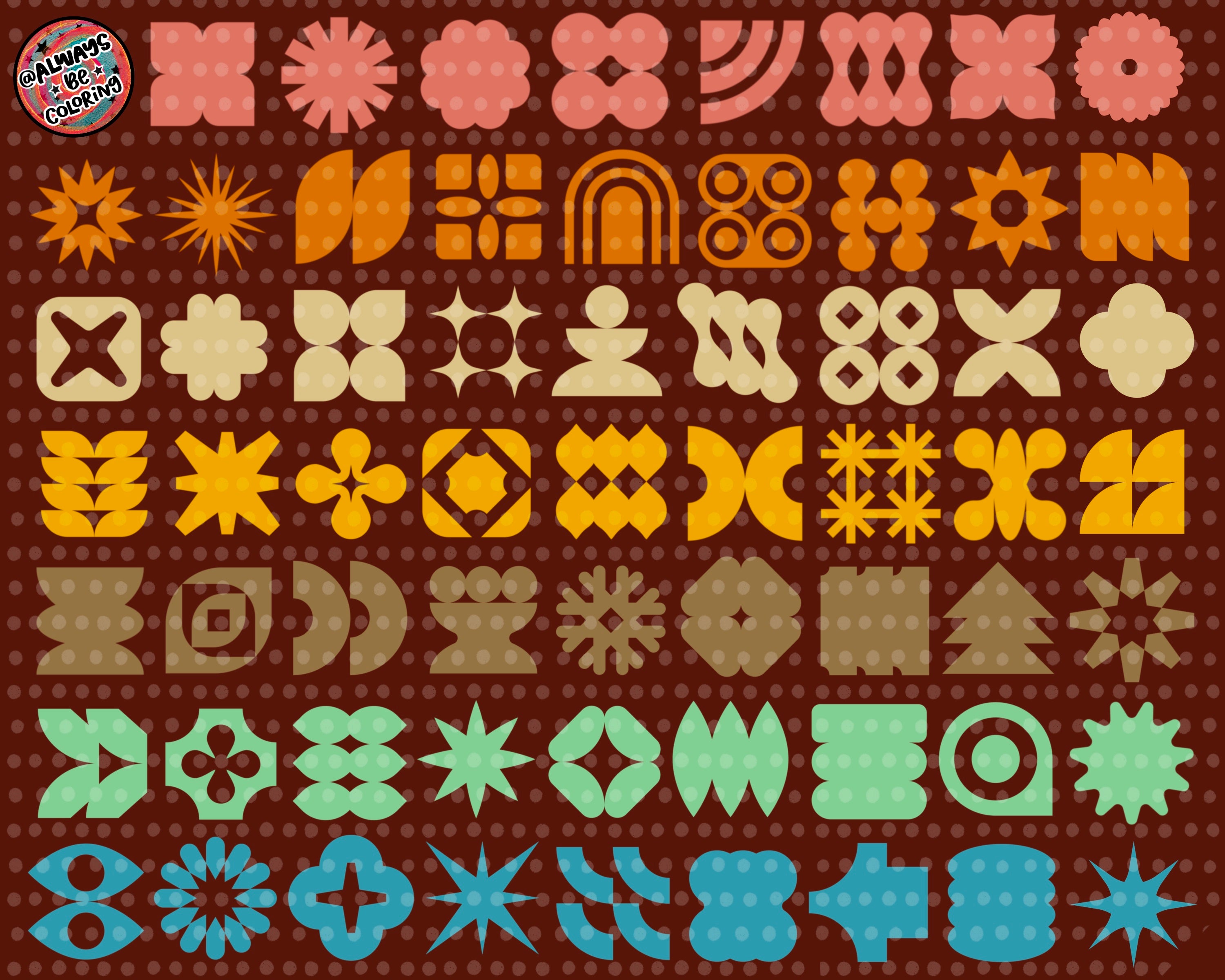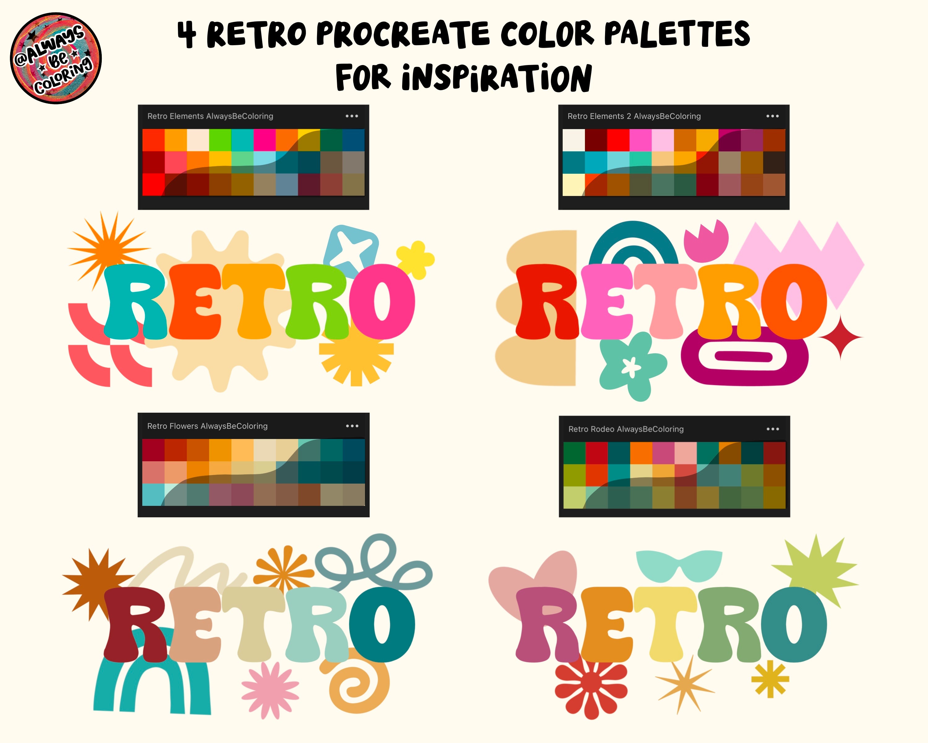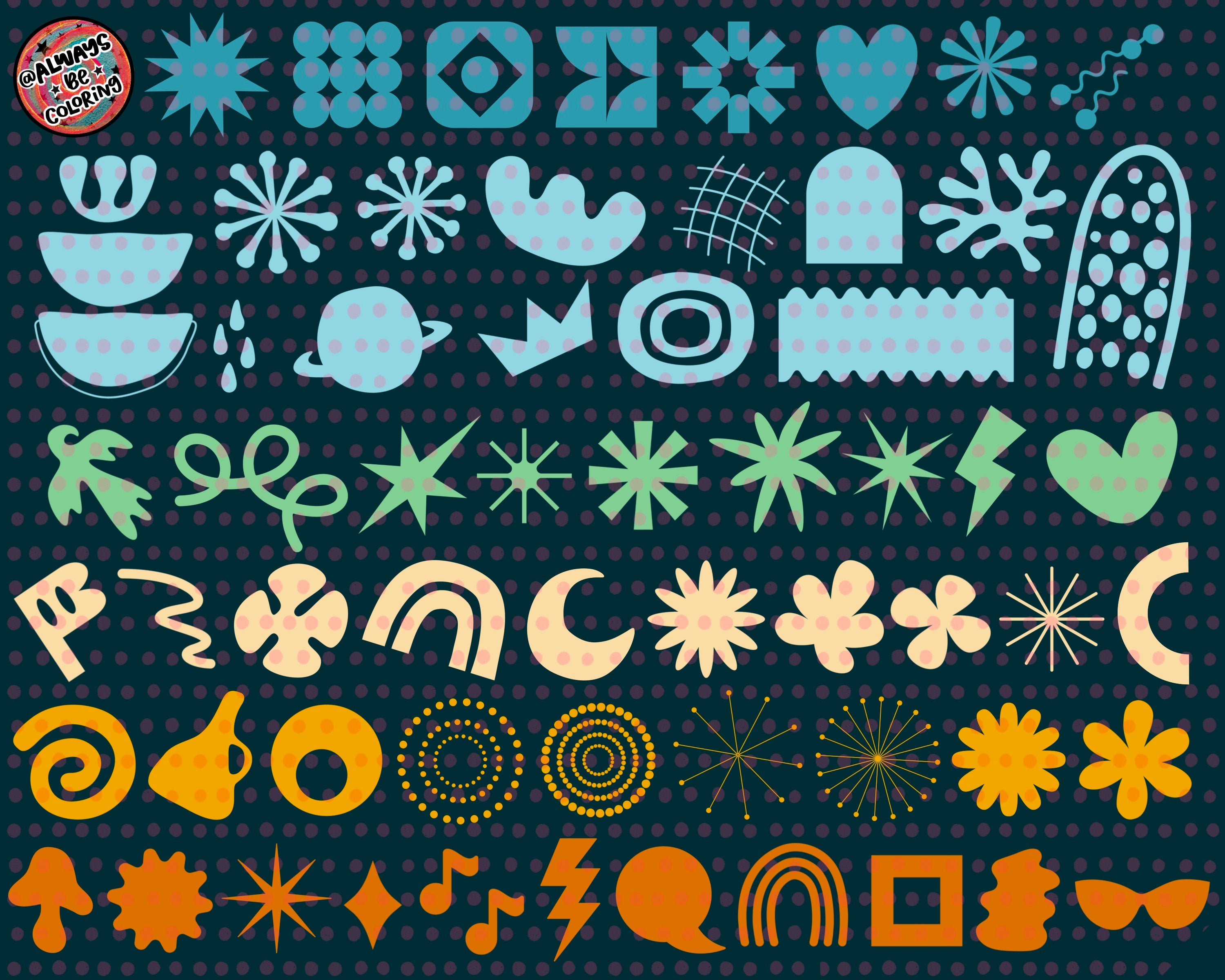 Keywords: Procreate Stamp Set, Procreate Retro Stamp Bundle, Procreate Flower Stamps, Procreate Stars, Procreate Shapes, Retro Color Palettes, Procreate Color Palettes, Procreate Doodles
