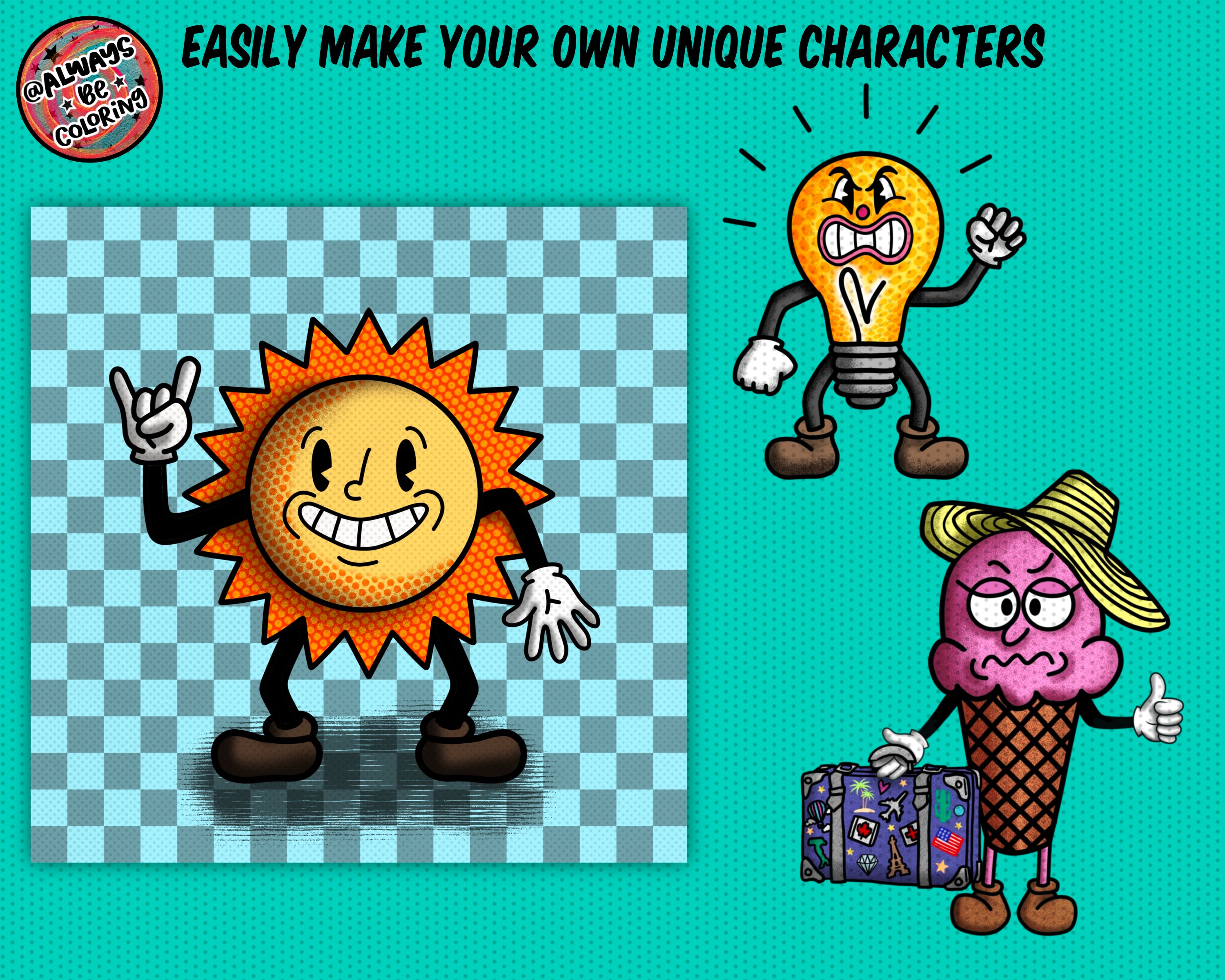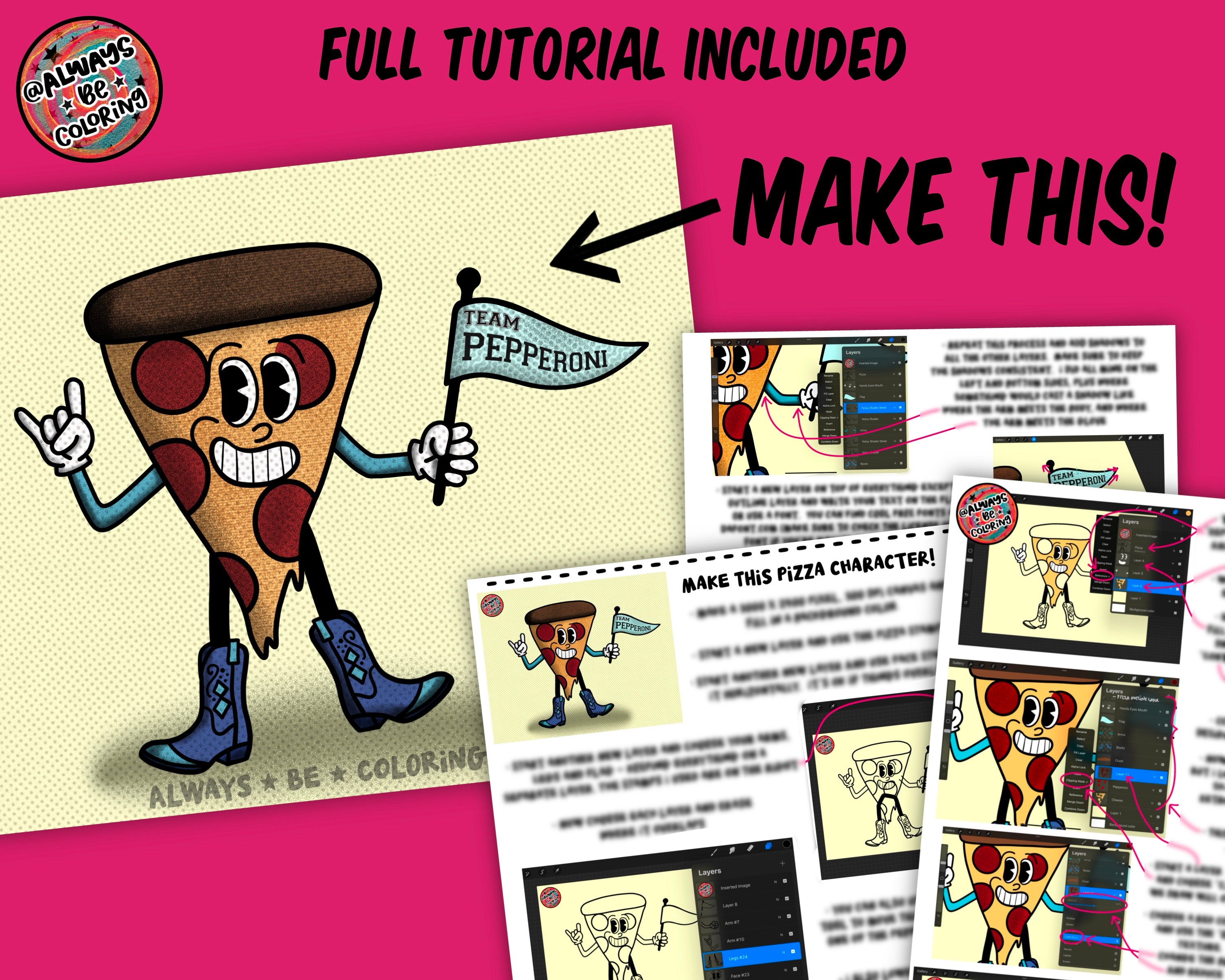 Introducing the Procreate Retro Mascot Character Maker Brush and Stamp Set! 280 Procreate Stamps with Unique Hand Drawn Character Body Shapes, Faces, Arms and Legs, and Accessories like flags, foam fingers, sunglasses, purses, hats, skateboards, umbrellas and more! But that’s not all - the set also includes 45 Procreate Shading, Texture, Halftone and Seamless Pattern Brushes to bring your designs to life! I’ve also included a full step by step tutorial for how to make a cool Retro Pizza Character! It’s packed with tips and tricks to help you make the most of the brushes in this set.
