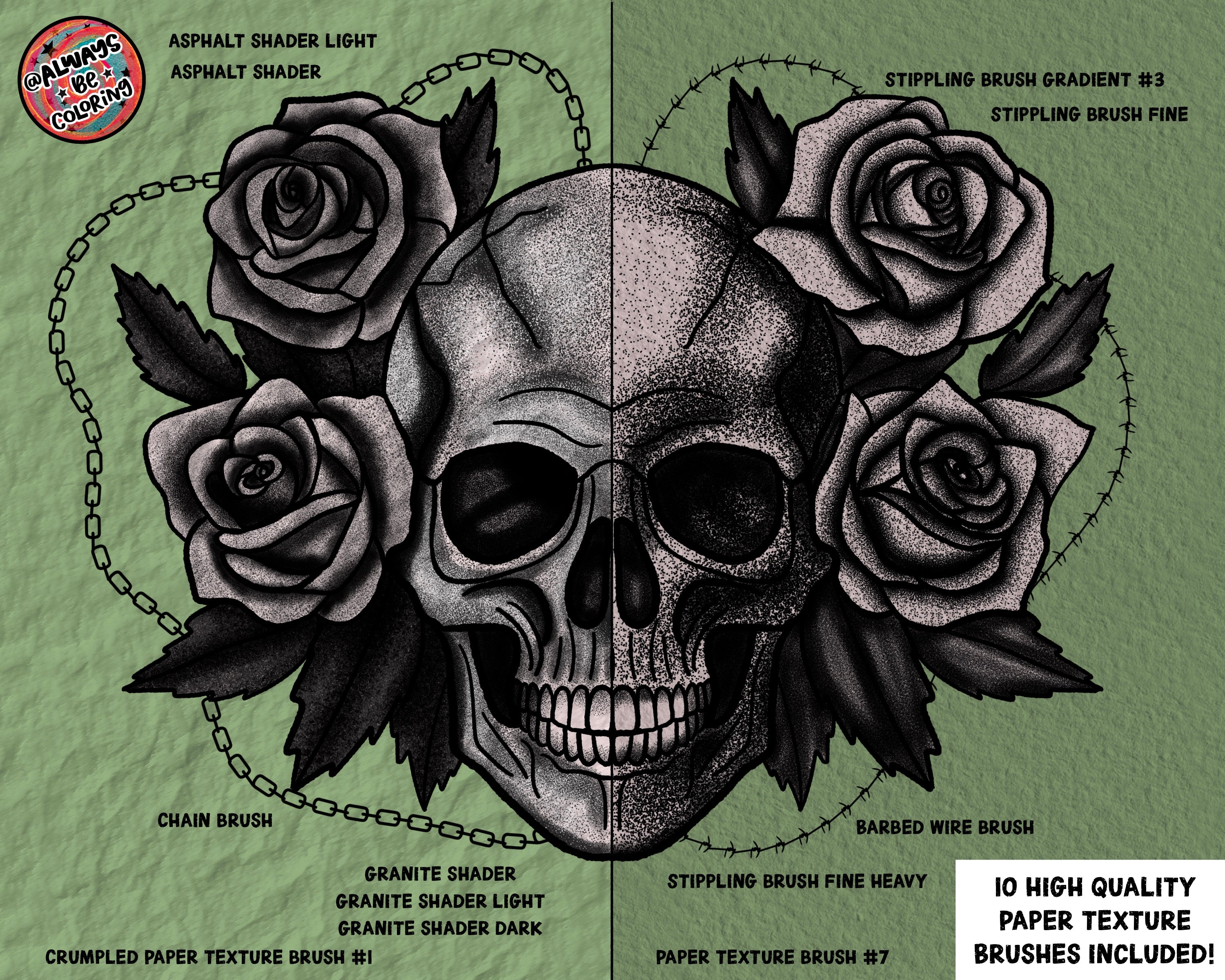 Introducing our new Procreate Tattoo Brush Set, with 170 brushes including inking brushes, shading, stippling, hatching, halftone, lettering, multi-line, and border brushes. Plus 10 high quality paper texture brushes. Save lots of time creating intricate dot work and complex shading. These brushes were crafted with precision and attention to detail, with a diverse range of brushes to bring stunning tattoo designs to life on your digital canvas. They are easy to use for beginners and professional artists alike, and there is a PDF user guide included to make sure you get the most out of the set! Here’s everything that’s included: